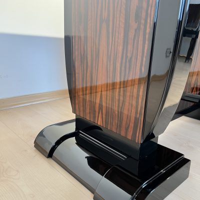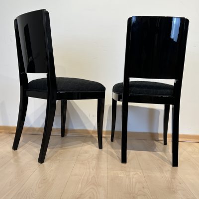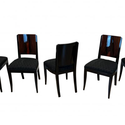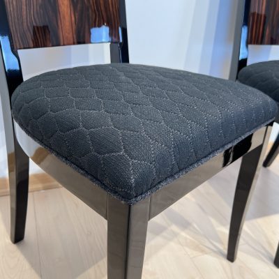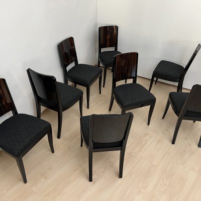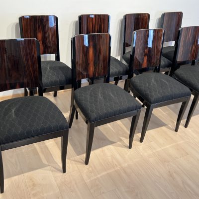 - In a set with eight original chairs also veneered in Macassar (backboard) and black piano lacquer on the frame and backside.