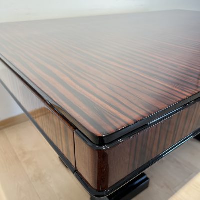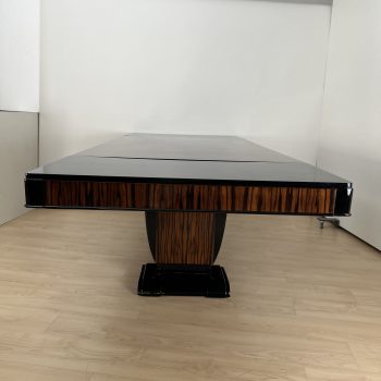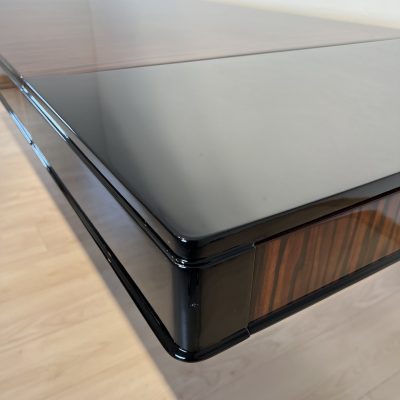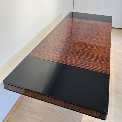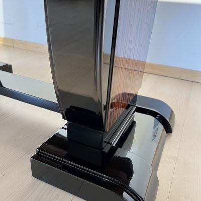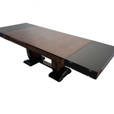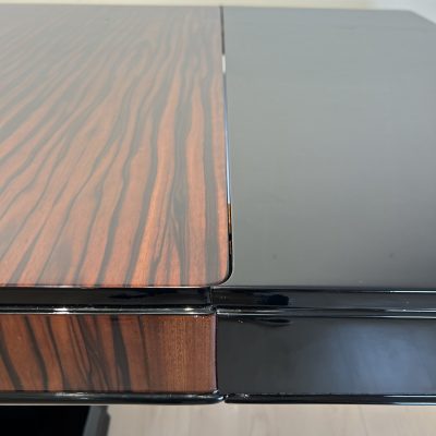 - Extending table in striped Macassar ebony veneer and high-gloss polished clear and black piano lacquer.