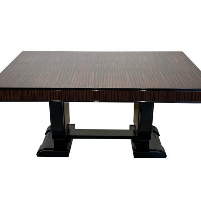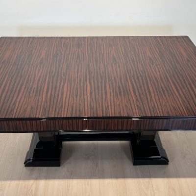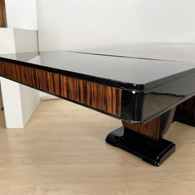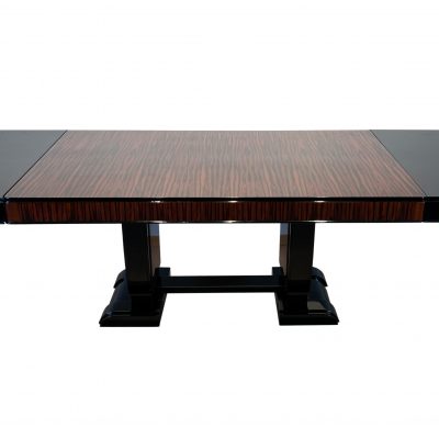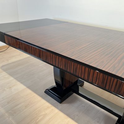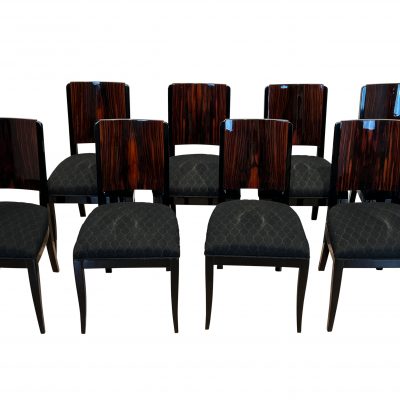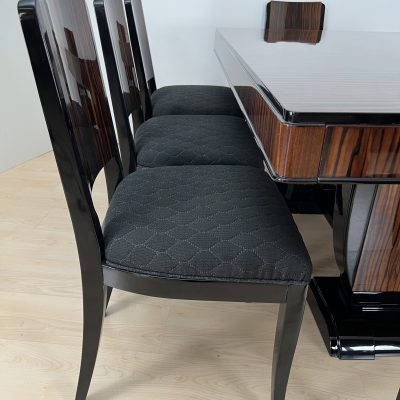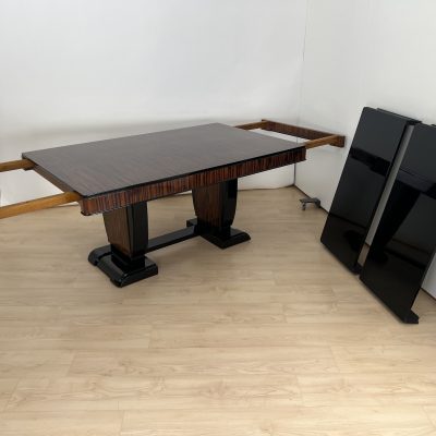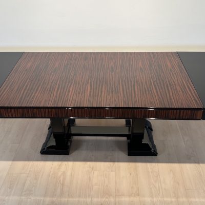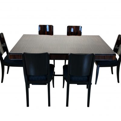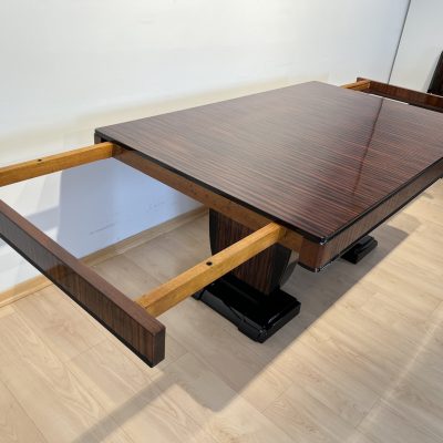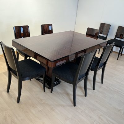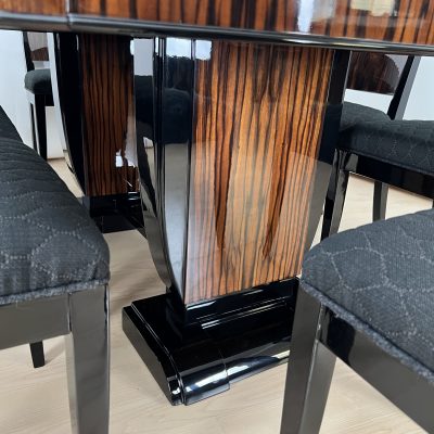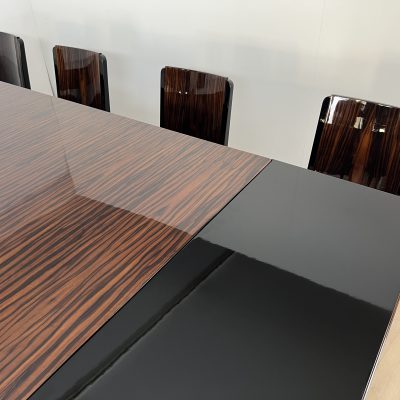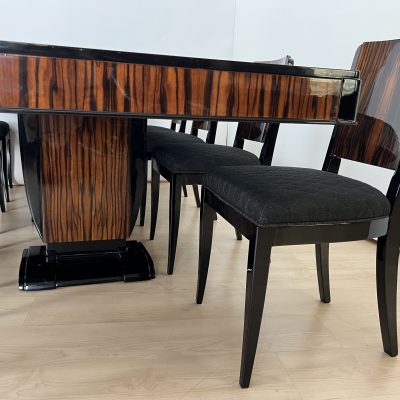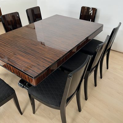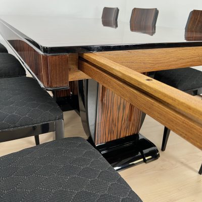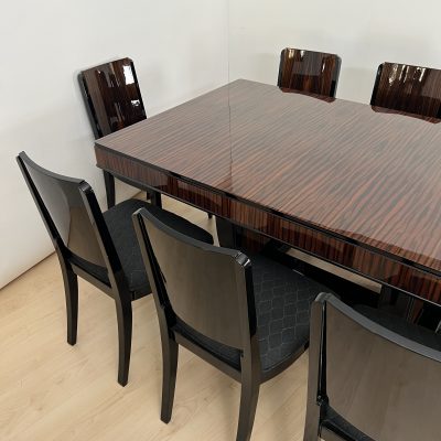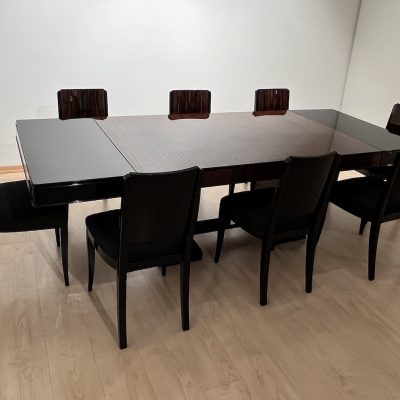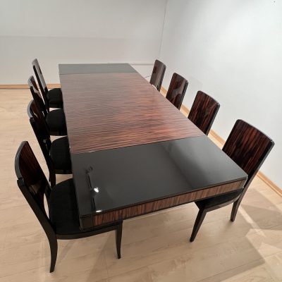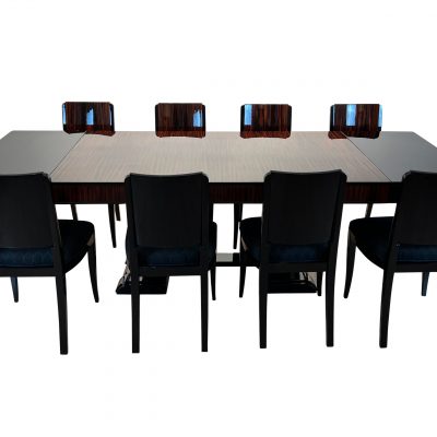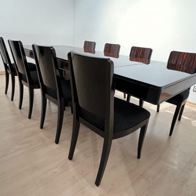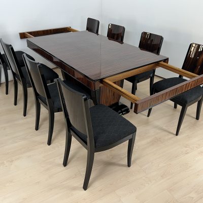 Beautiful original Art Deco dining room set with expandable table and 8 chairs in Macassar ebony veneer and lacquer finish.