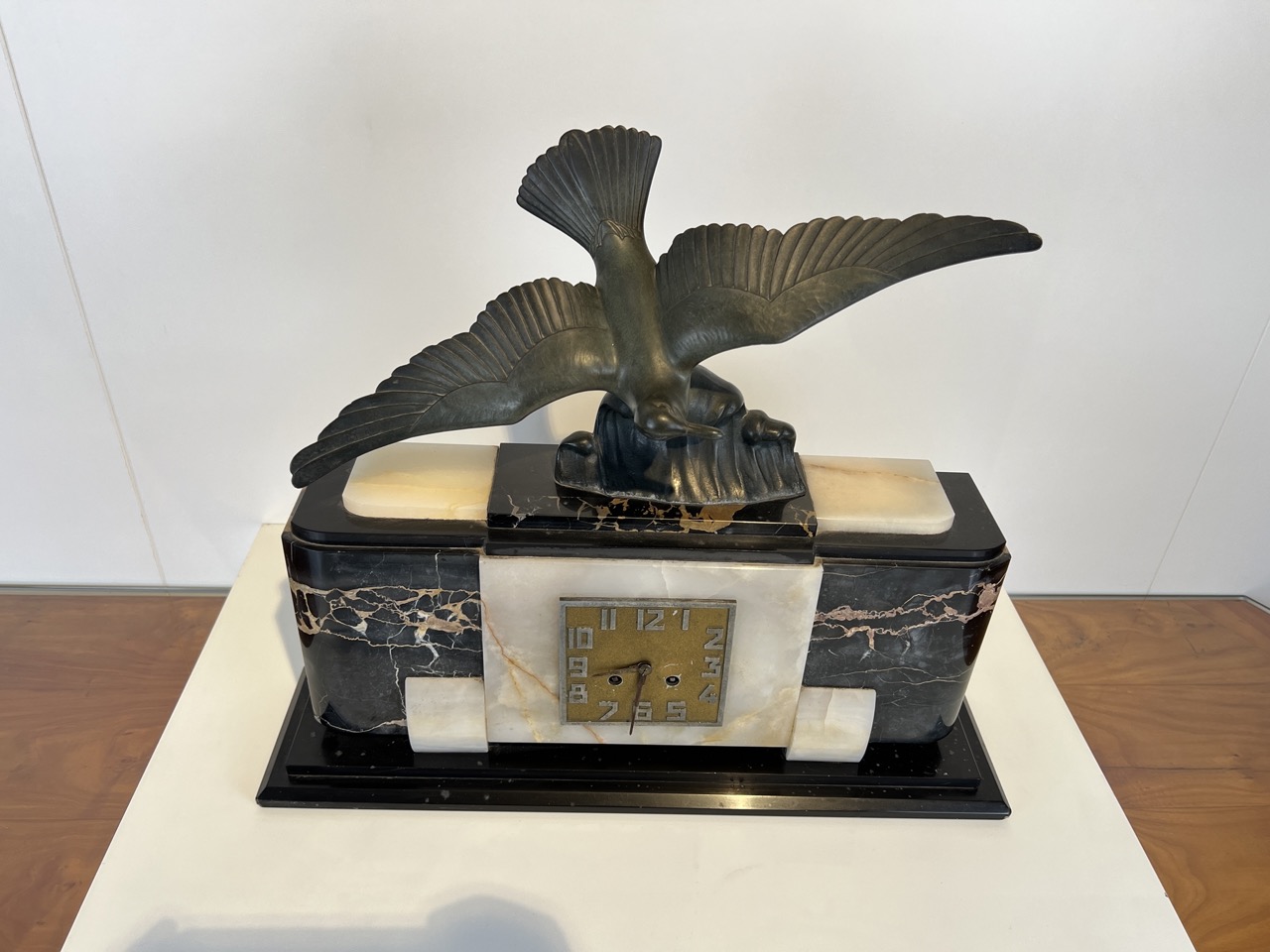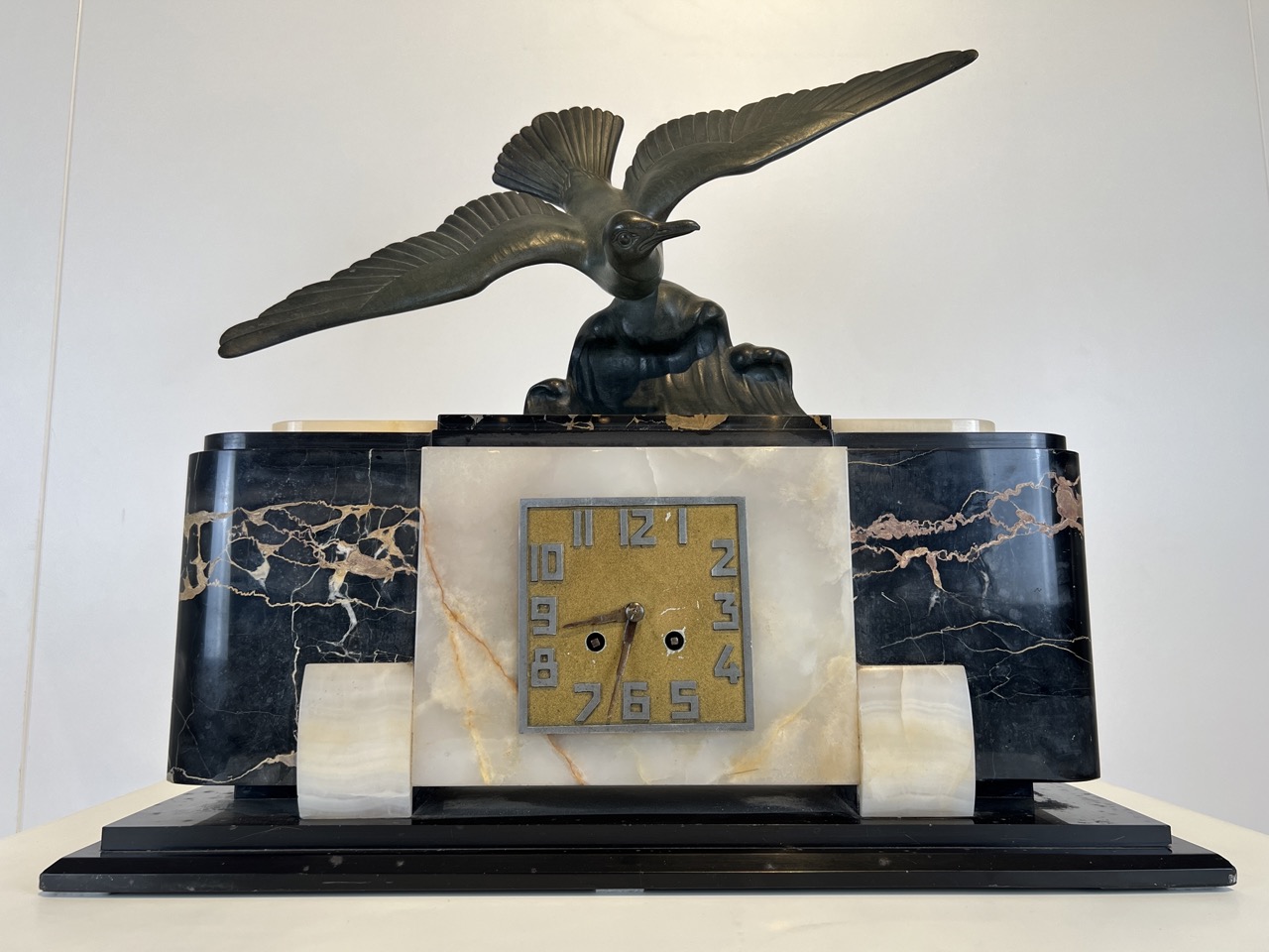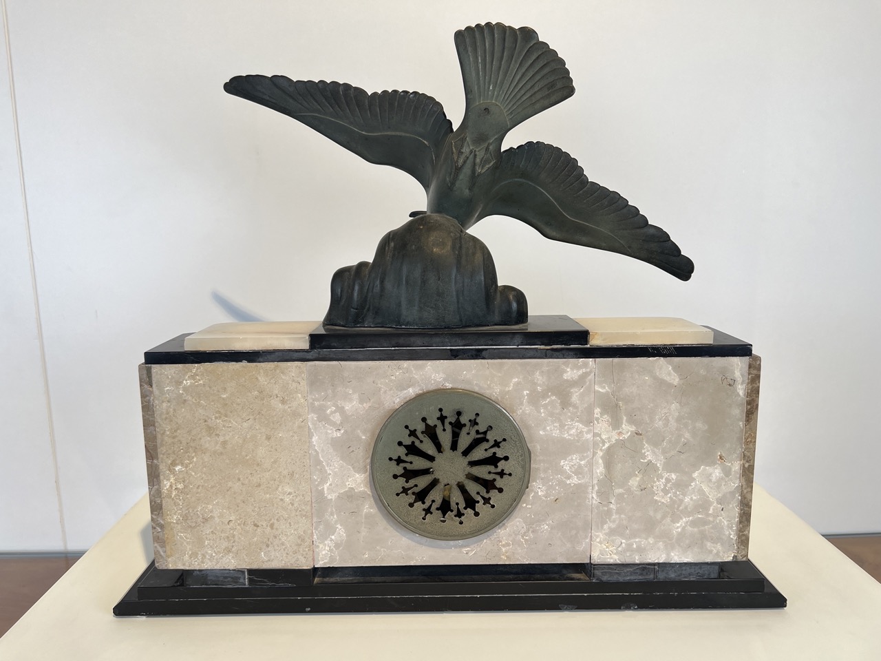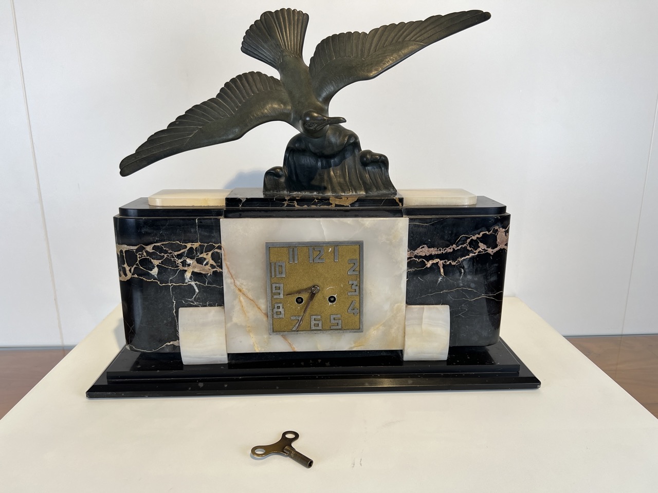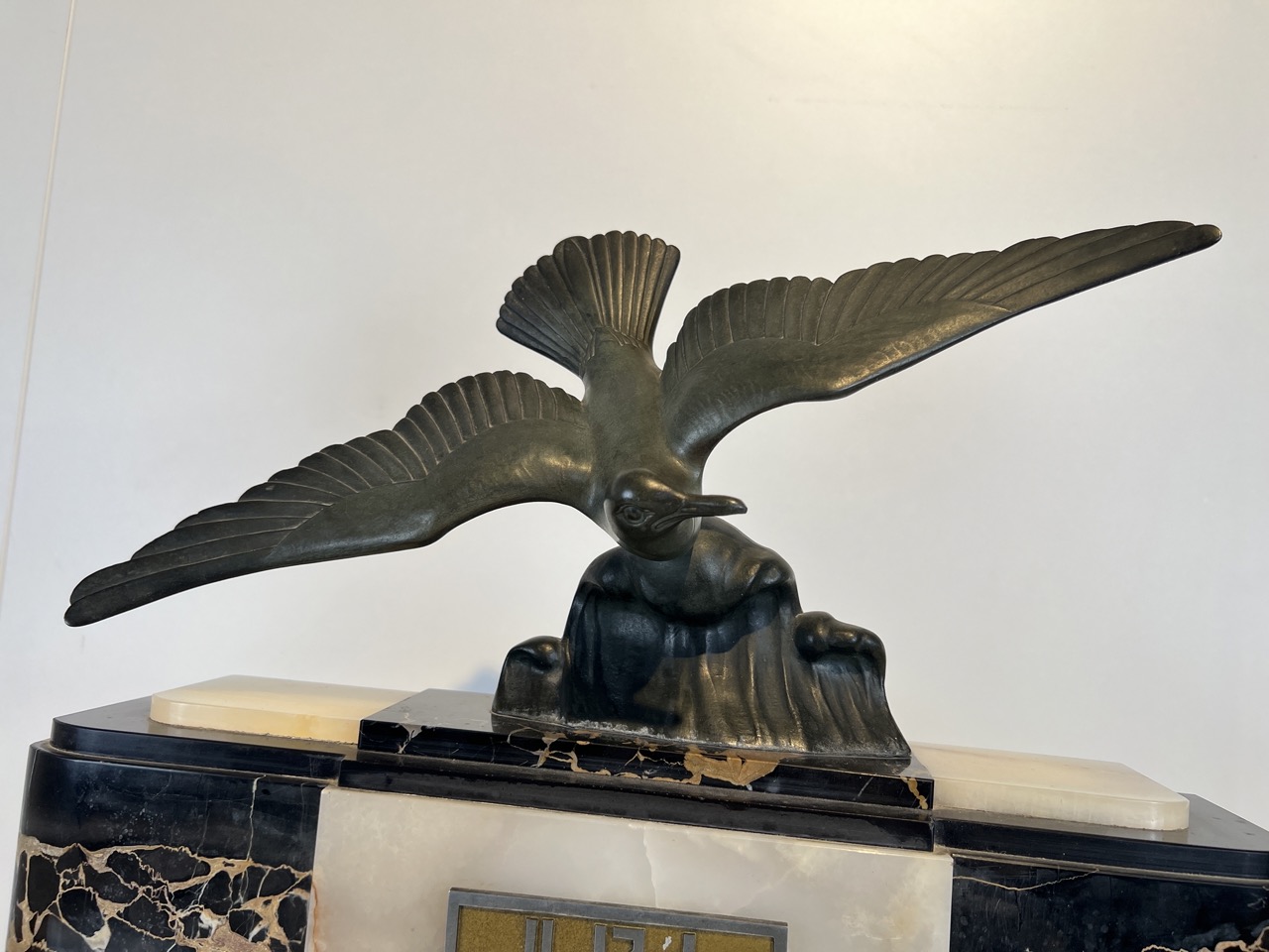 AD-DE-515 Art Deco Tischuhr mit Vogelskulptur, Marmor, Frankreich um 1930