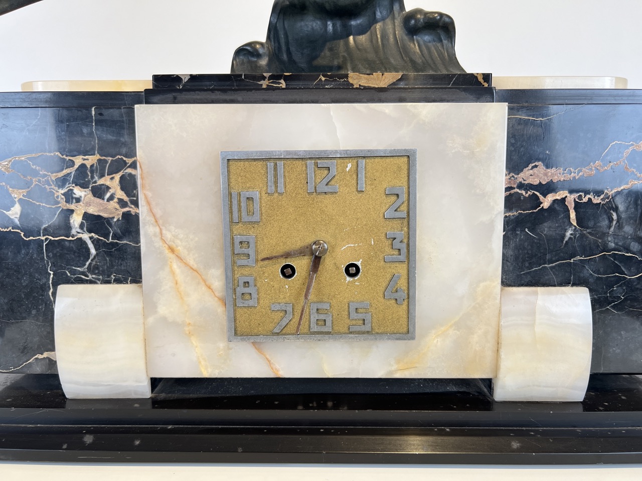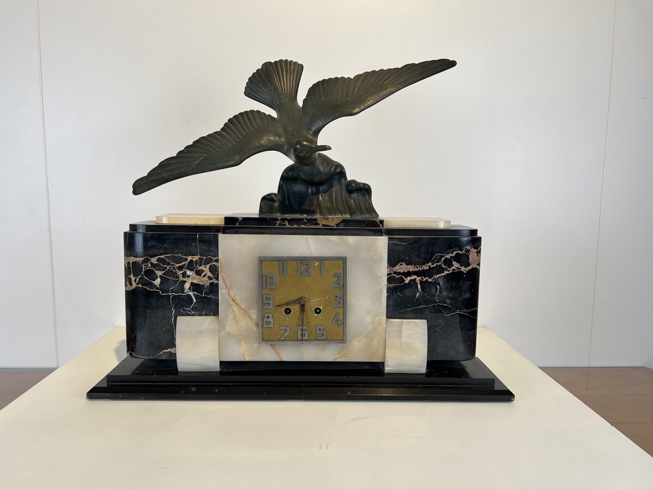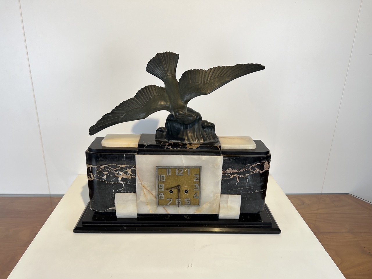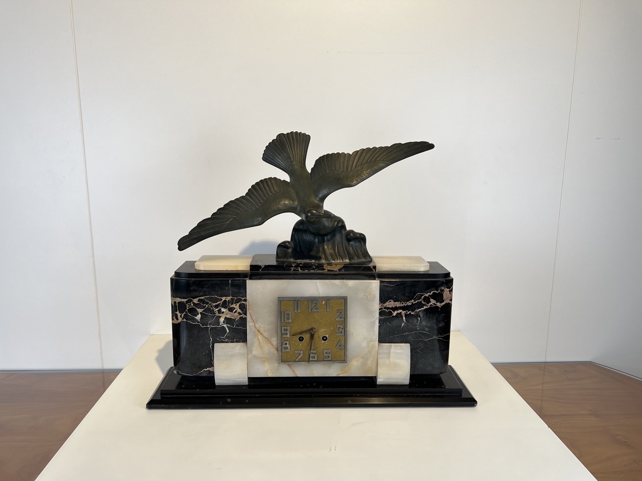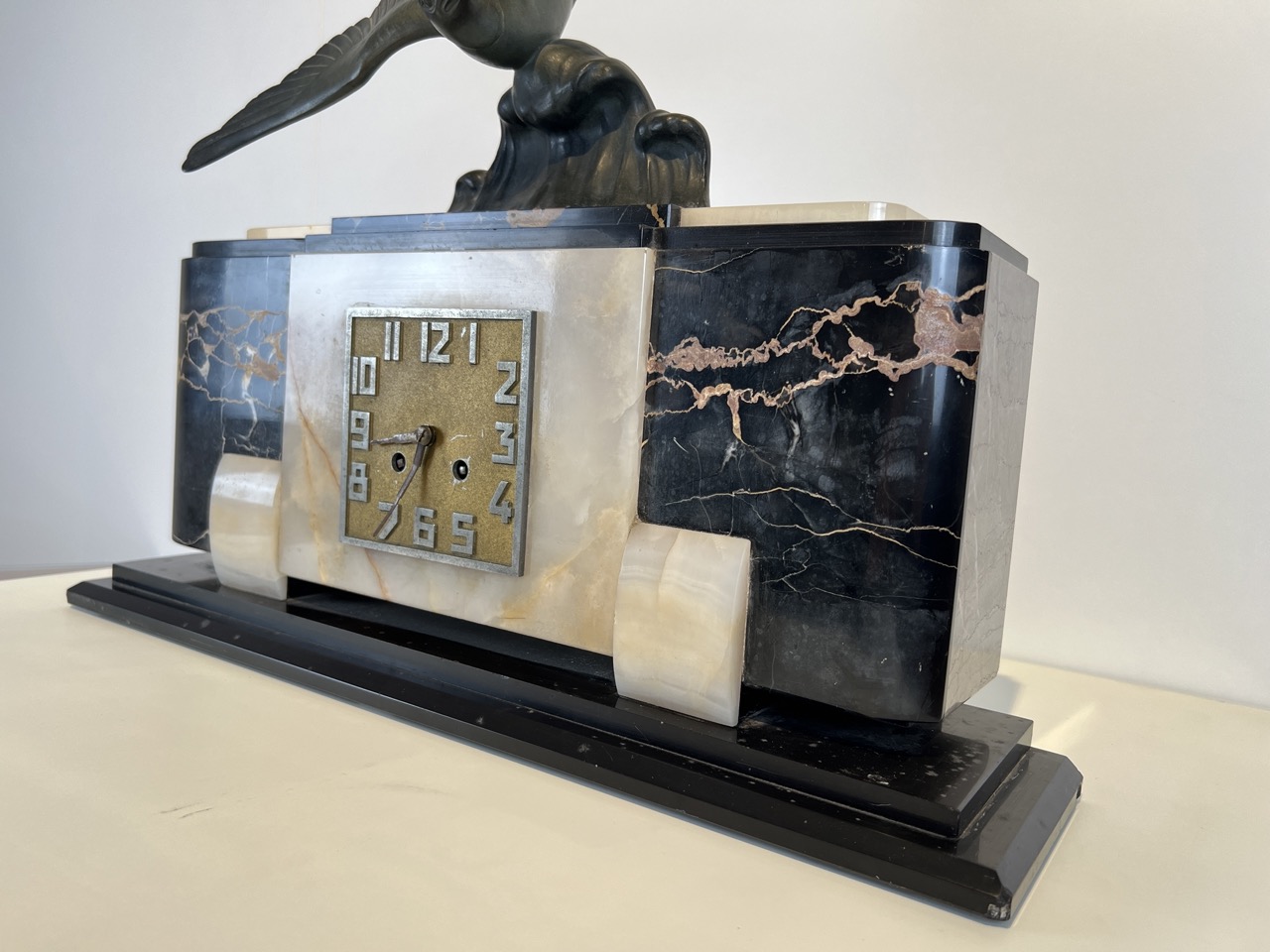 AD-DE-515 Art Deco Tischuhr mit Vogelskulptur, Marmor, Frankreich um 1930