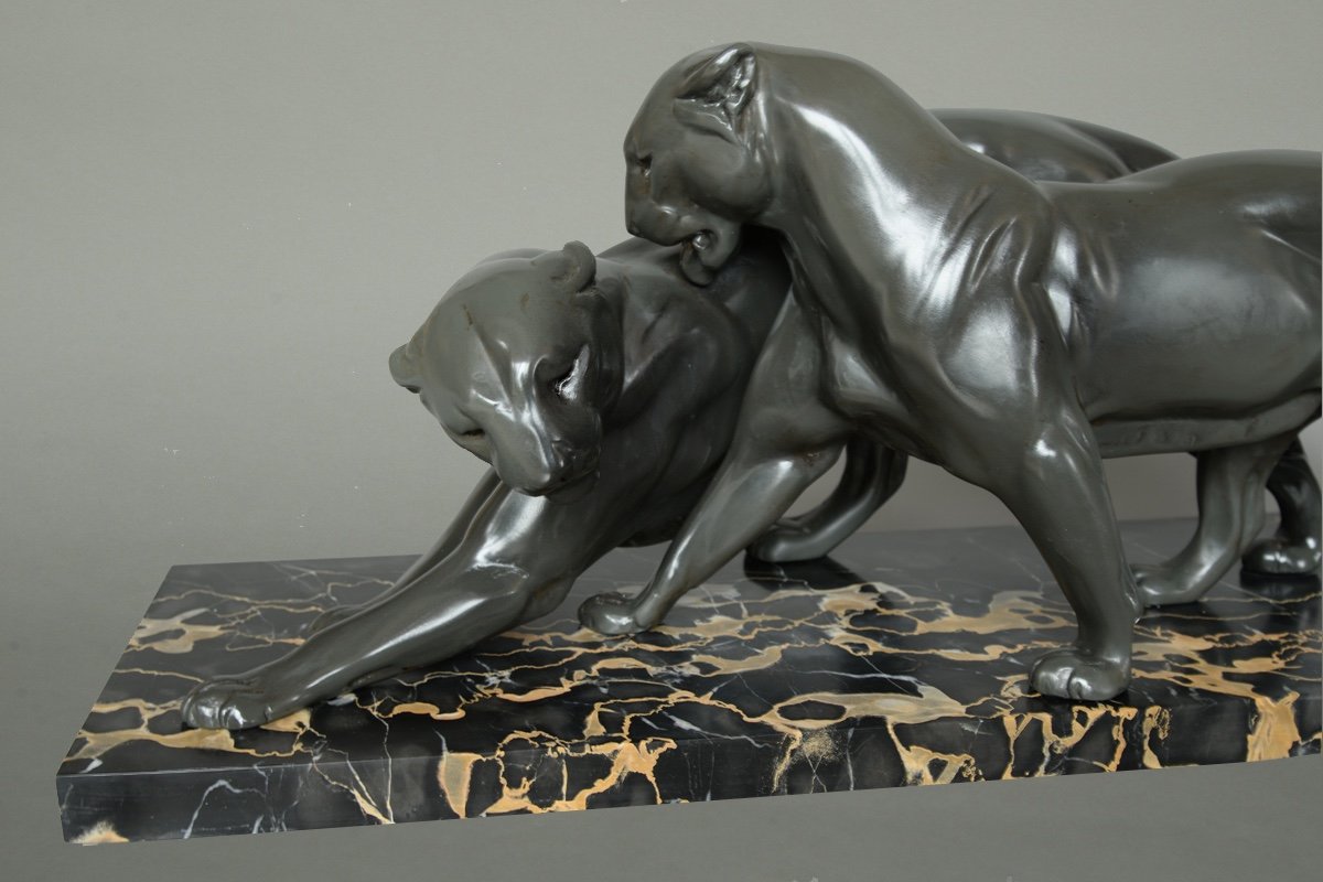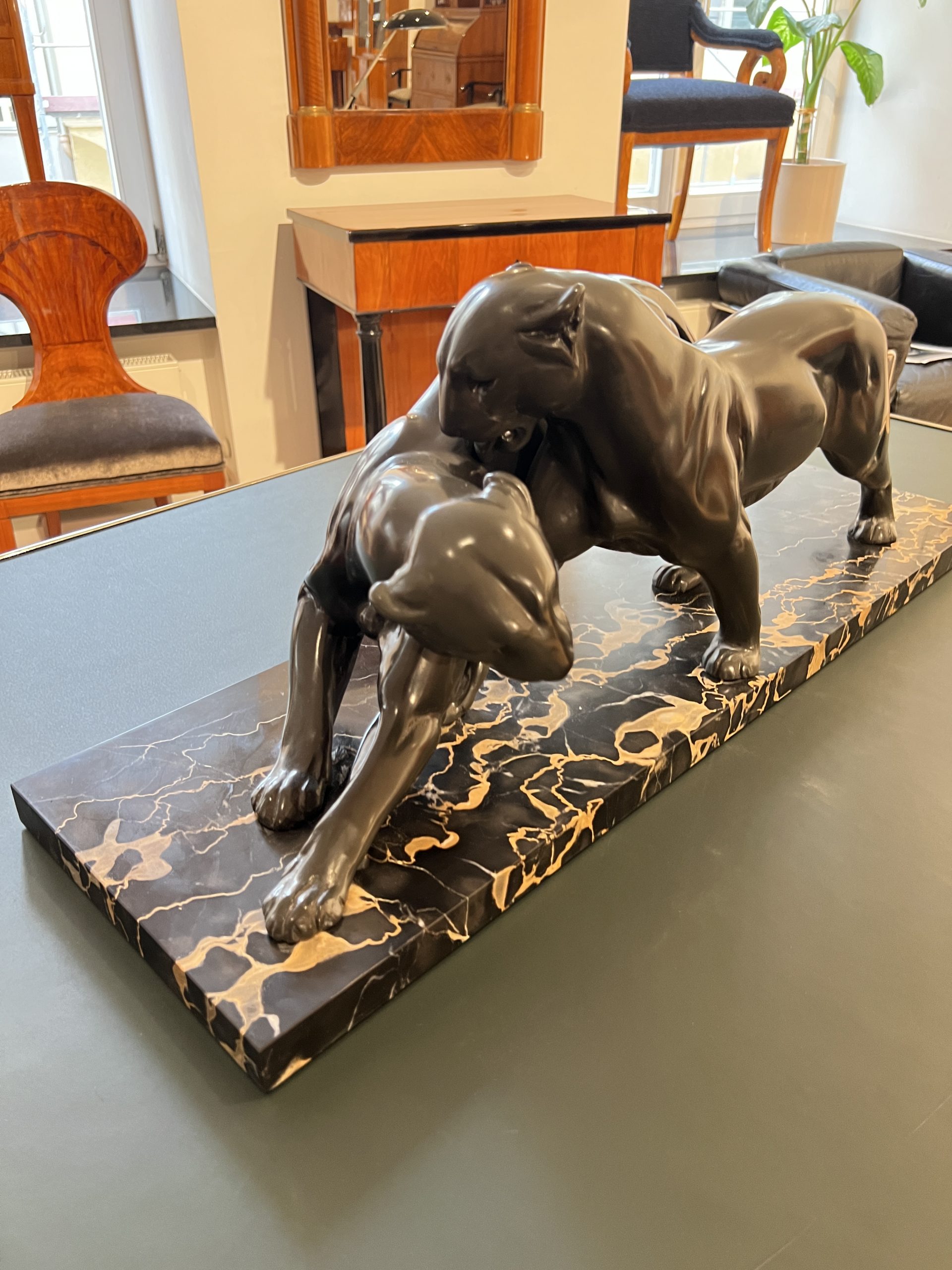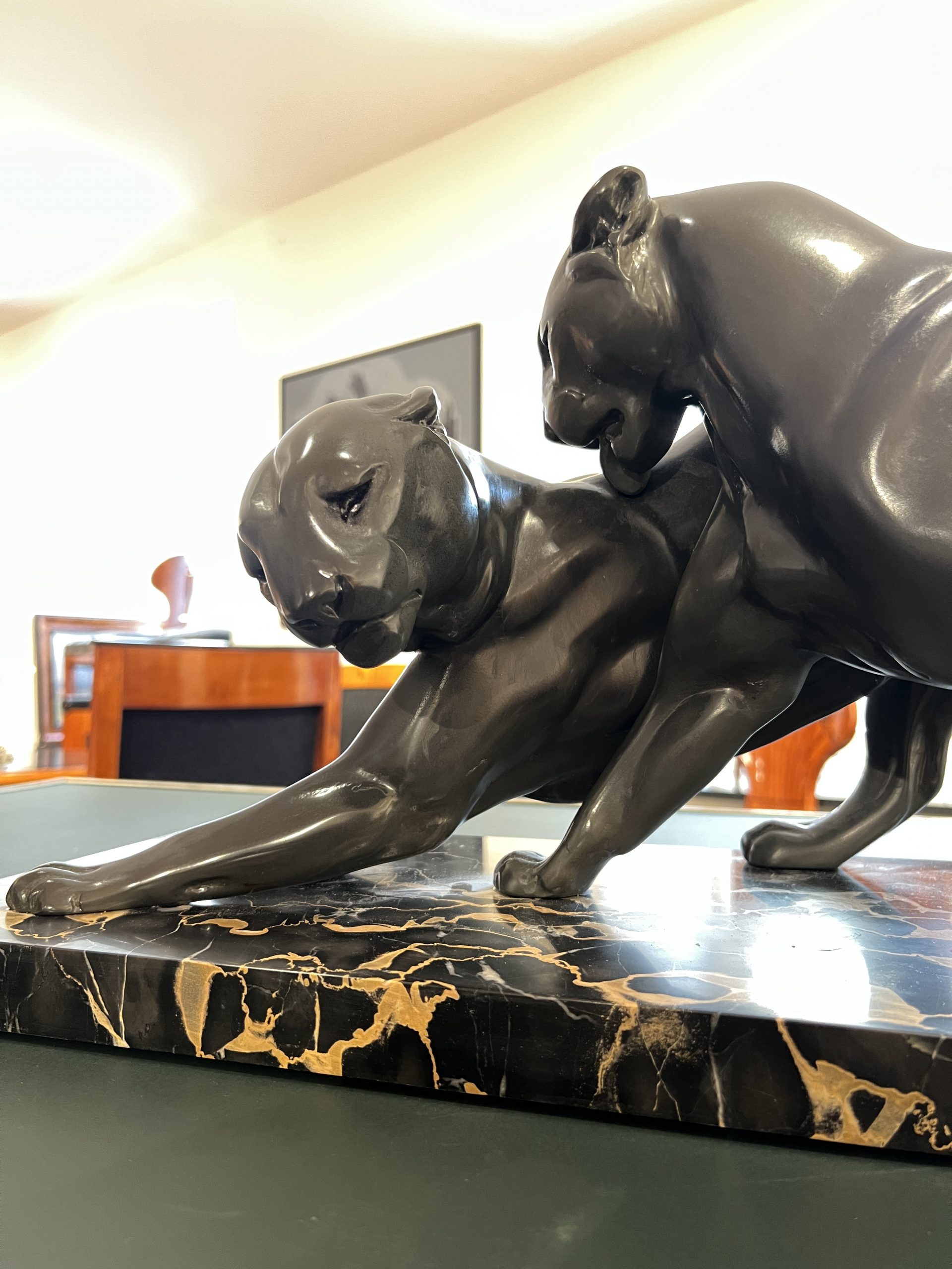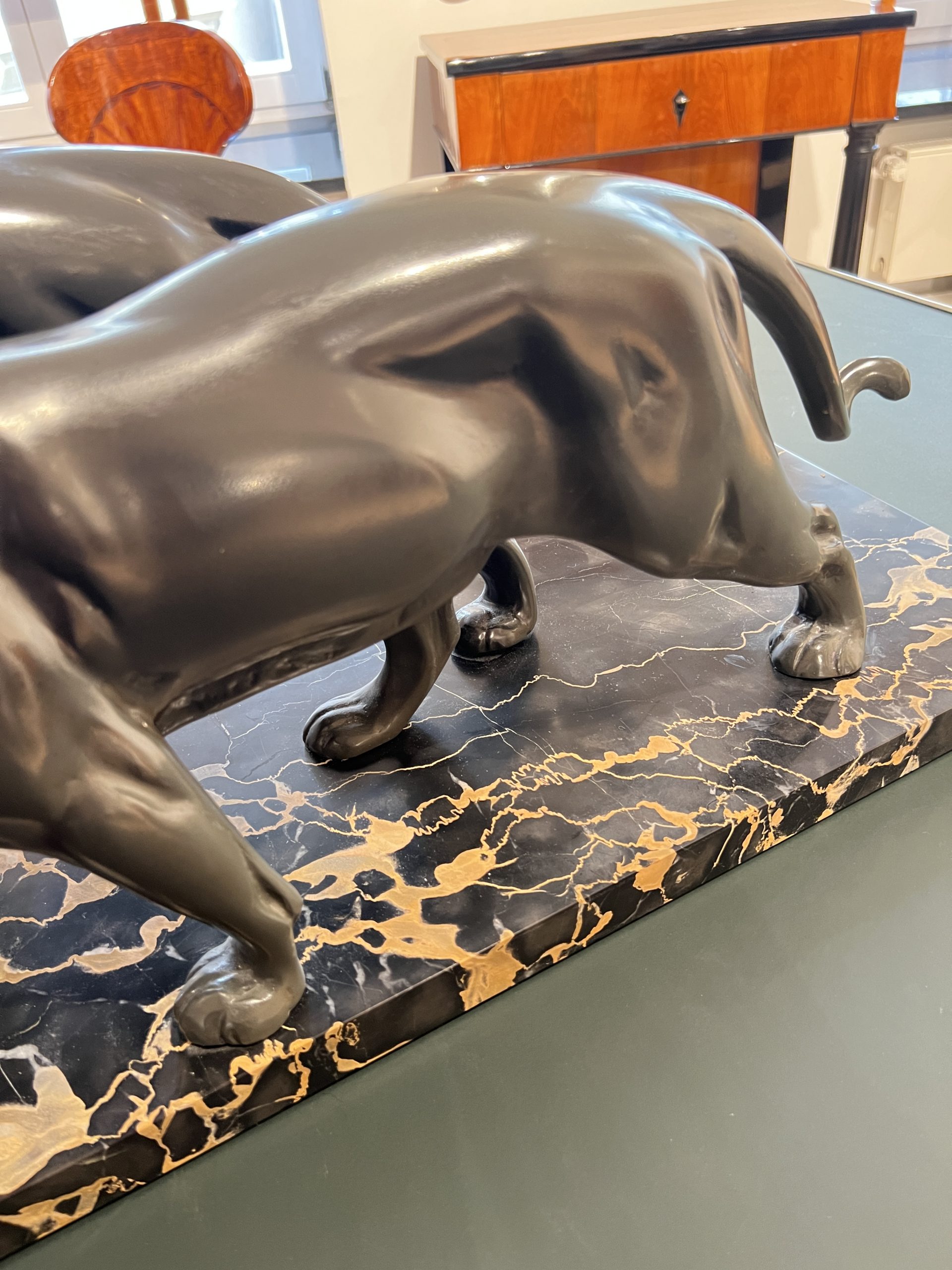 Seltene, elegante Skulptur von 2 Panthern bzw. eines Panther-Pärchens (Couple de panthères) aus Frankreich um 1930.