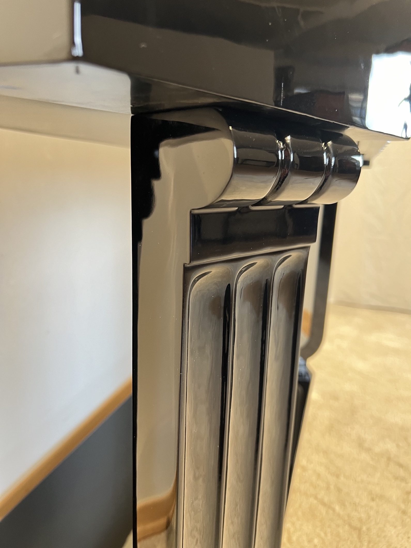 • Schwarzer Klavierlack, hochglänzend poliert.
