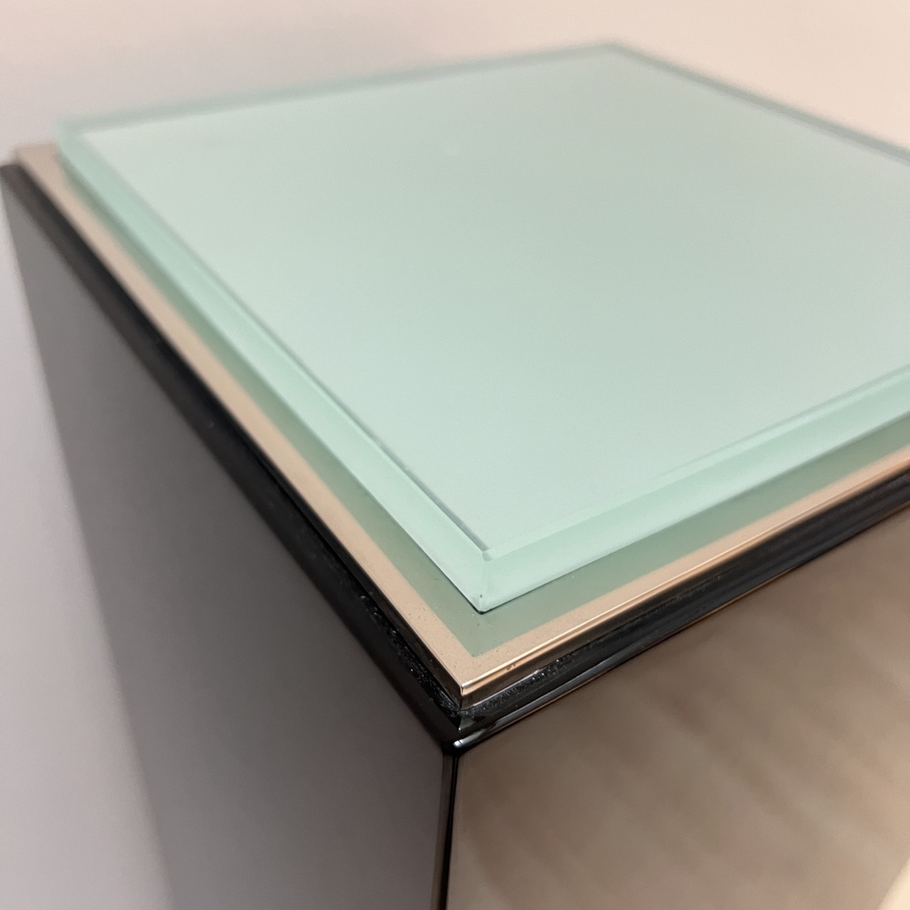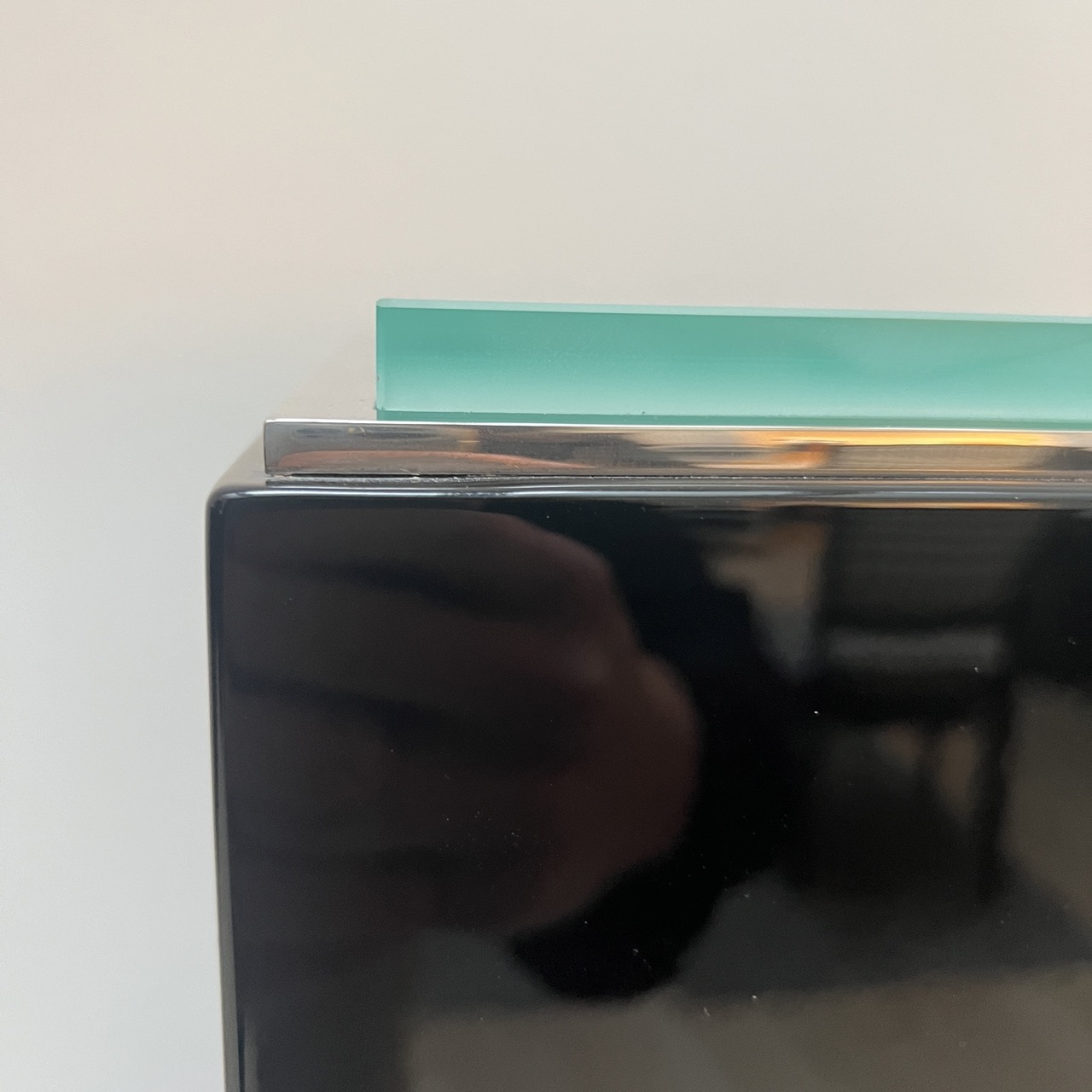 • Oben mit 1,1 cm dicker Glasplatte, in verchromtem Metallrahmen eingerahmt.
