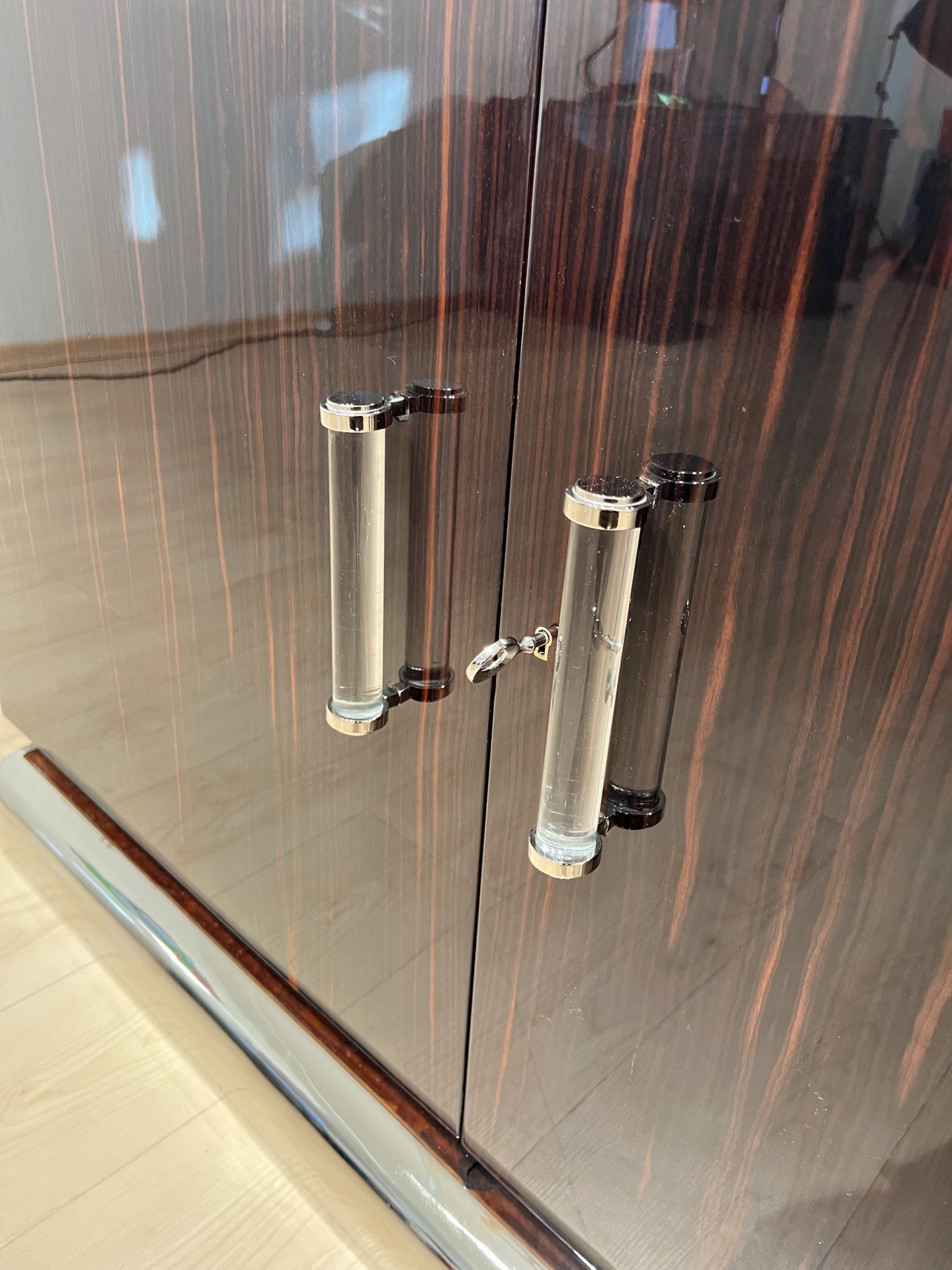 • Originale Griffe aus dicken Glasstangen mit vernickelten Halterungen