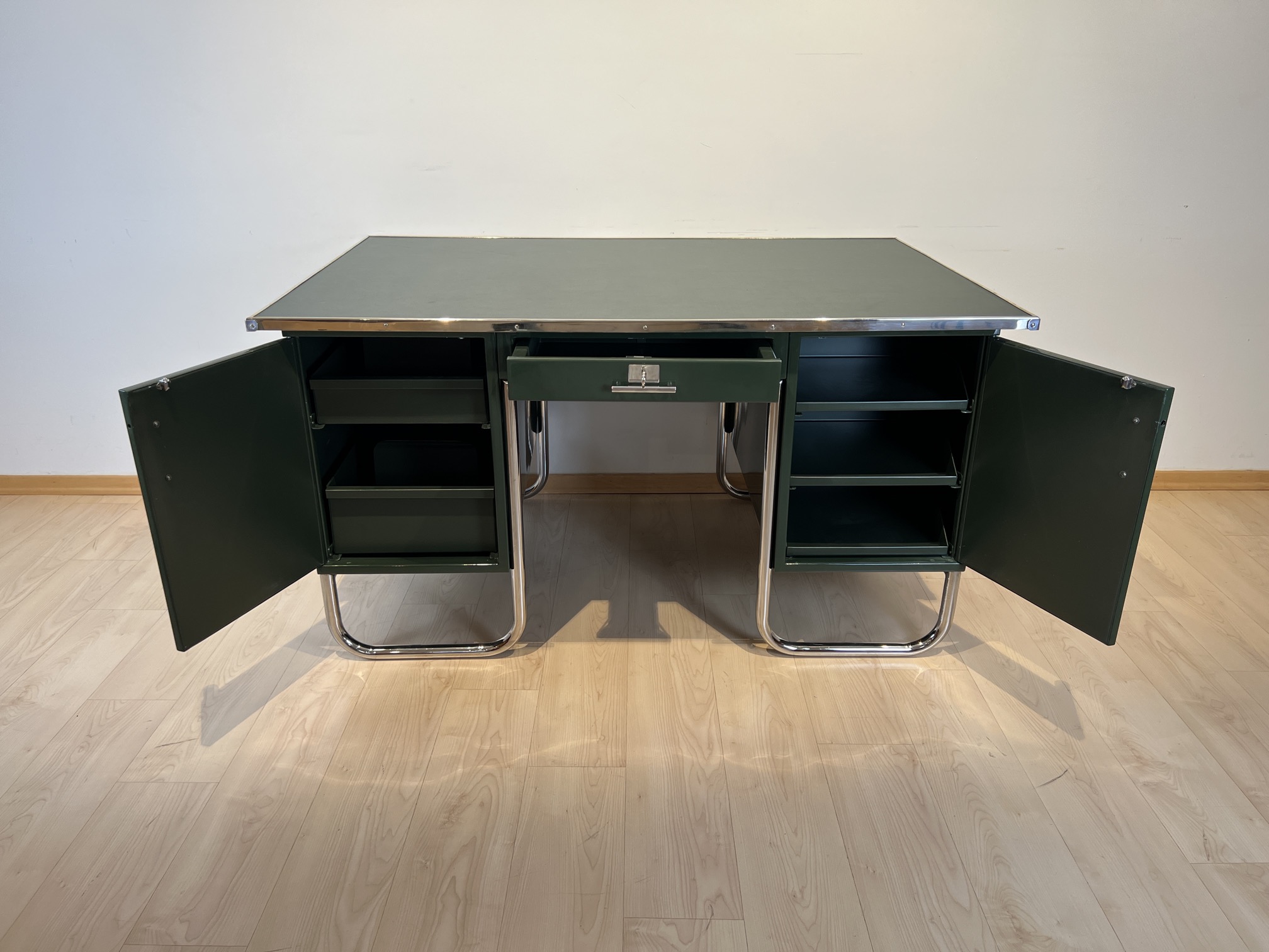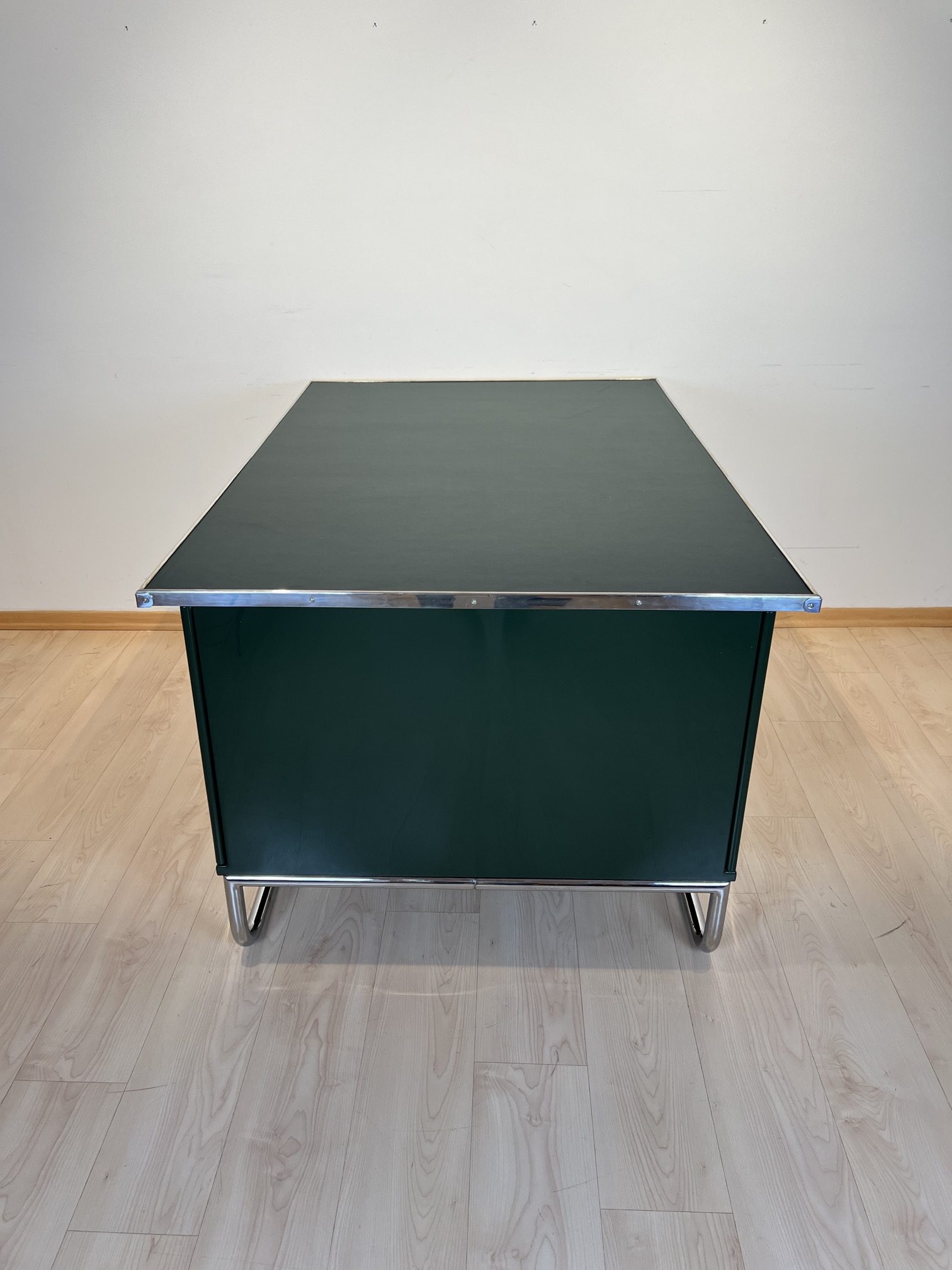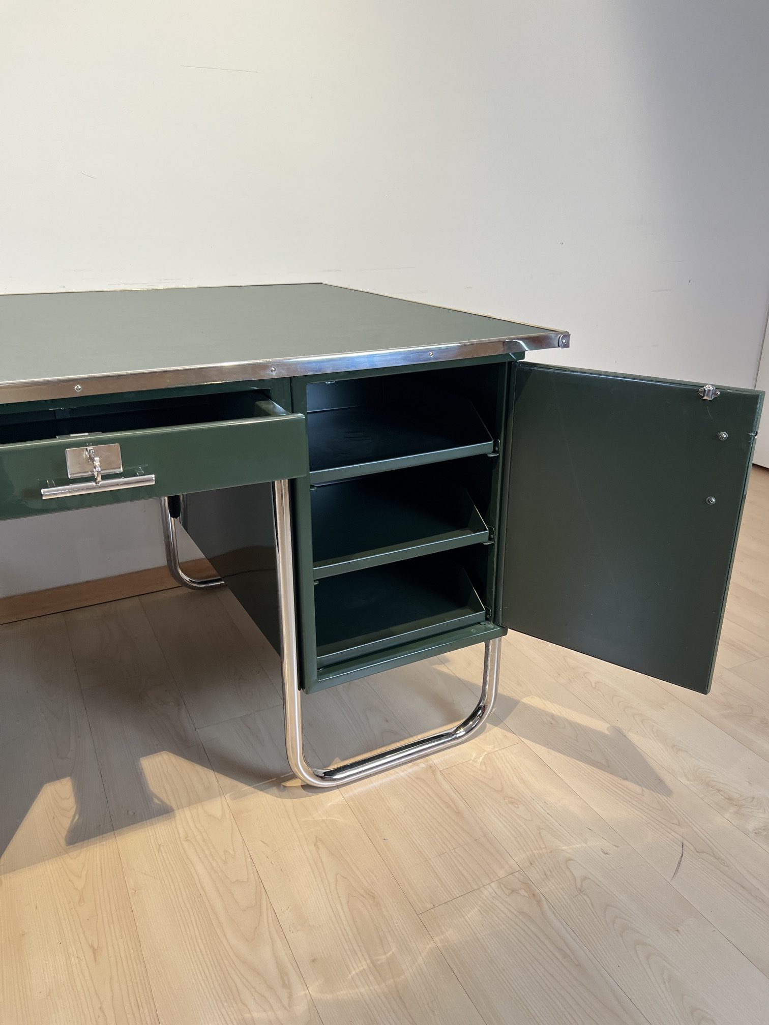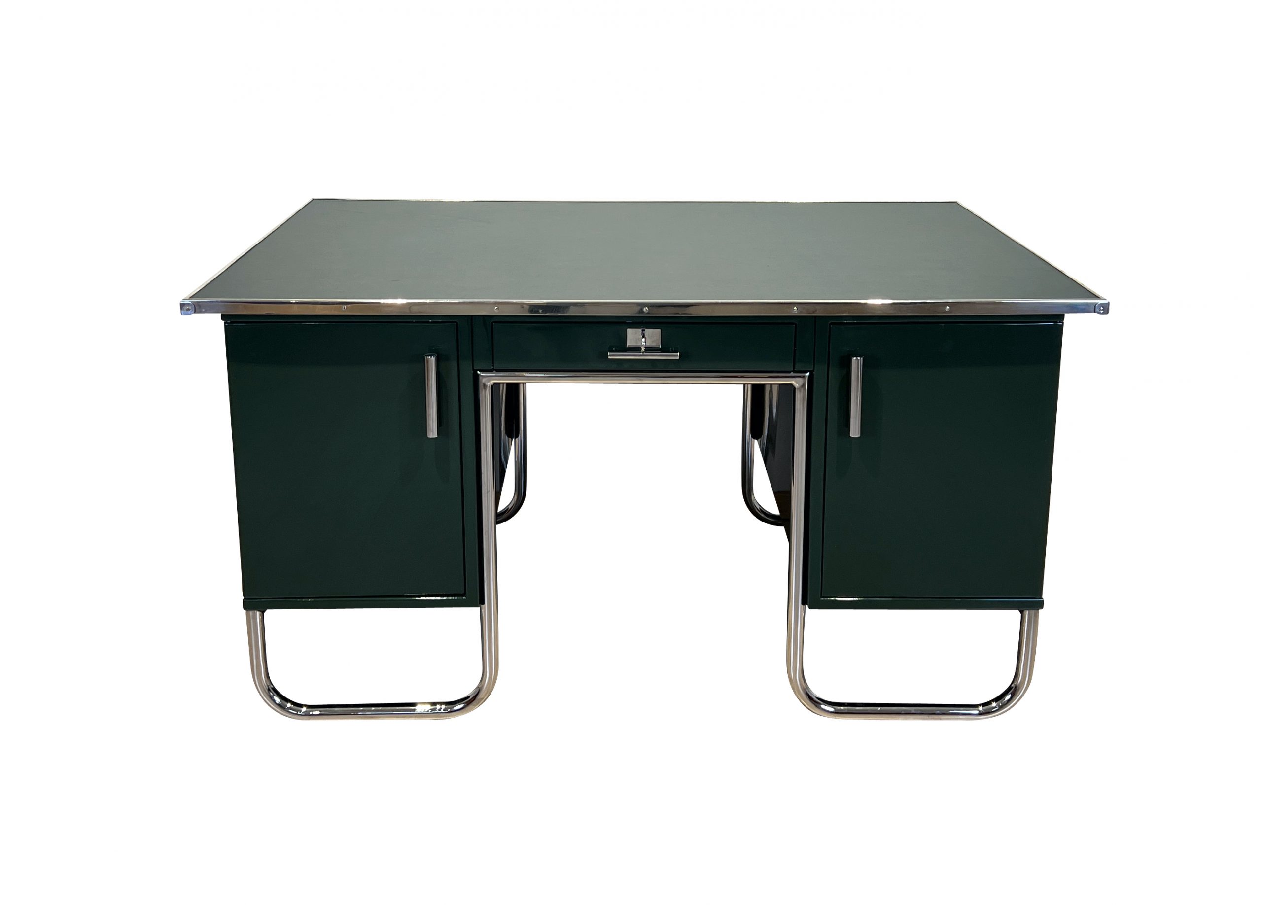 AD-SCH-469 Großer Bauhaus Metall Schreibtisch, Grüner Lack, Chrom, Deutschland um 1930