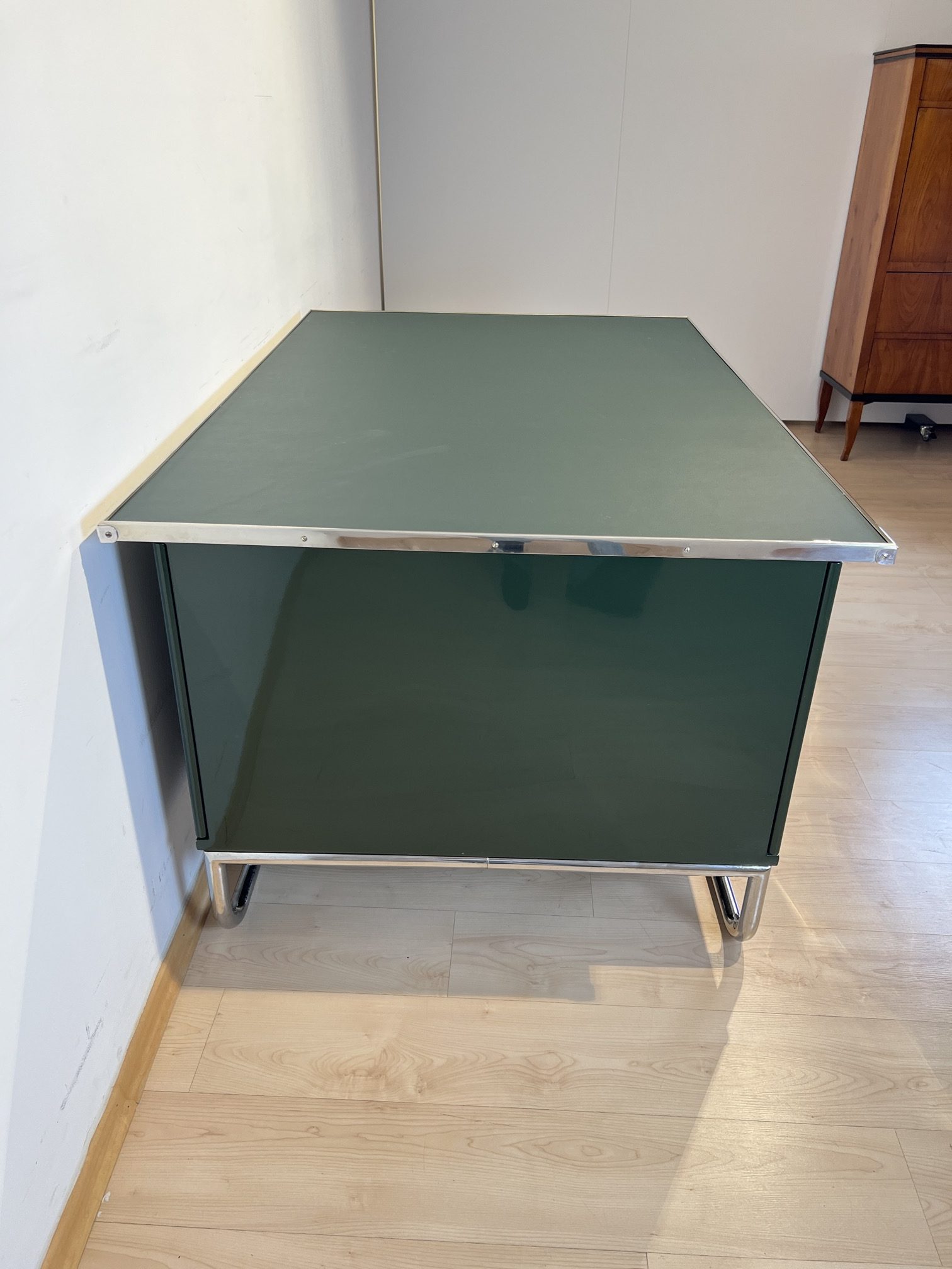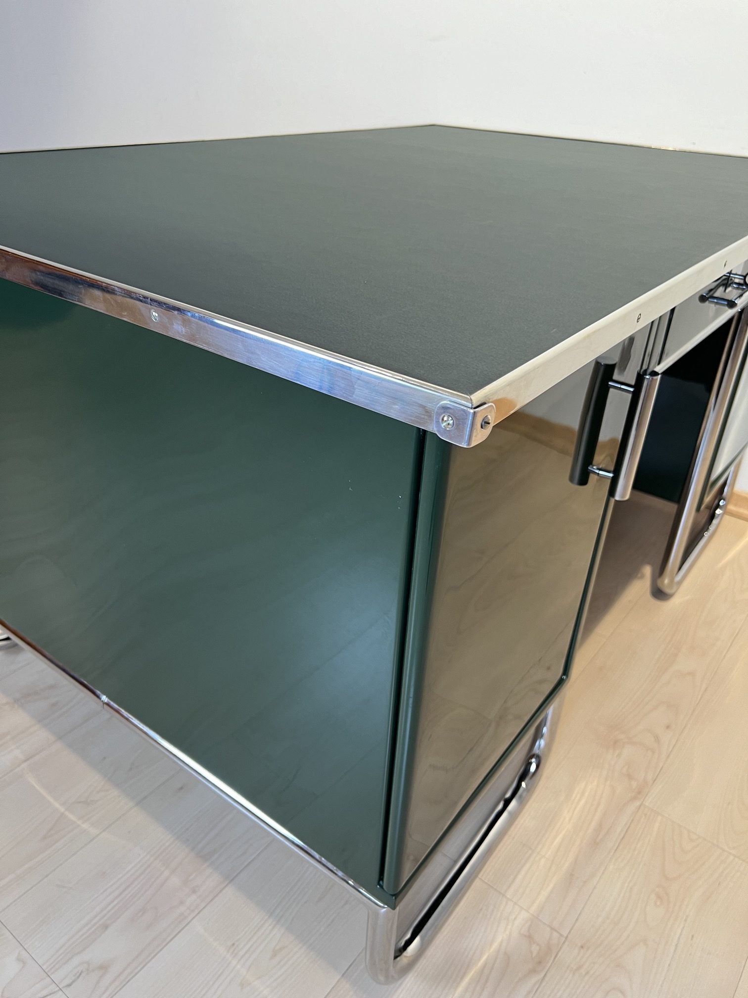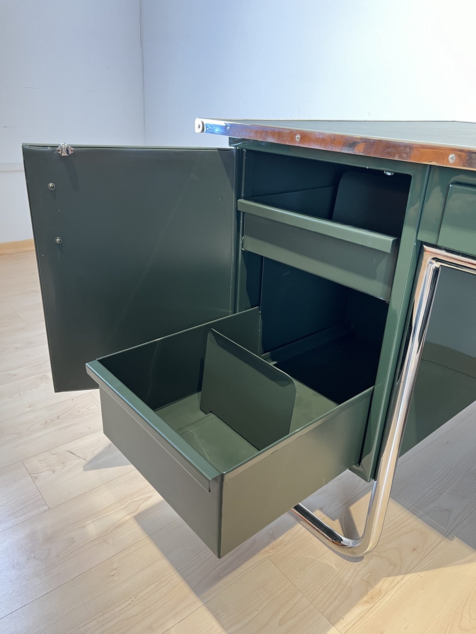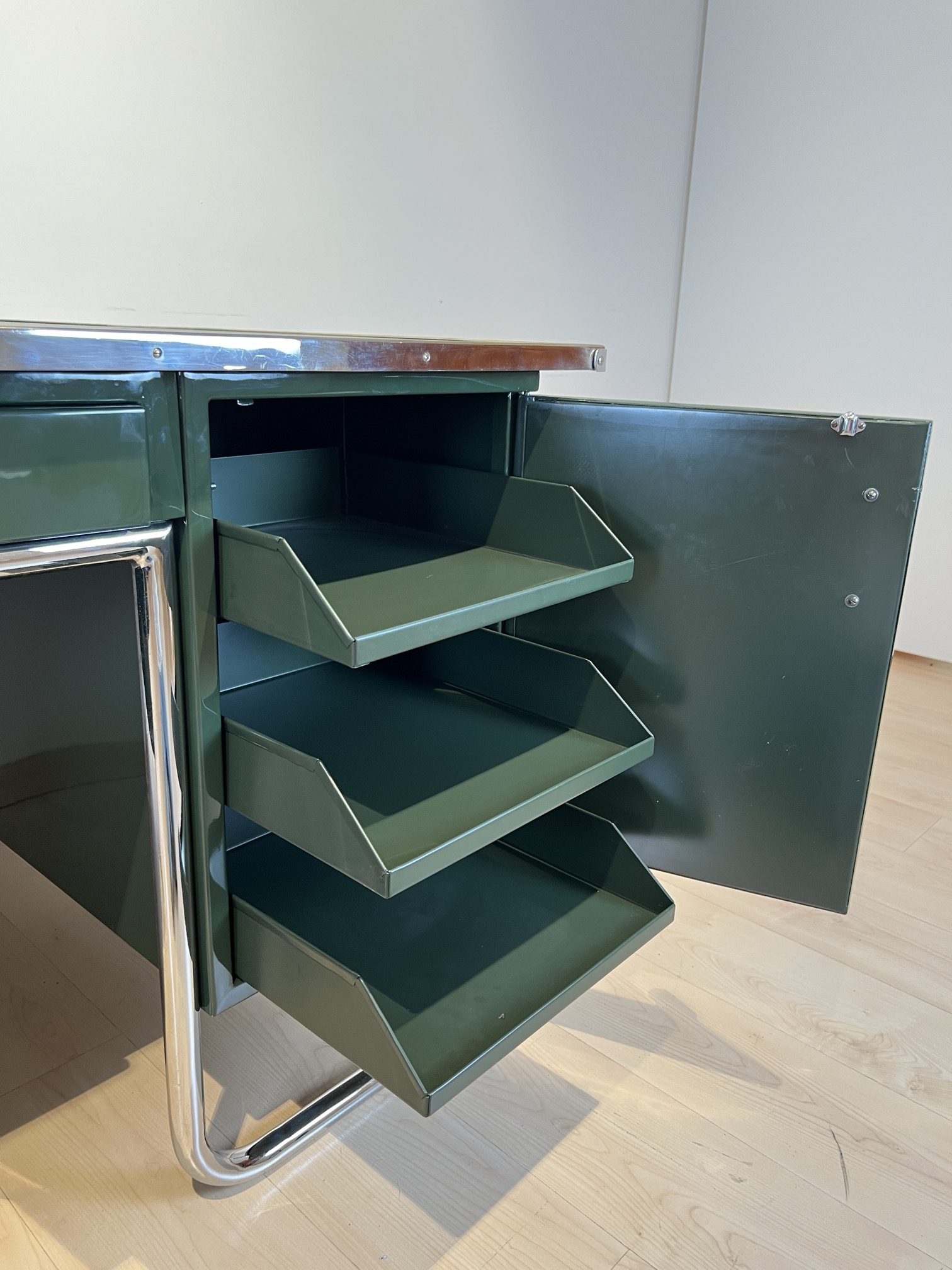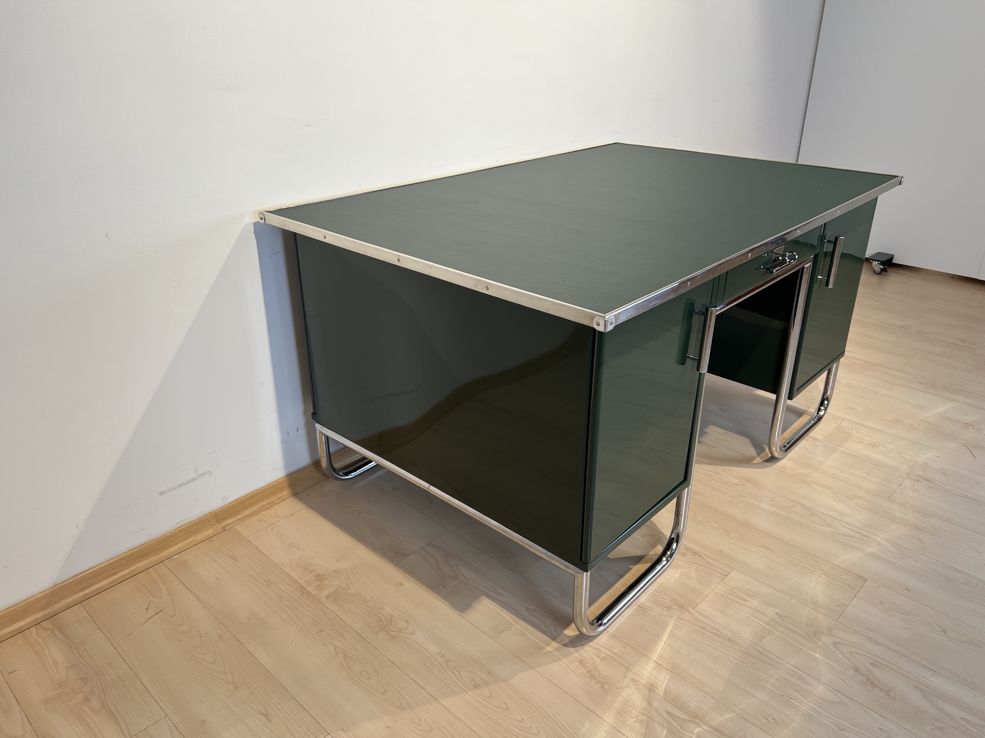 AD-SCH-469 Großer Bauhaus Metall Schreibtisch, Grüner Lack, Chrom, Deutschland um 1930