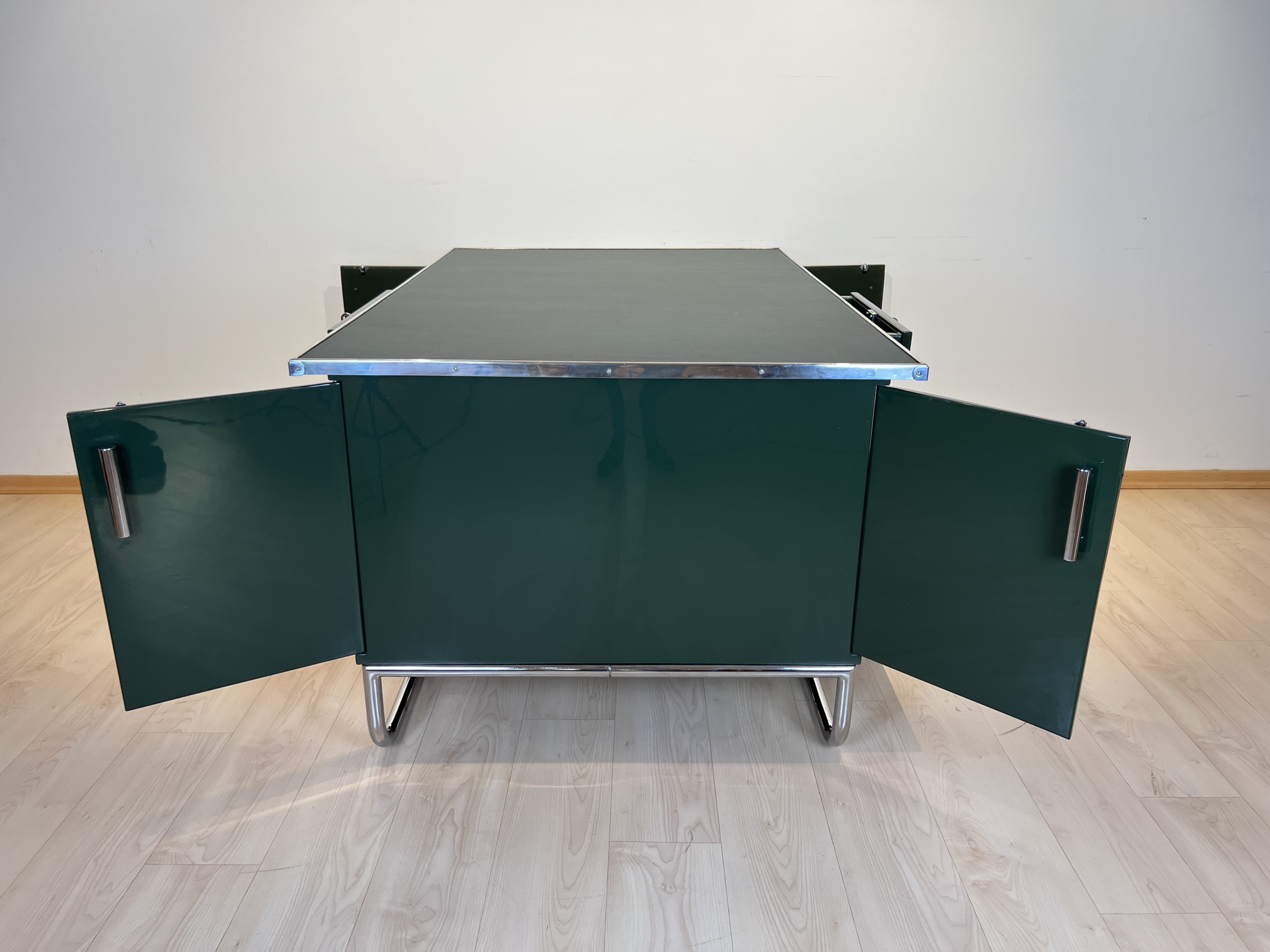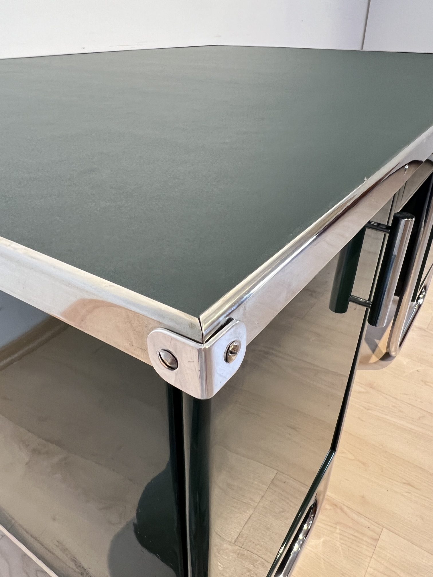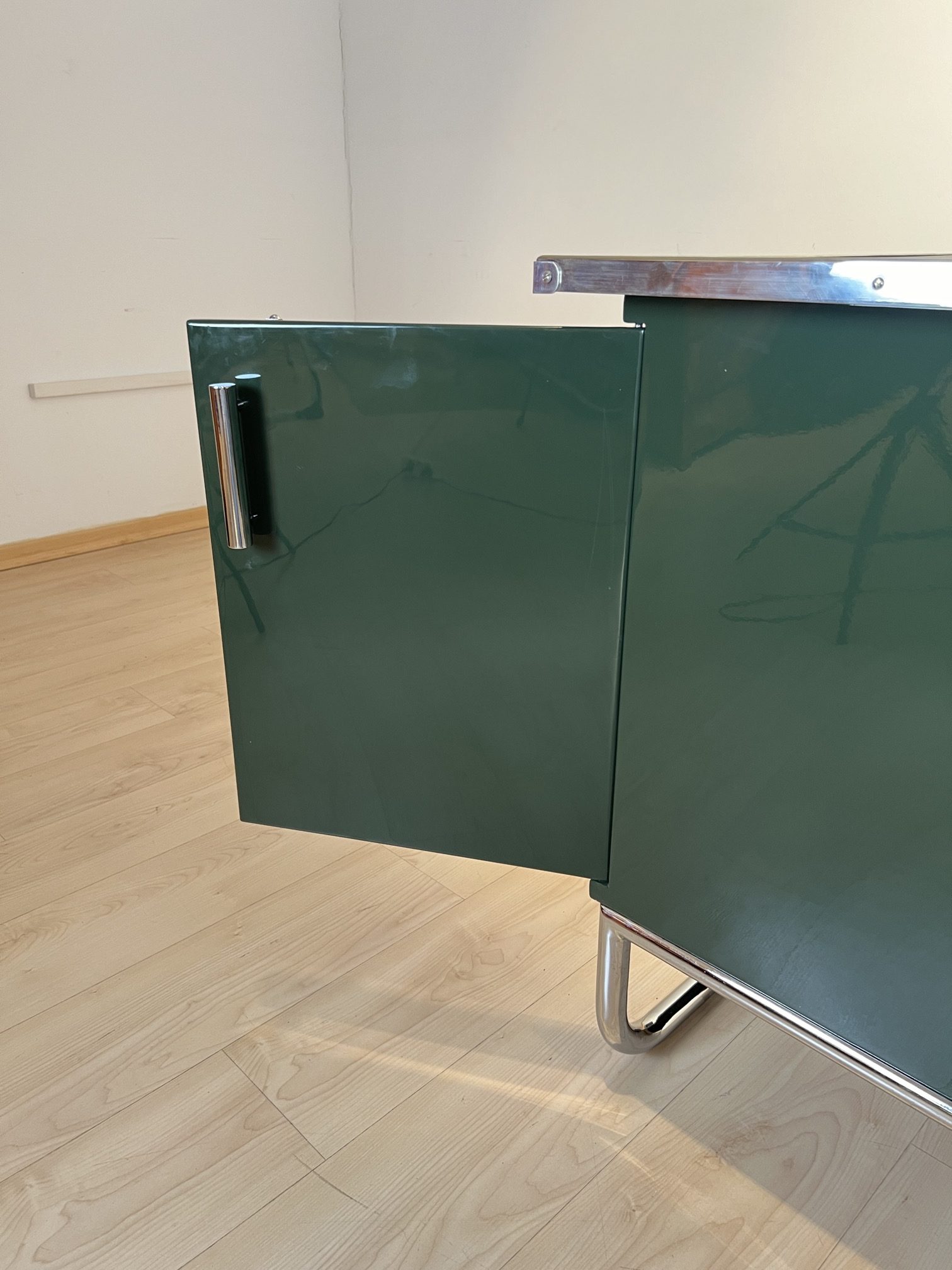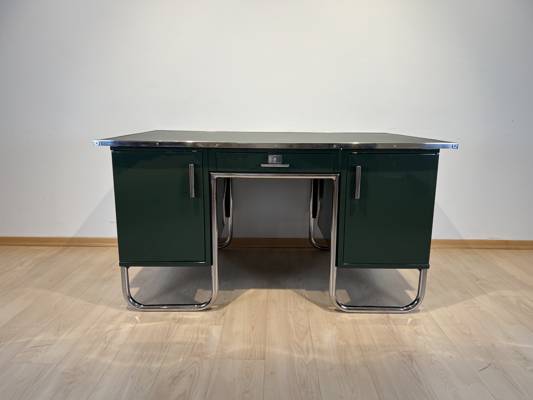 AD-SCH-469 Großer Bauhaus Metall Schreibtisch, Grüner Lack, Chrom, Deutschland um 1930