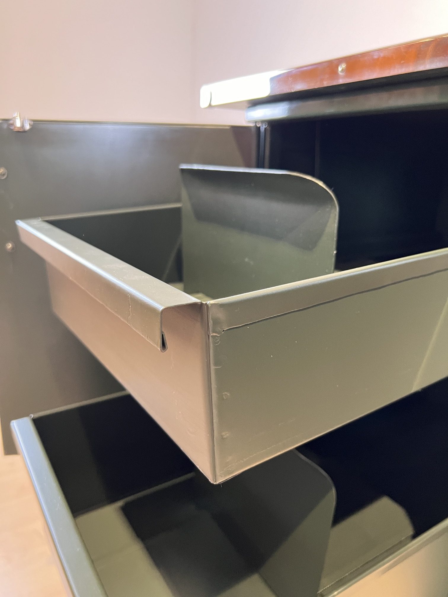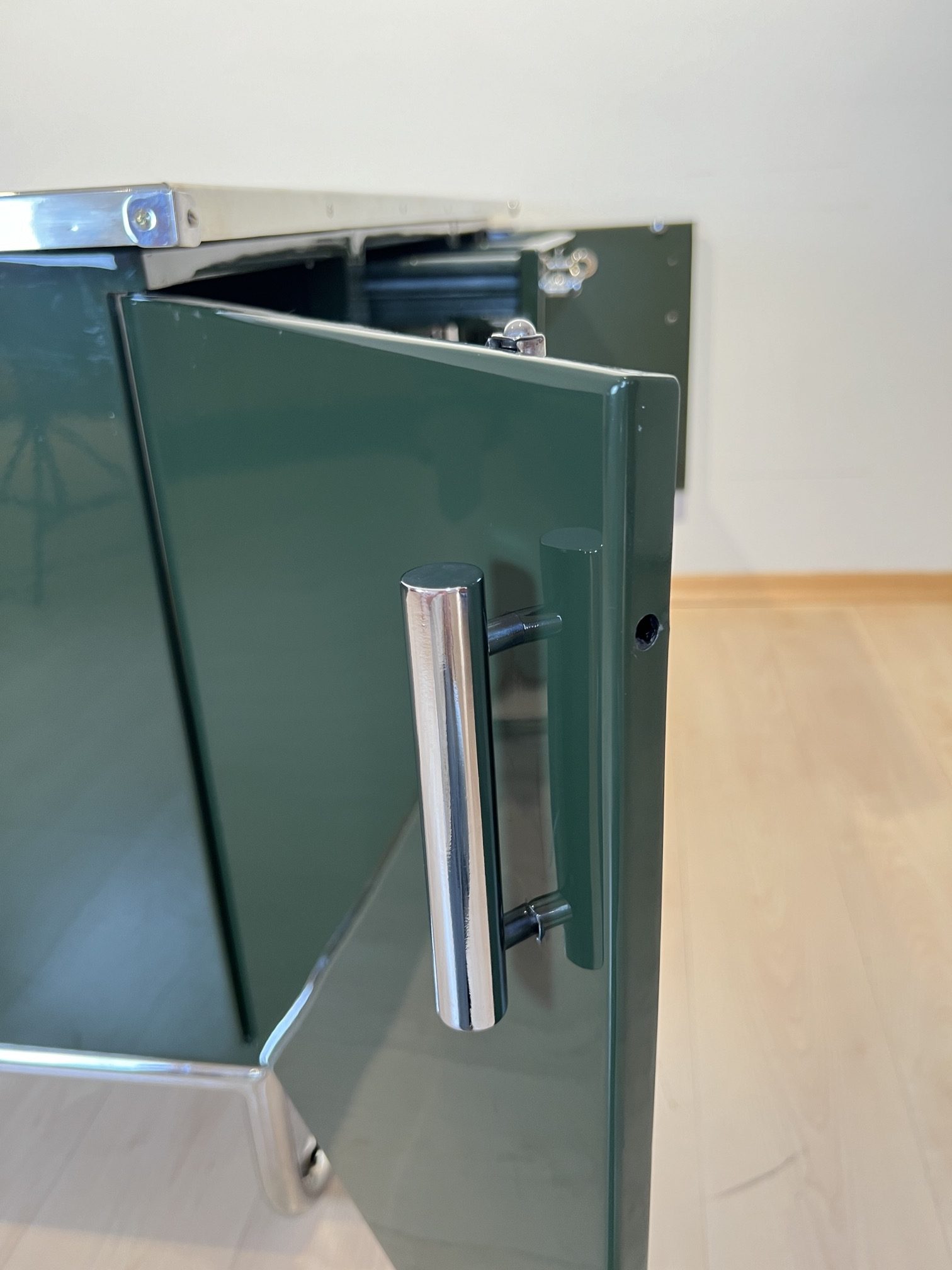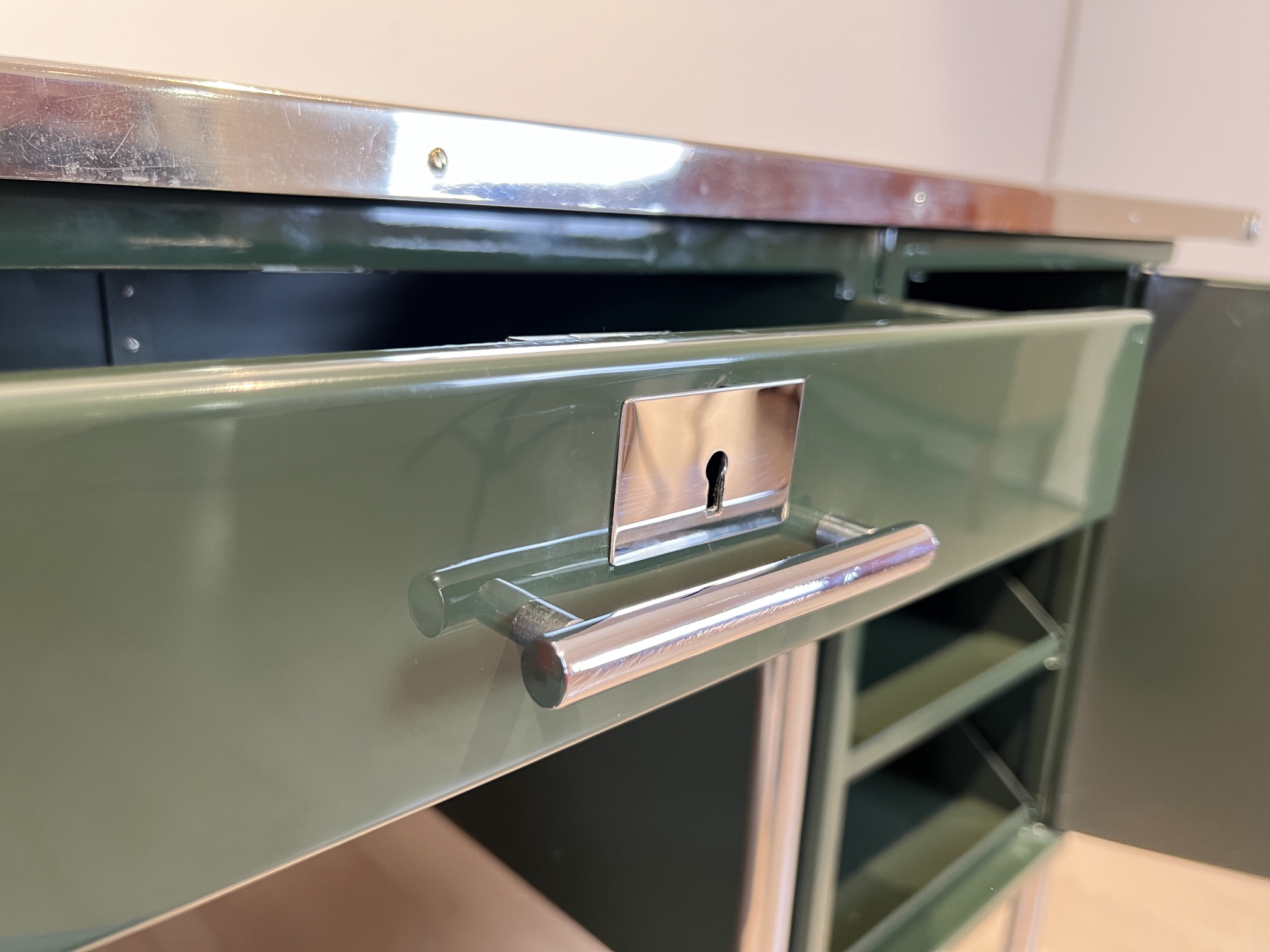 • Innen Metallschübe, teil mit Trennbrettern in seidenmatt grün lackiert