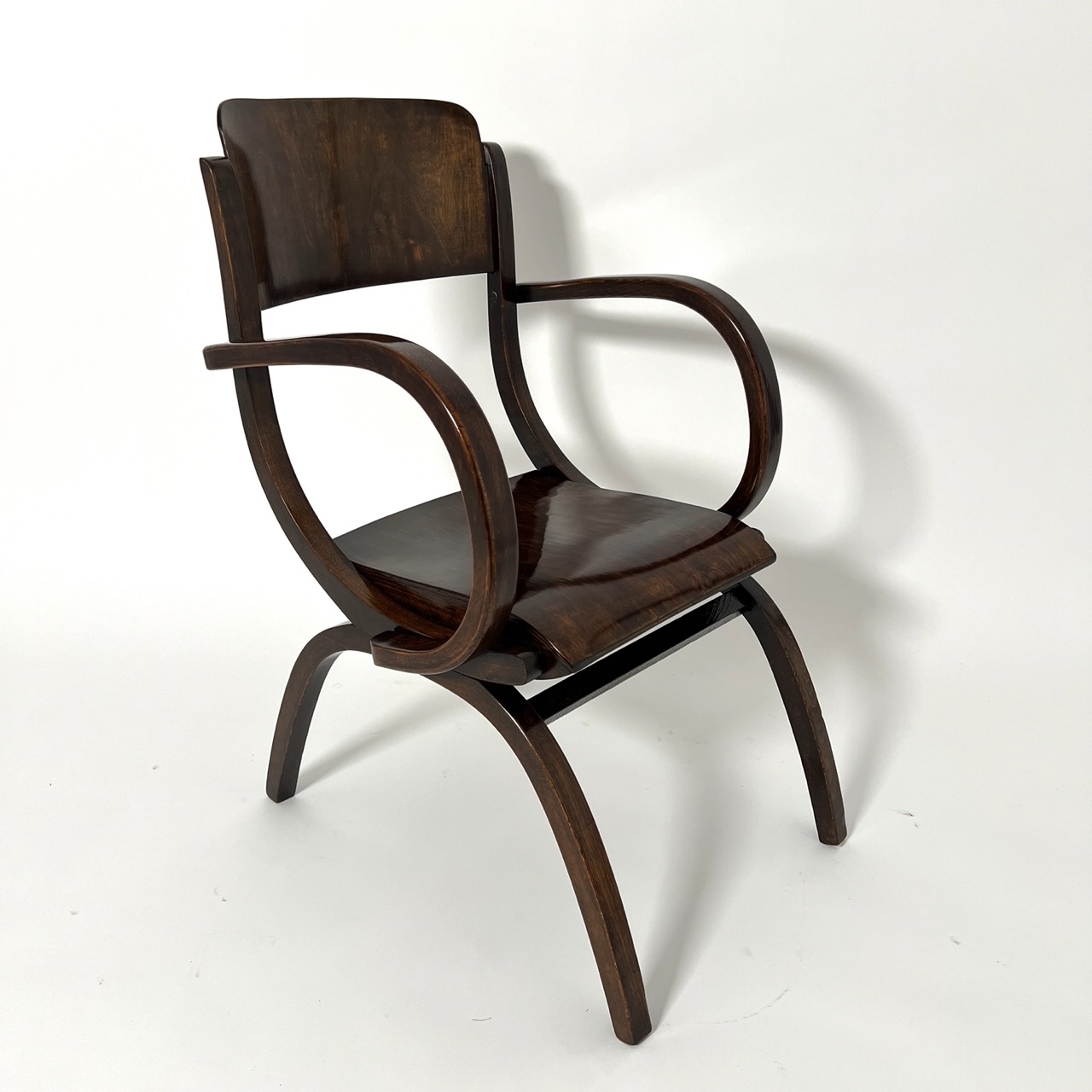 Originaler Bauhaus Armlehnstuhl in gebeiztem Buchholz mit gebogten Armlehnen.