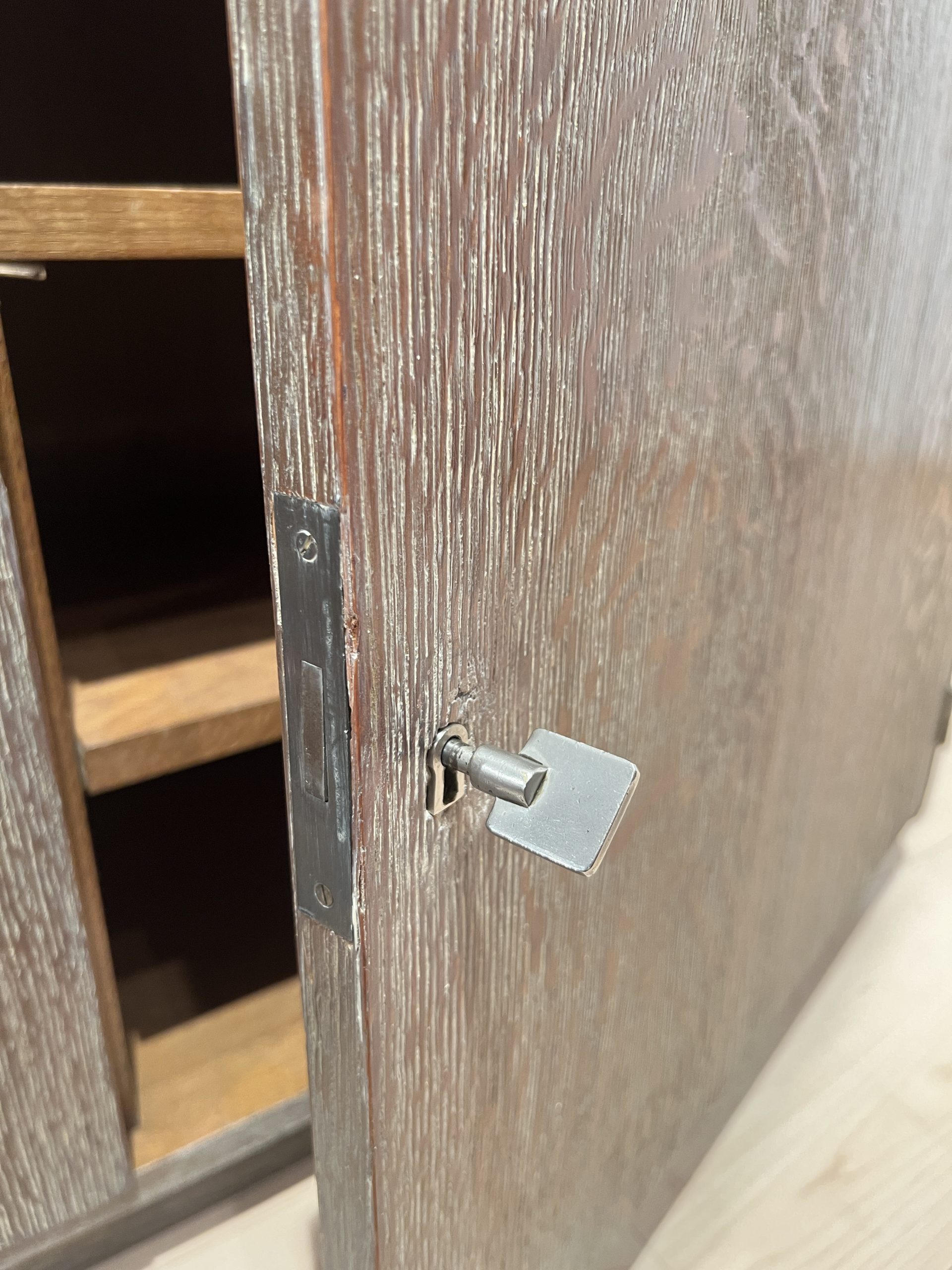 - Unten 2 Türen, oben ein Freifach. Innen mit 3 Eichen Einlegebrettern.