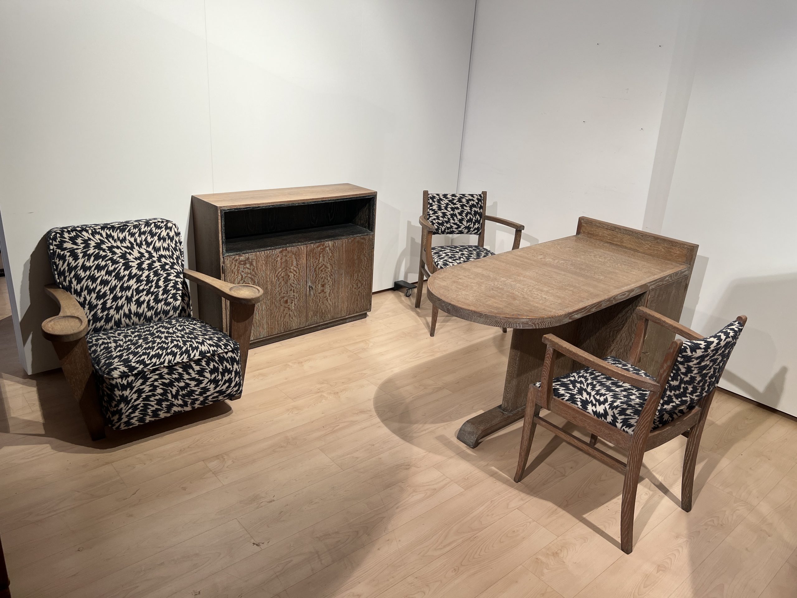 Der Büroschrank ist Teil eines De Coene Freude Office Ensembles zusammen mit einem Schreibtisch, einem Club Sessel und zwei Armlehnstühlen und steht in unserem Angebot auch separat zum Verkauf.