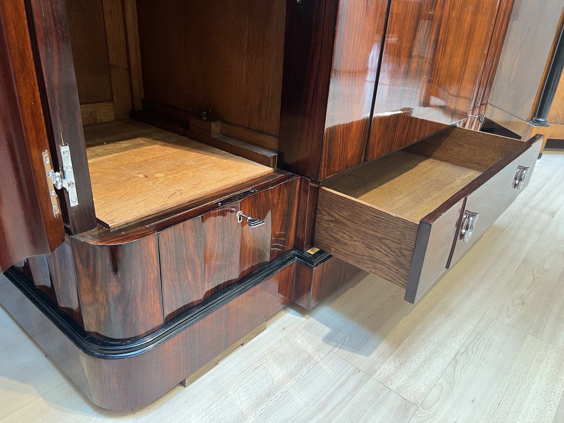 - Unten seitlich 2 kleine und 1 breiter Schubladen, alle sperrbar mit den originalen Schlössern und Schlüsseln.