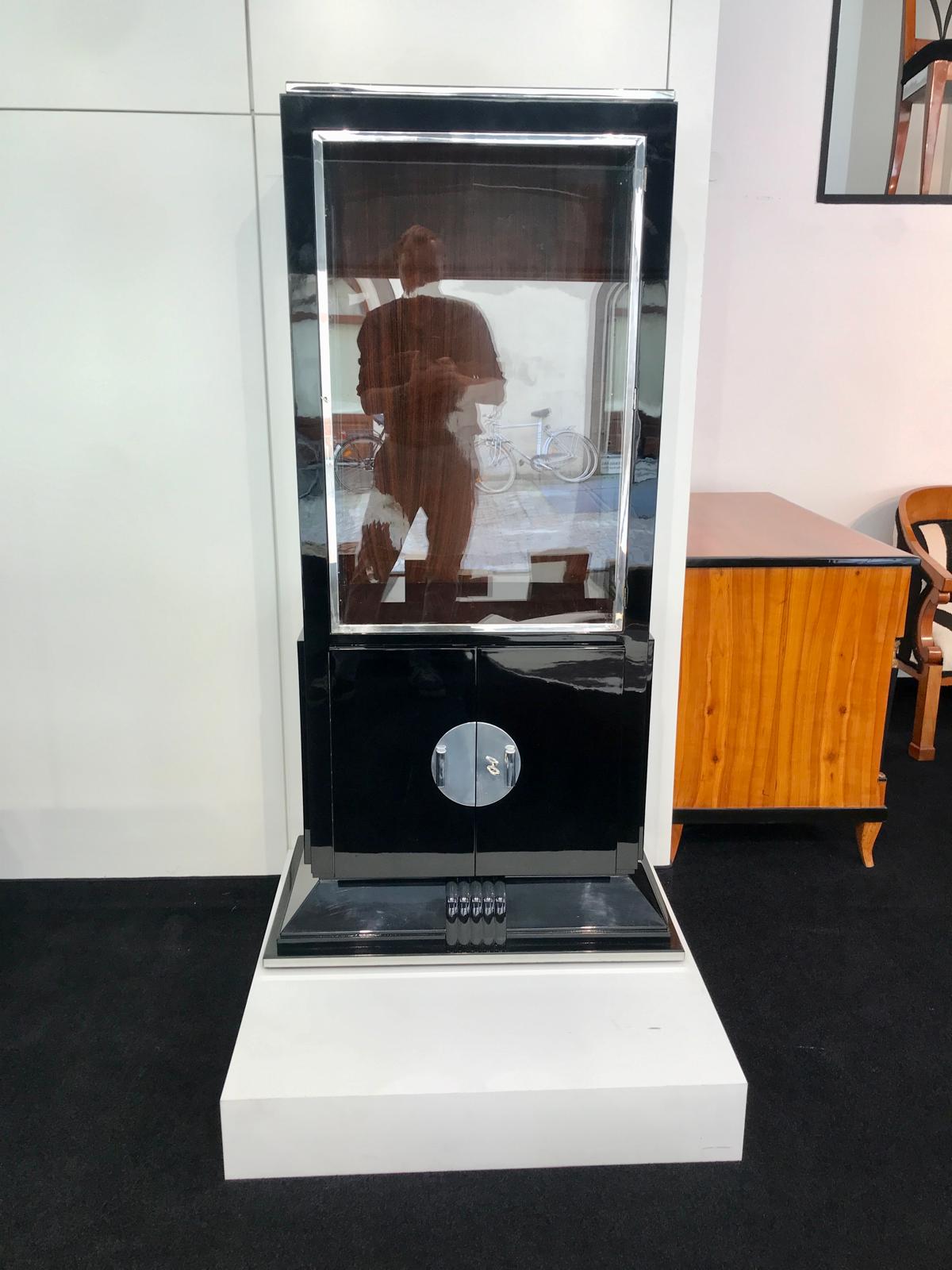AD-SV-144 Art Deco Vitrine, Schwarzer Klavierlack und Chrom, Frankreich um 1930