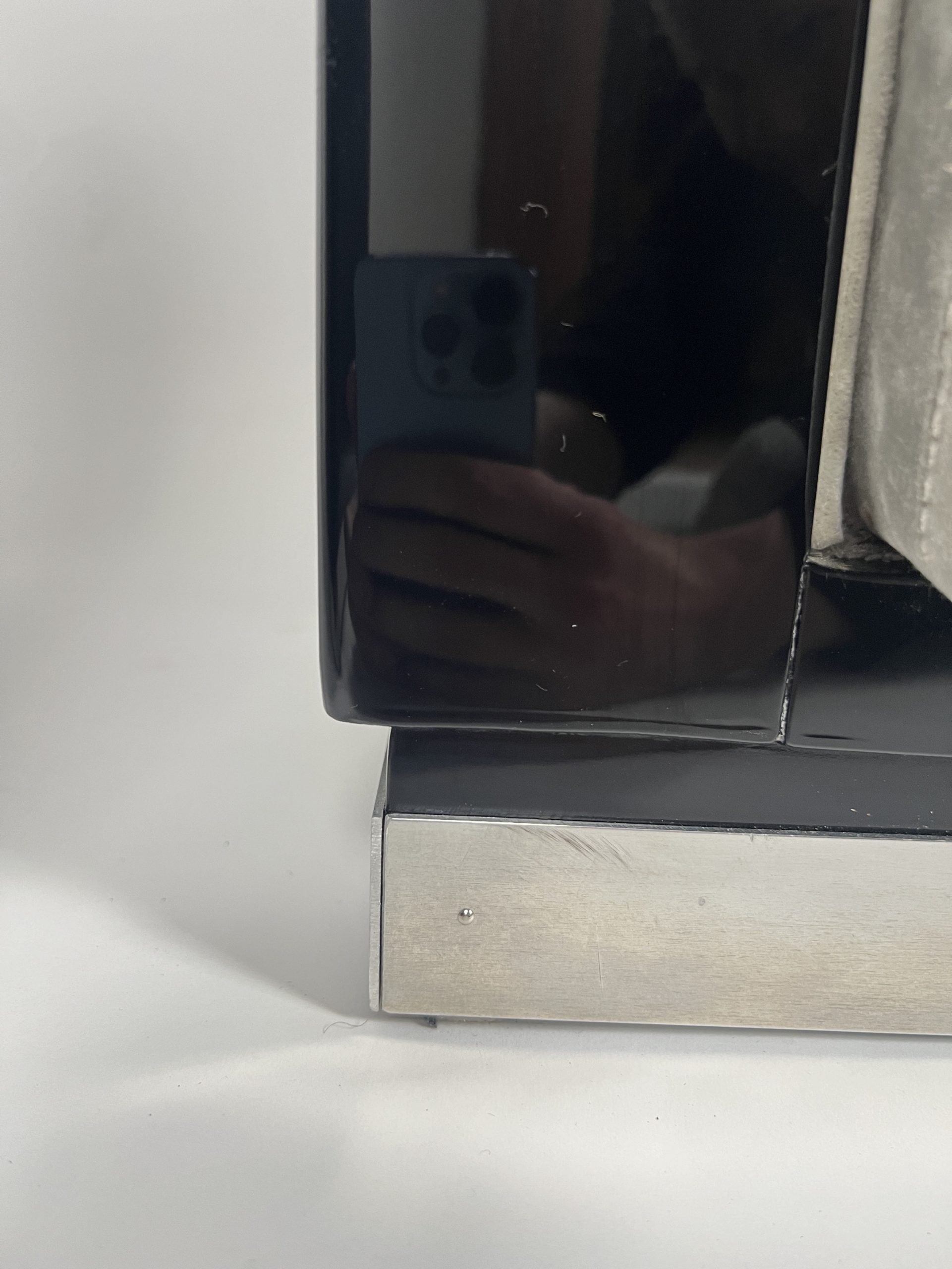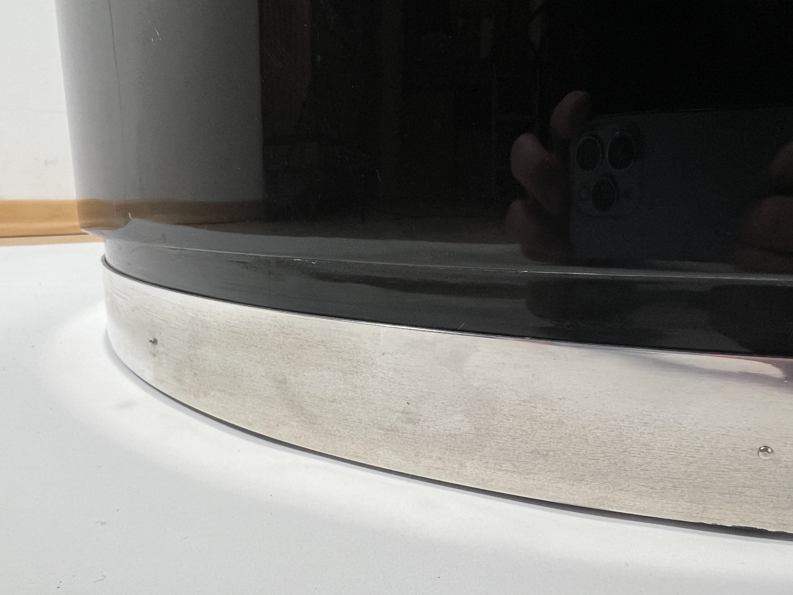 The base ends with a thick polished stainless steel trim.