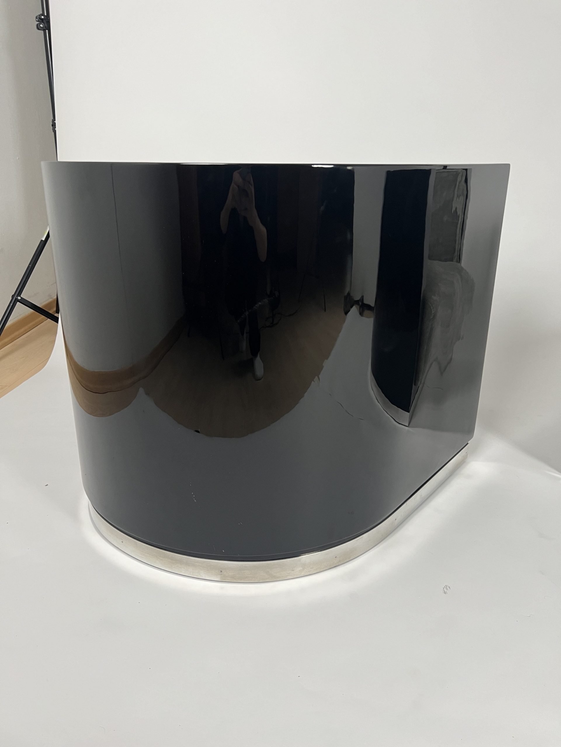 Curved wooden shell with black high-gloss piano lacquer finish.