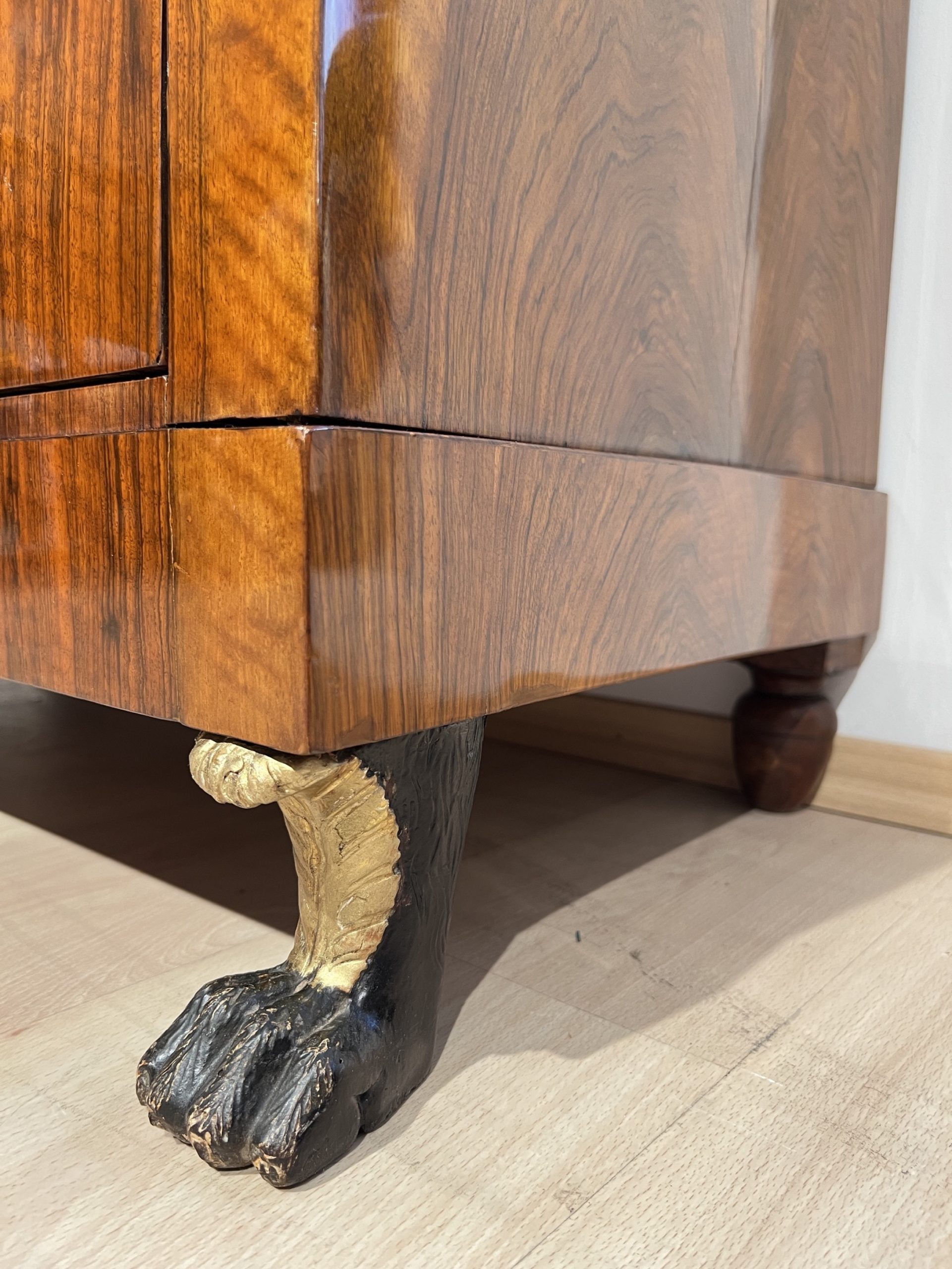 - At the front two carved paw feet with old patinated gilding and ebonization.