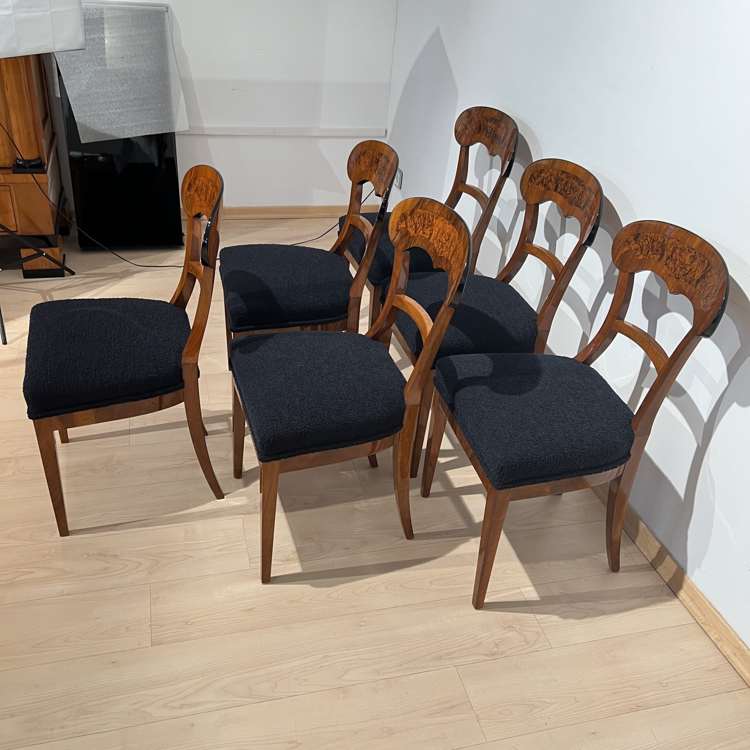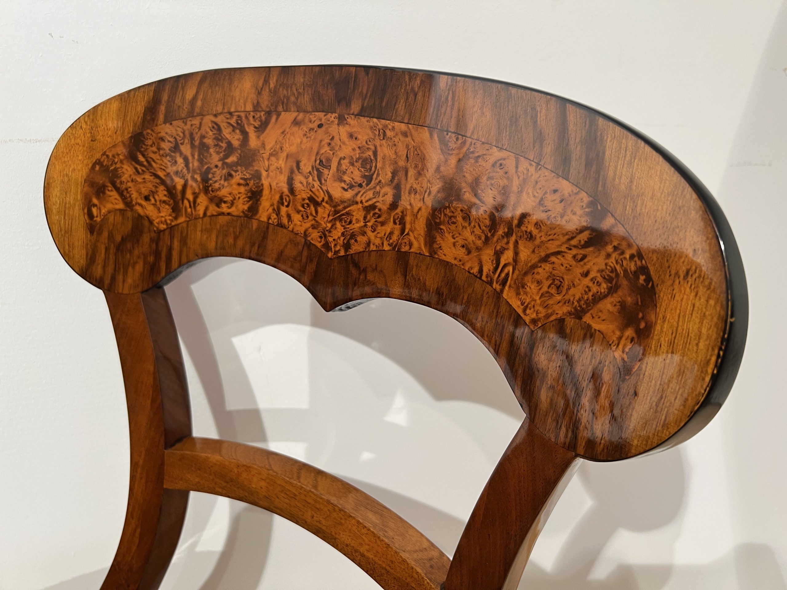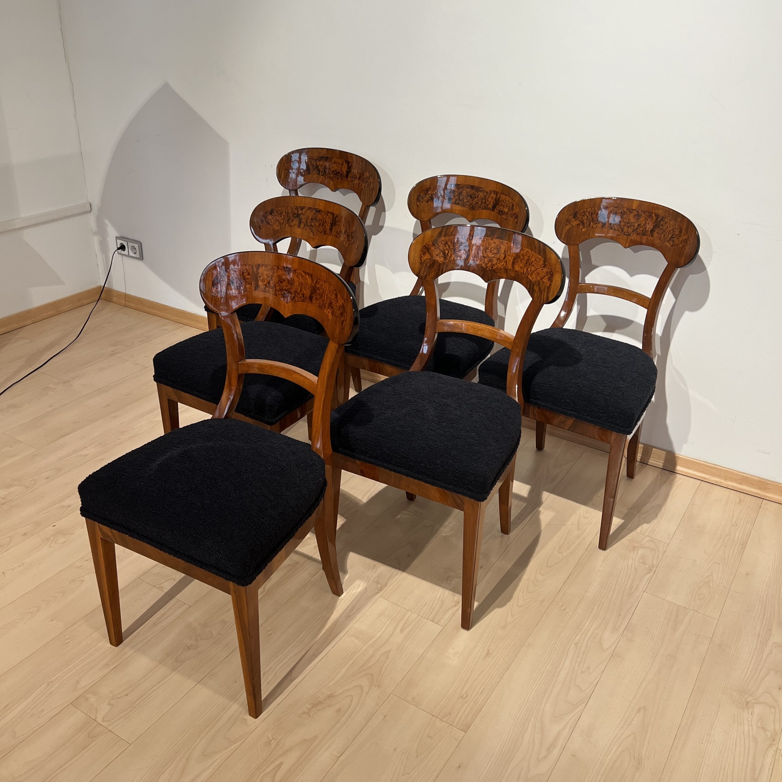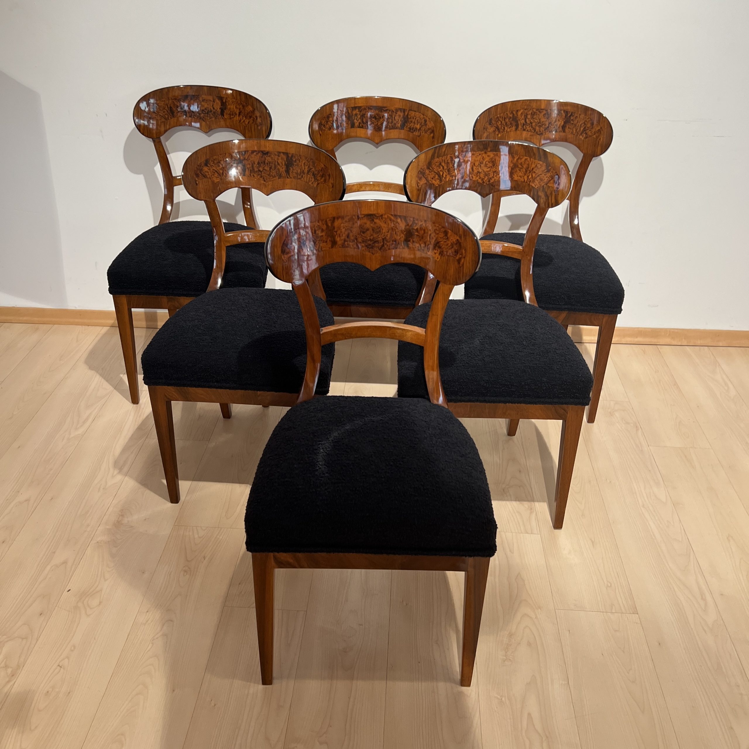 Beautiful set of six neoclassical Biedermeier shovel chairs (backrest in form of a shovel) from South Germany around 1840/50.