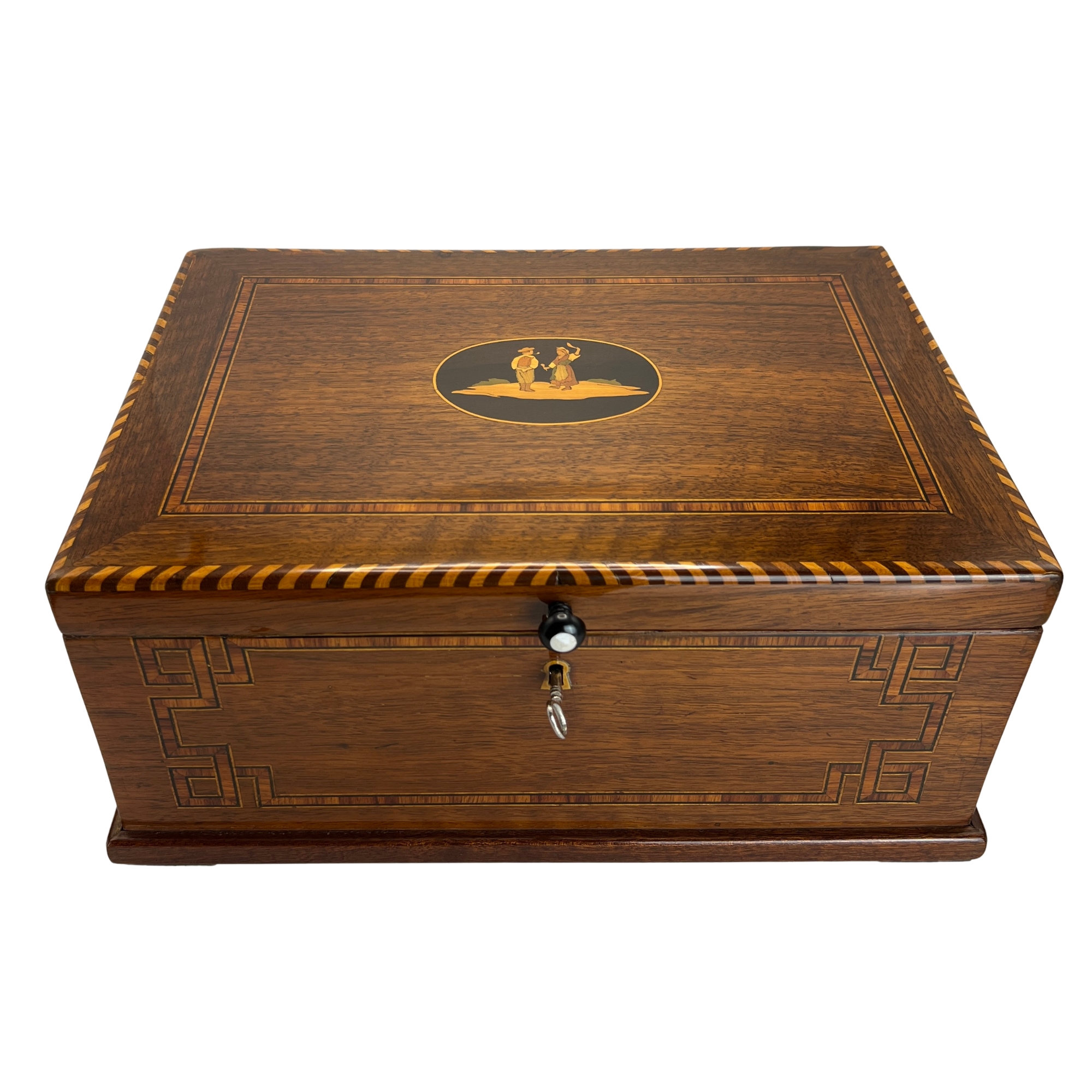 Large, high-quality late Biedermeier box in walnut with precious wood inlay and inlaid lid motif. From South Germany circa 1850.