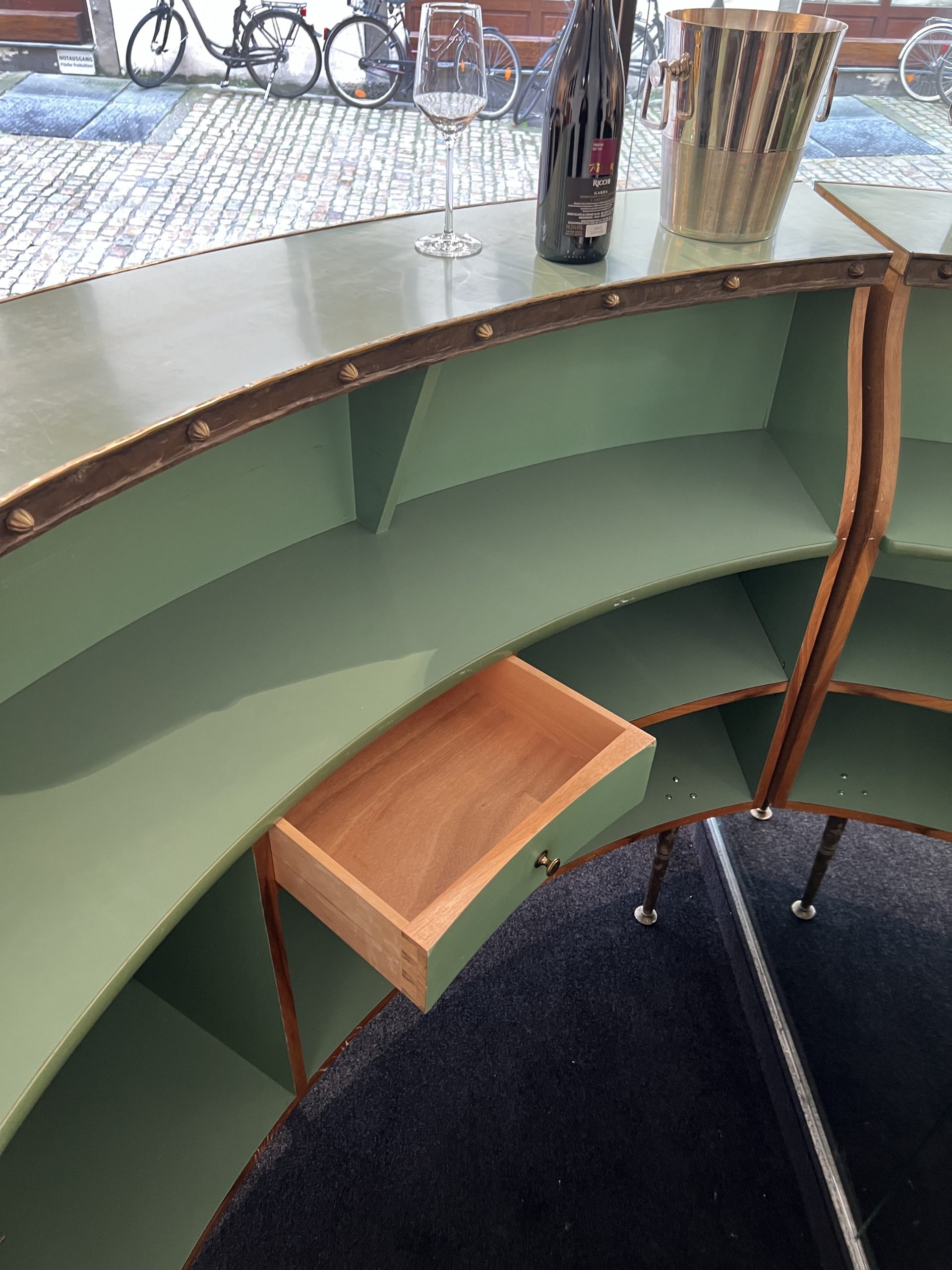 Beautiful, high-quality mid-century home bar or corner bar in teak, brass, and green linoleum, from South Africa circa 1950.