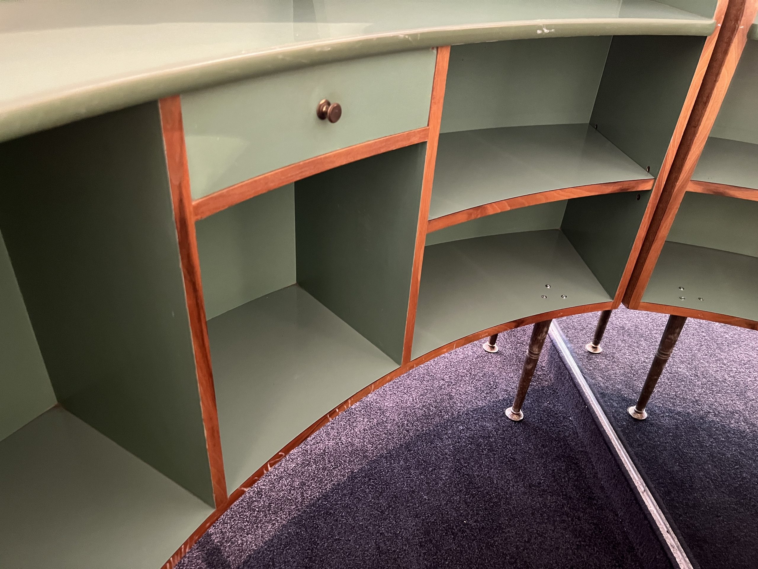 - Curved shape, designed as a corner bar to be placed against the wall with the left side (chipboard on the outside). The right side facing the room is made of teak. At the front, there are many stacked wooden slats with visible grain, probably made of teak.