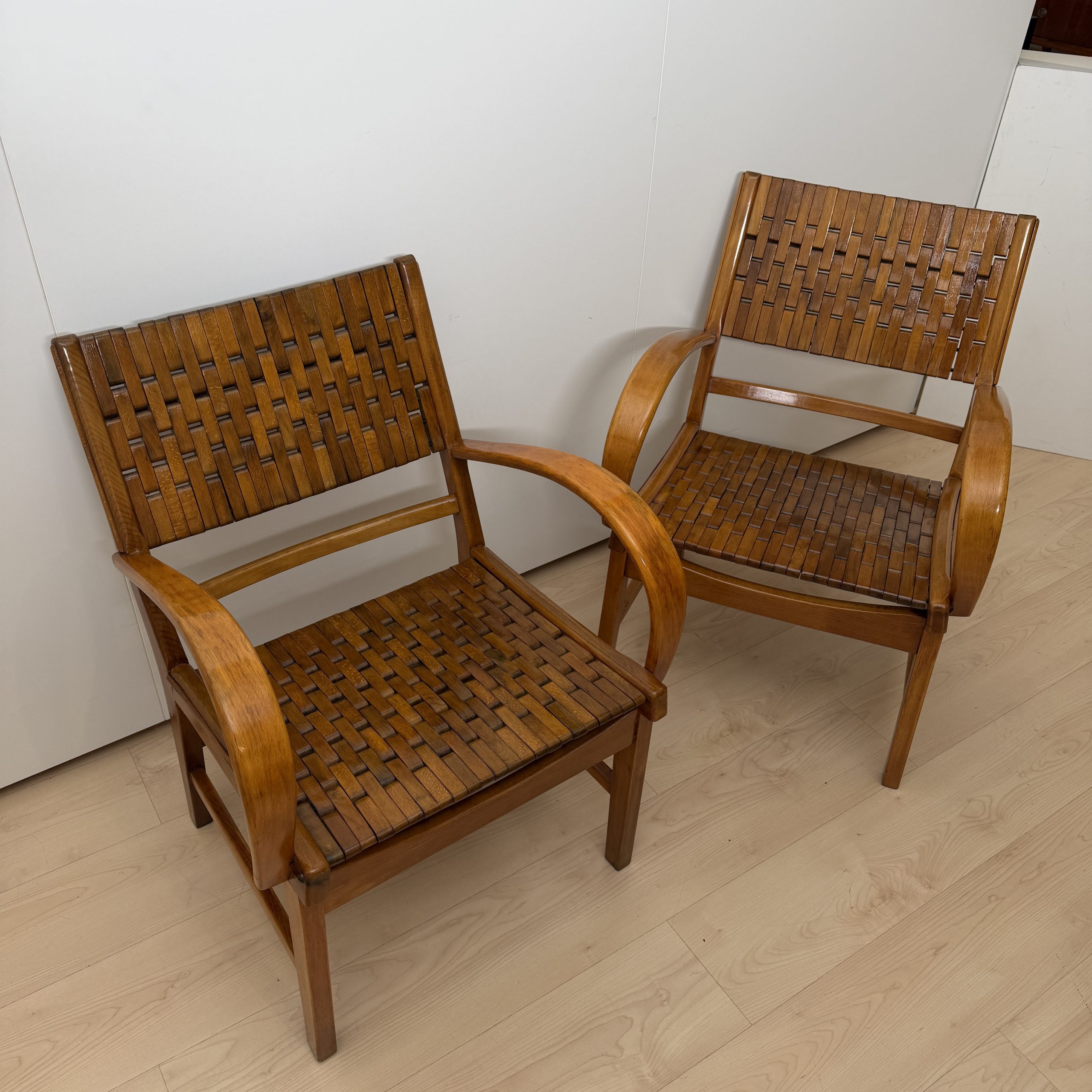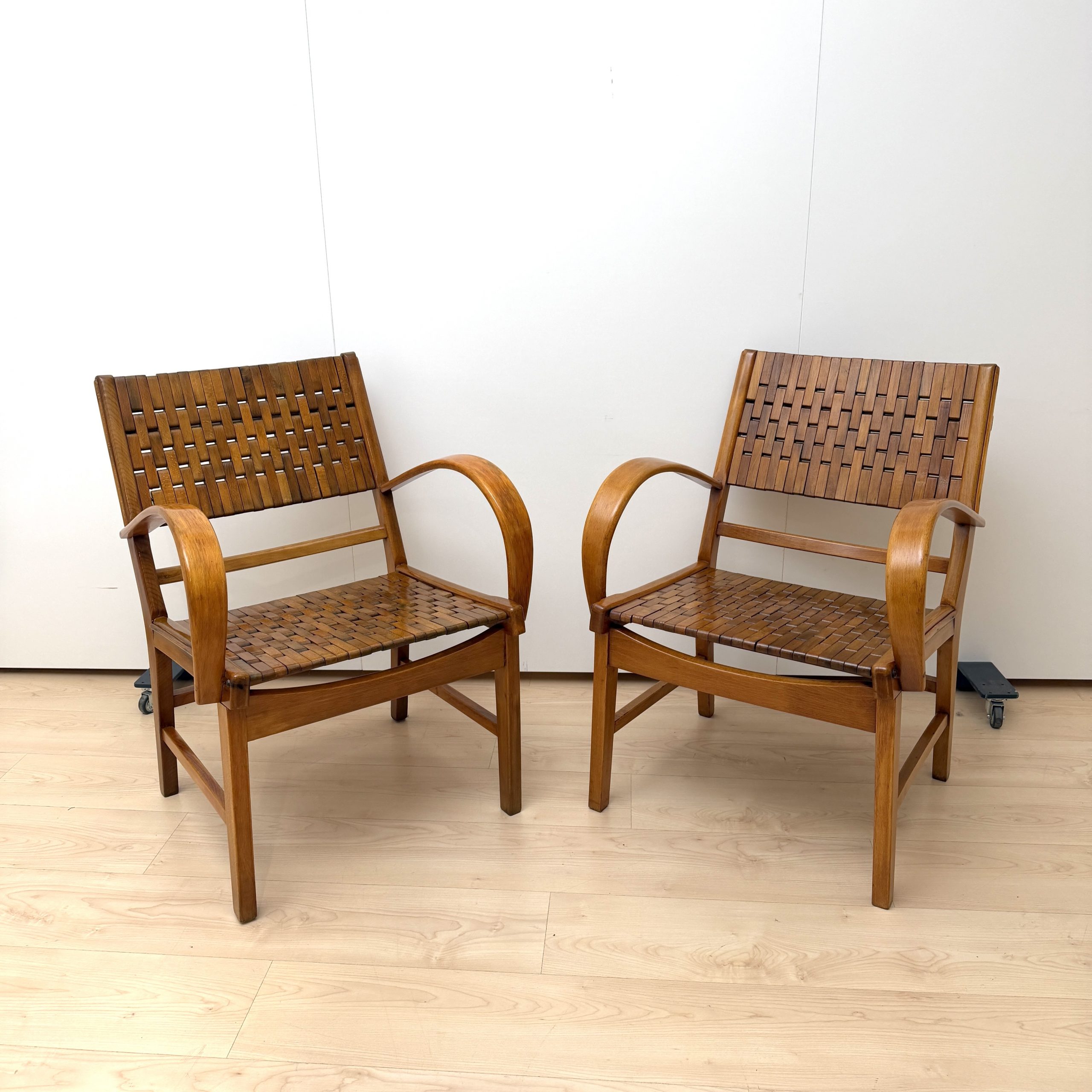 Set of two Bauhaus / Mid-Century armchairs with bent armrests by Gelenka from Germany, circa 1950.