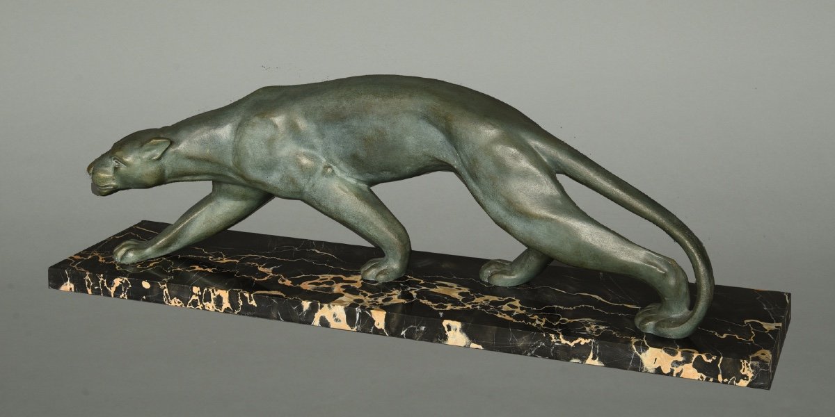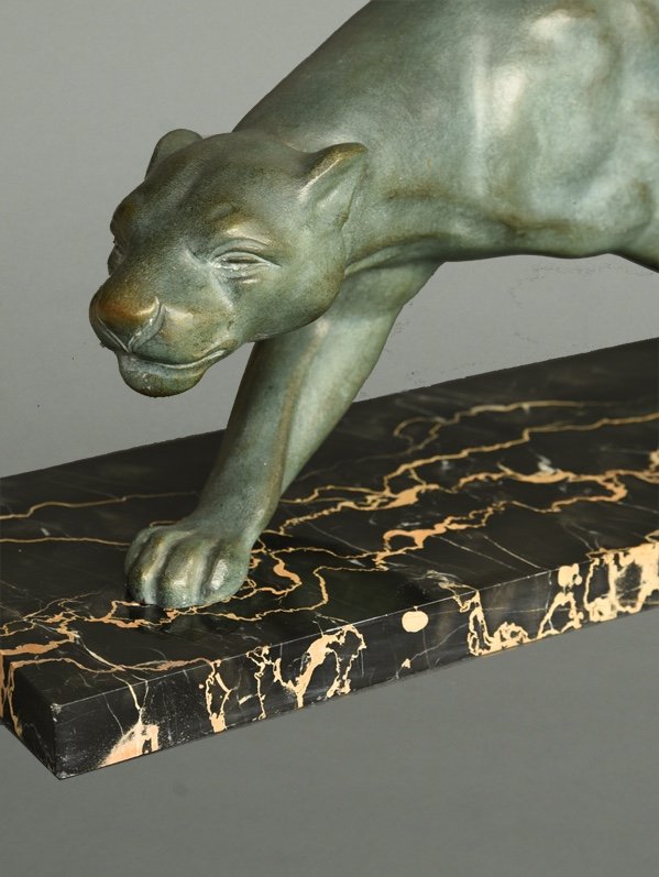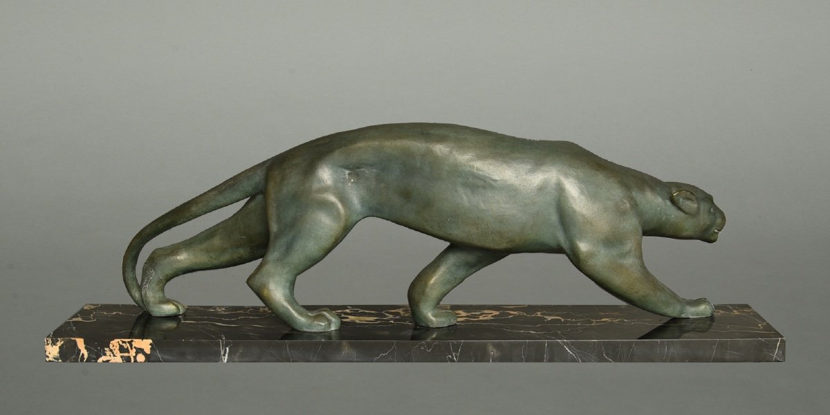 Imposing, large and heavy Art Deco Bronze Panther Sculpture by Secondo from France circa 1930.