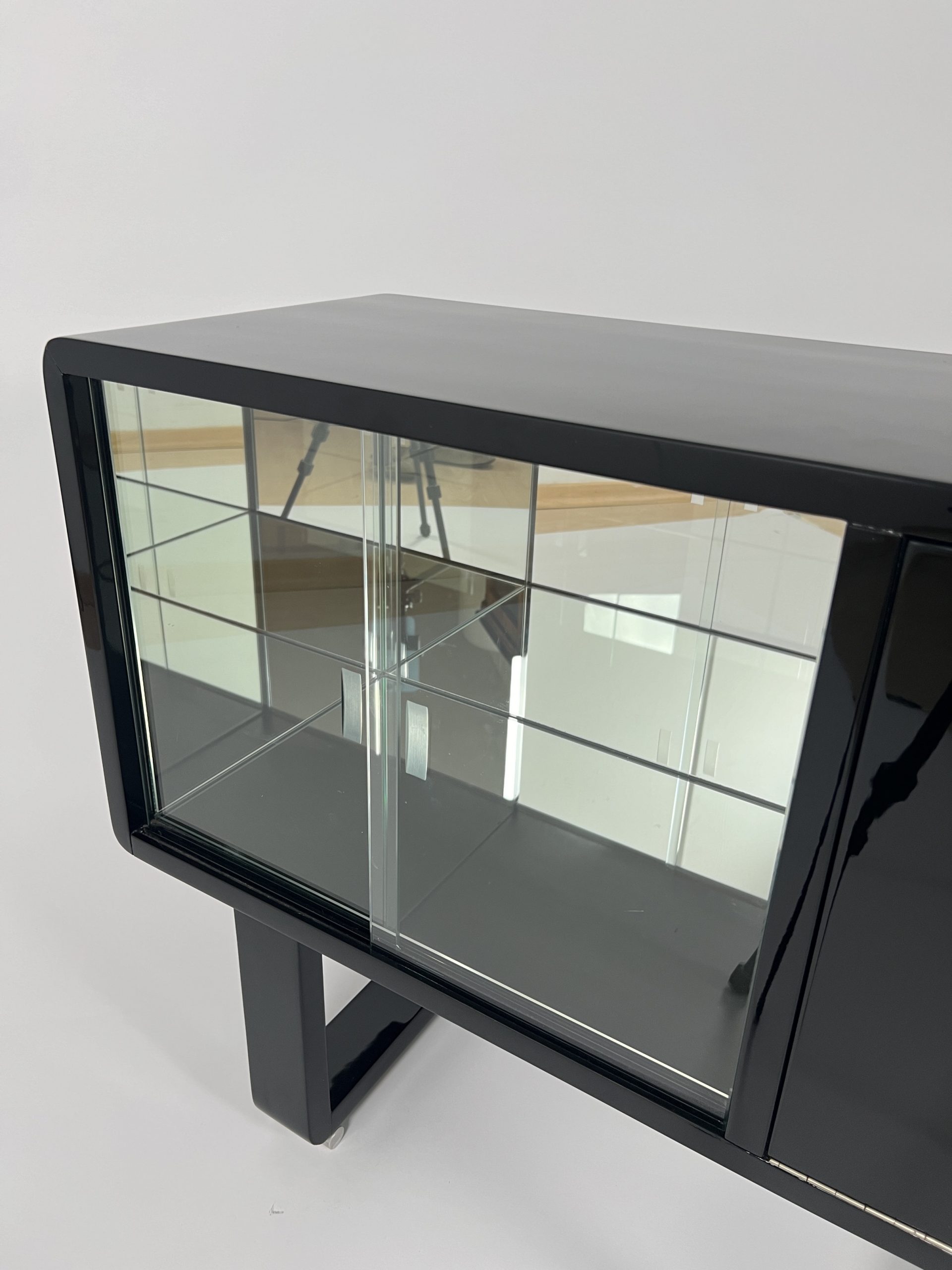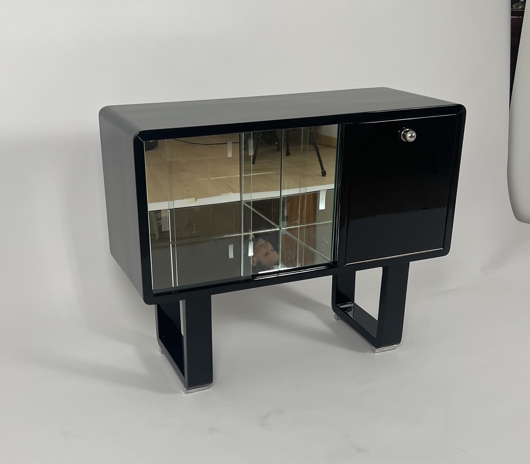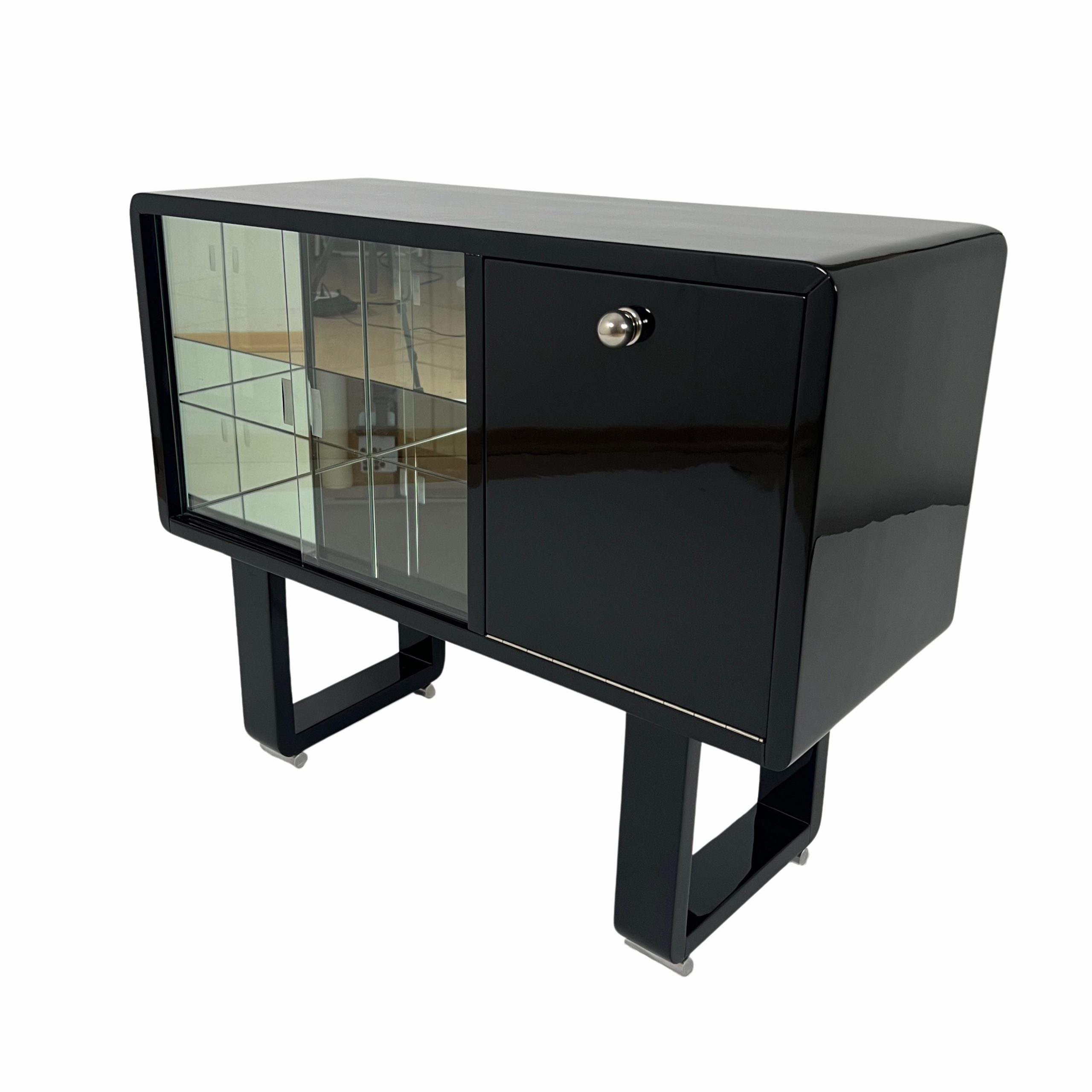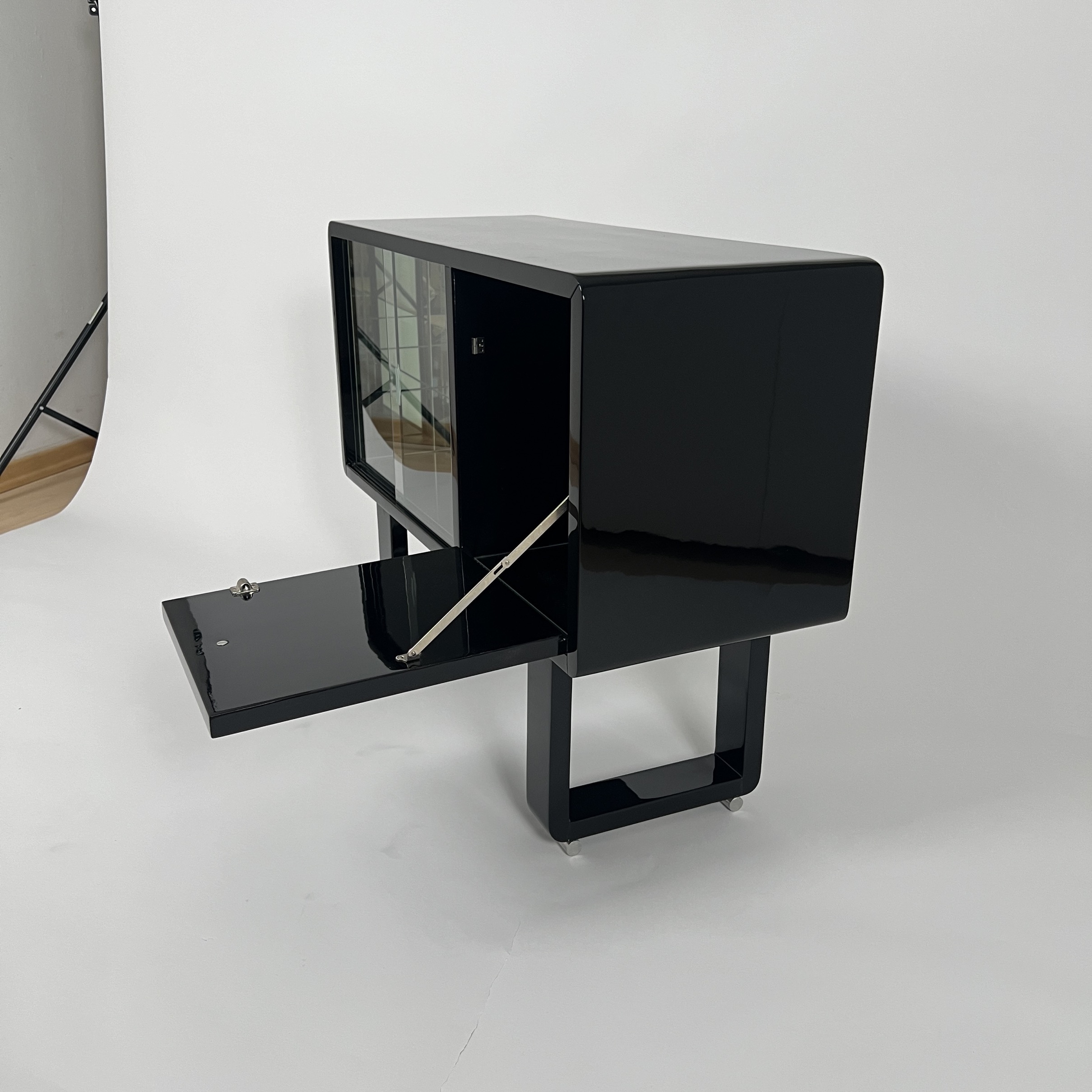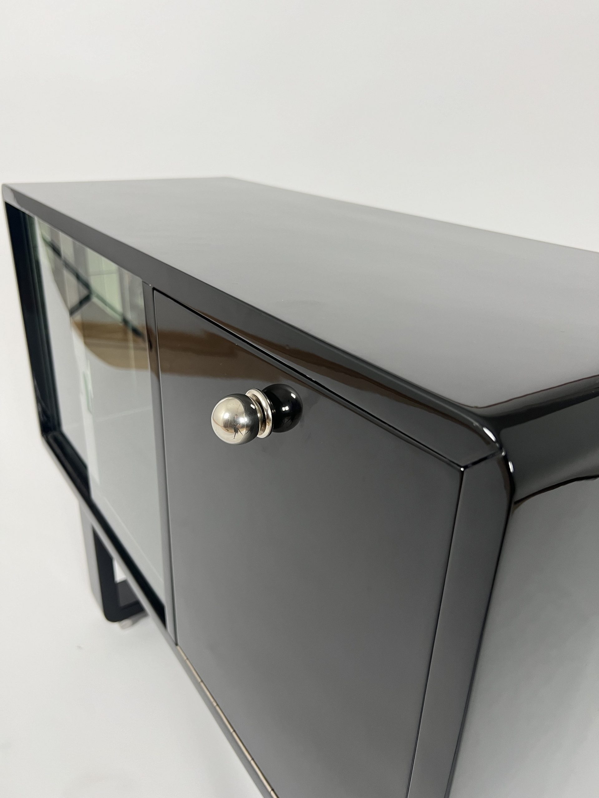 • Black piano lacquer on wood. Front right with a flap and chrome-plated ball knob.