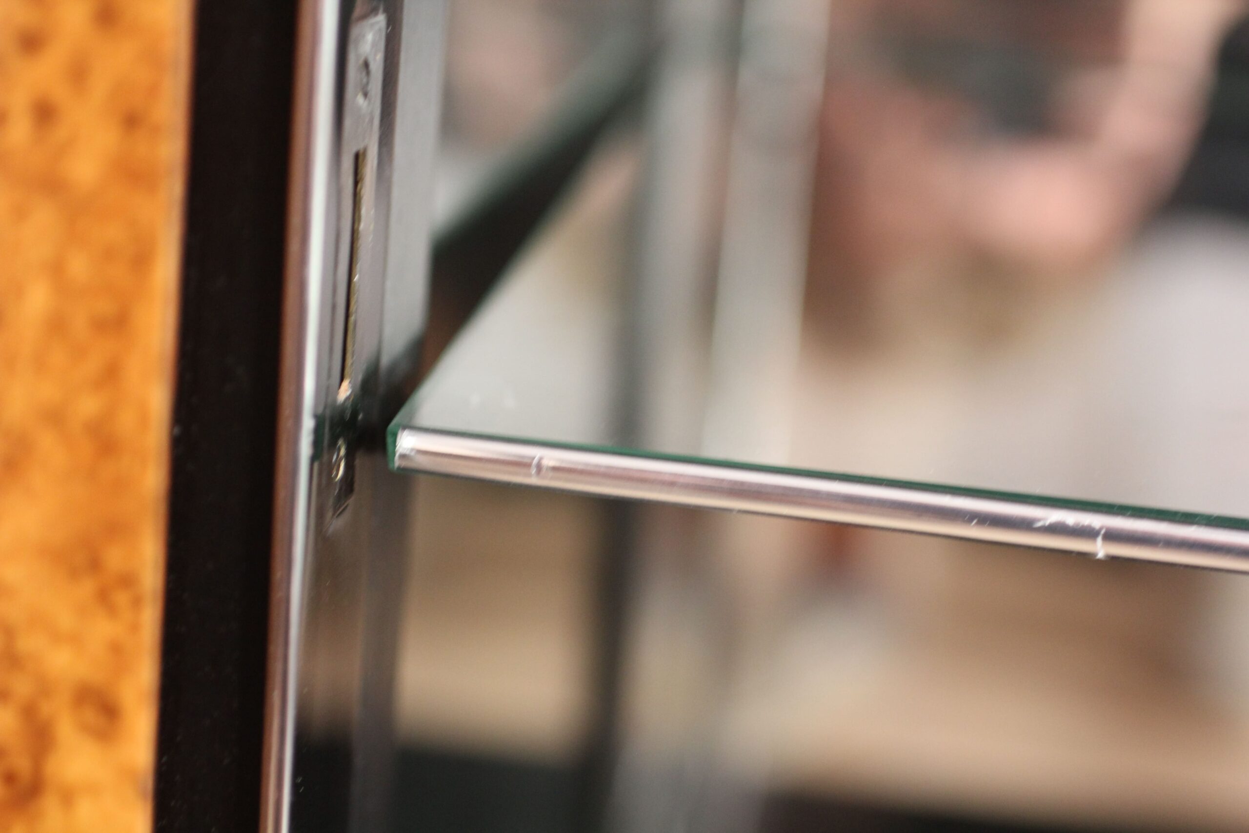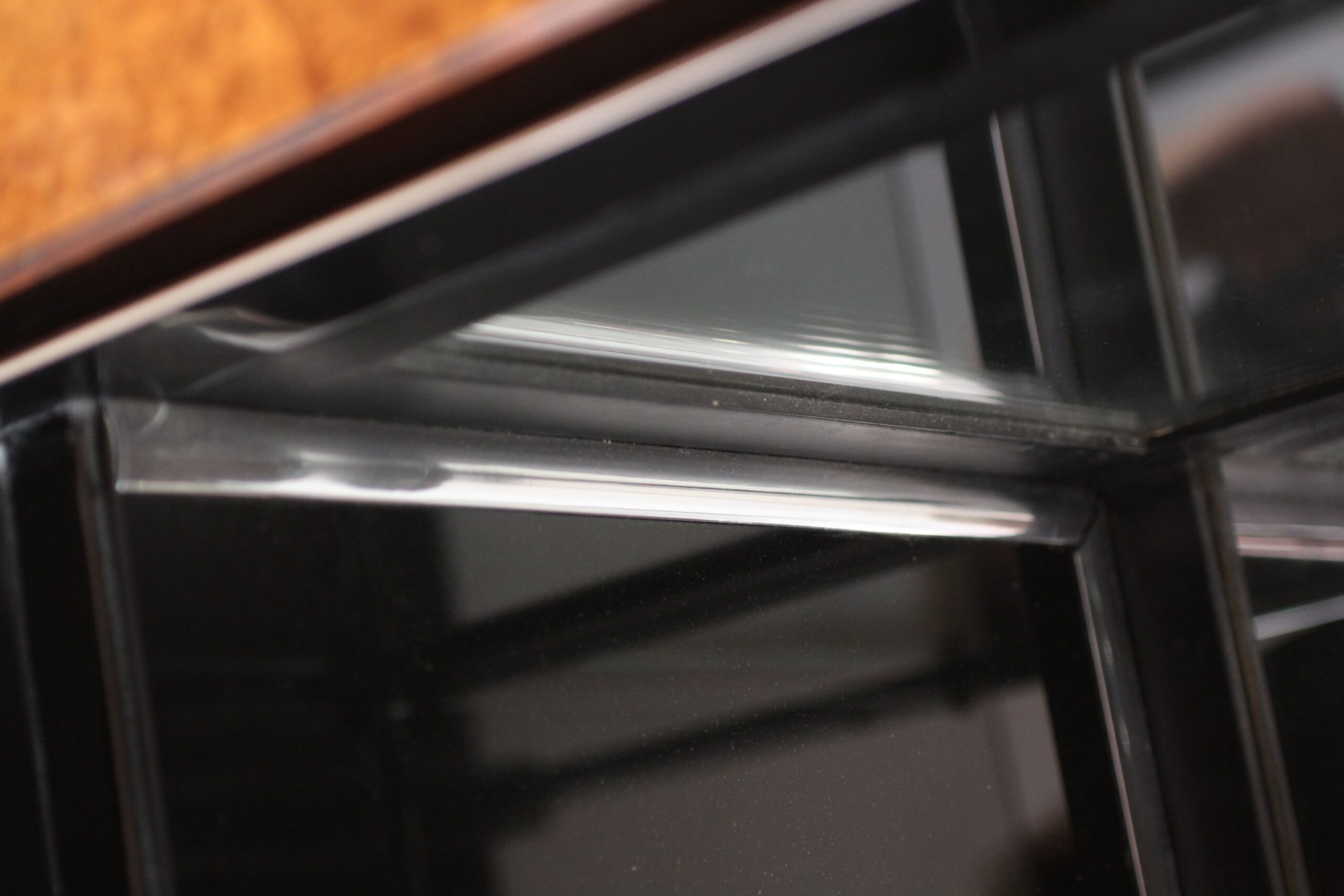 - The base, legs, cornice and parts of the glass dorr frame are ebonized/black lacquered. Several chromed metal fittings and decorative trims attached.