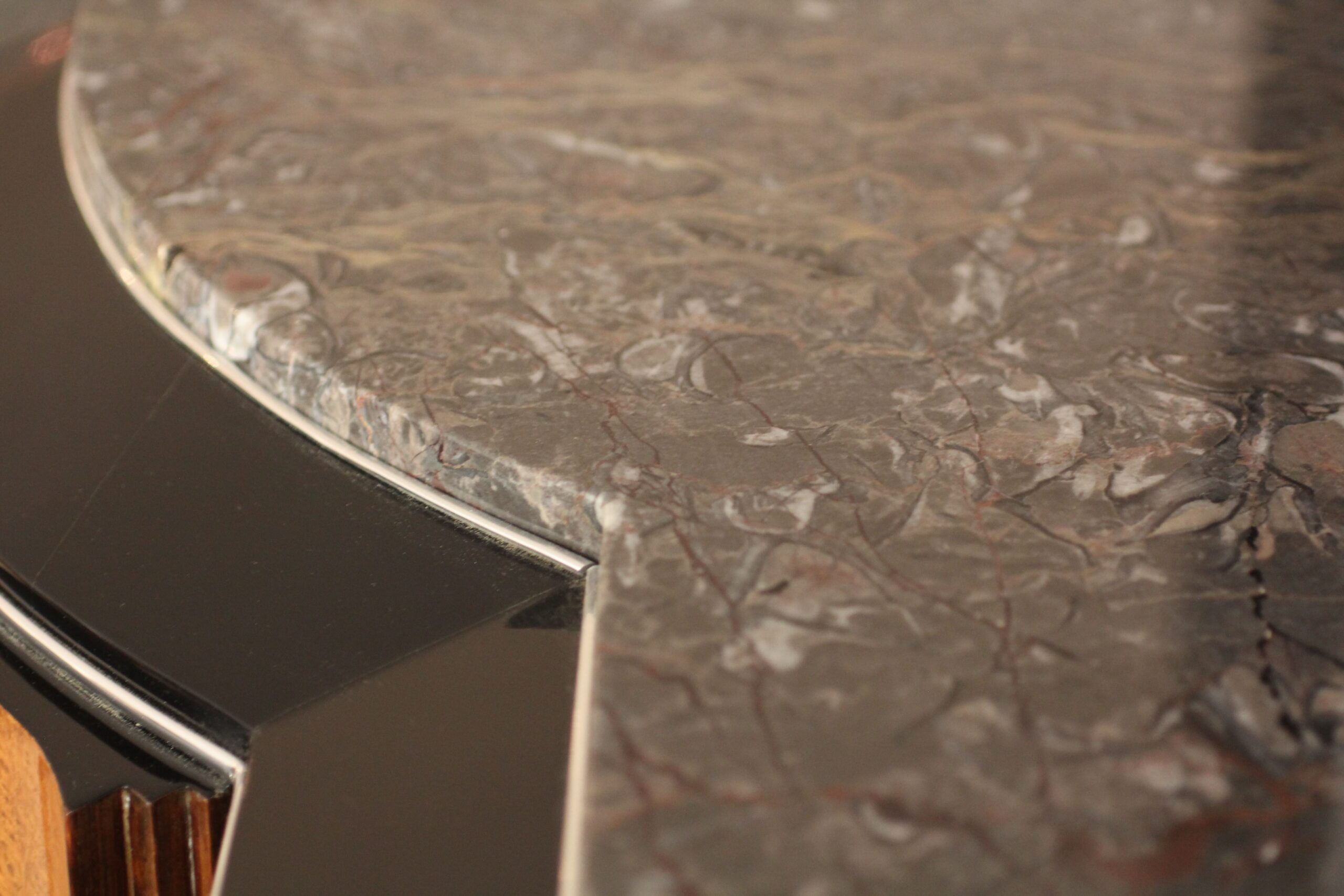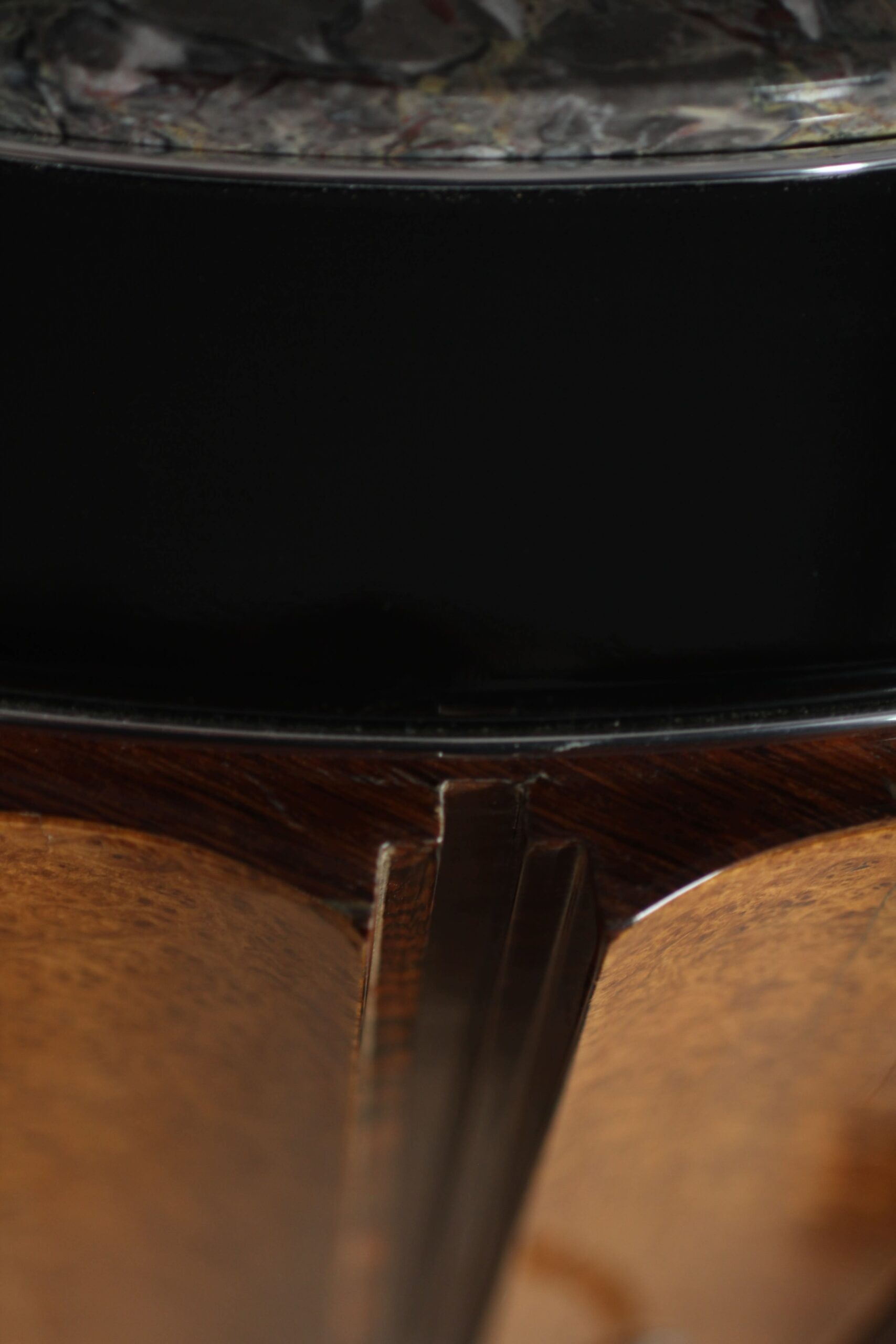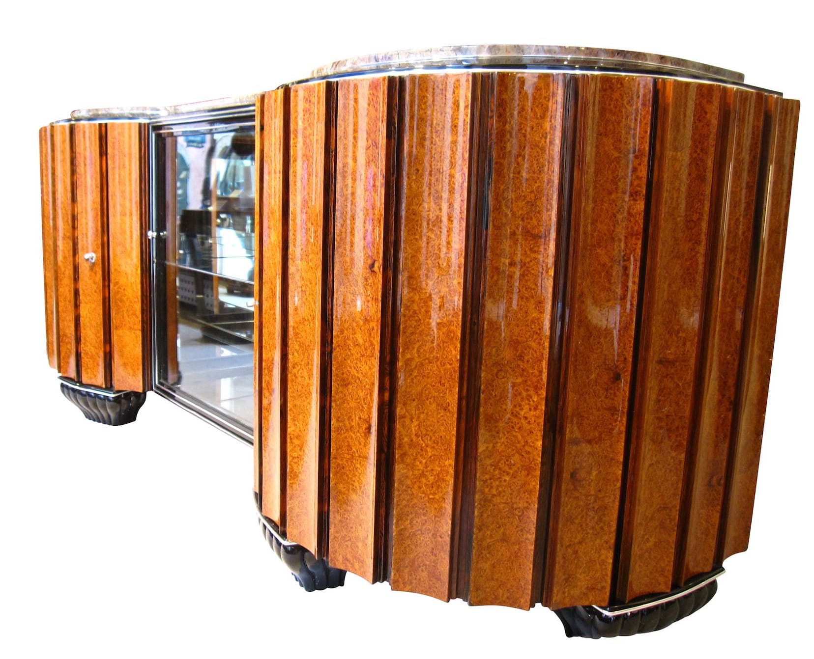 - Amazing big concave fluted or cannelured doors, which can be folded out widely and are veneered in Amboyna burl wood as well as Rosewood veneer in-between. The insides of the doors are veneered in Rosewood and polished. Interior with one oak shelf on each side.