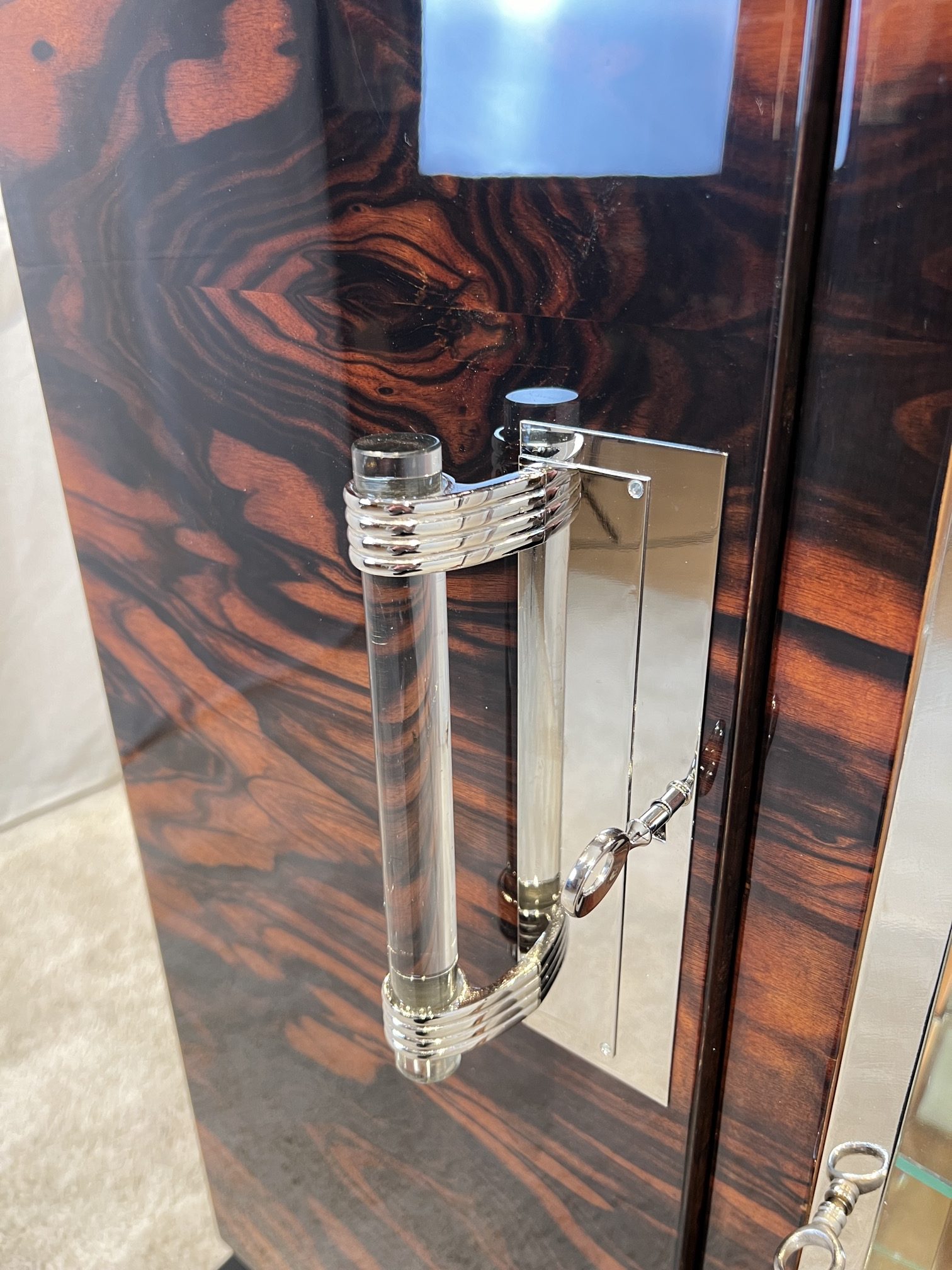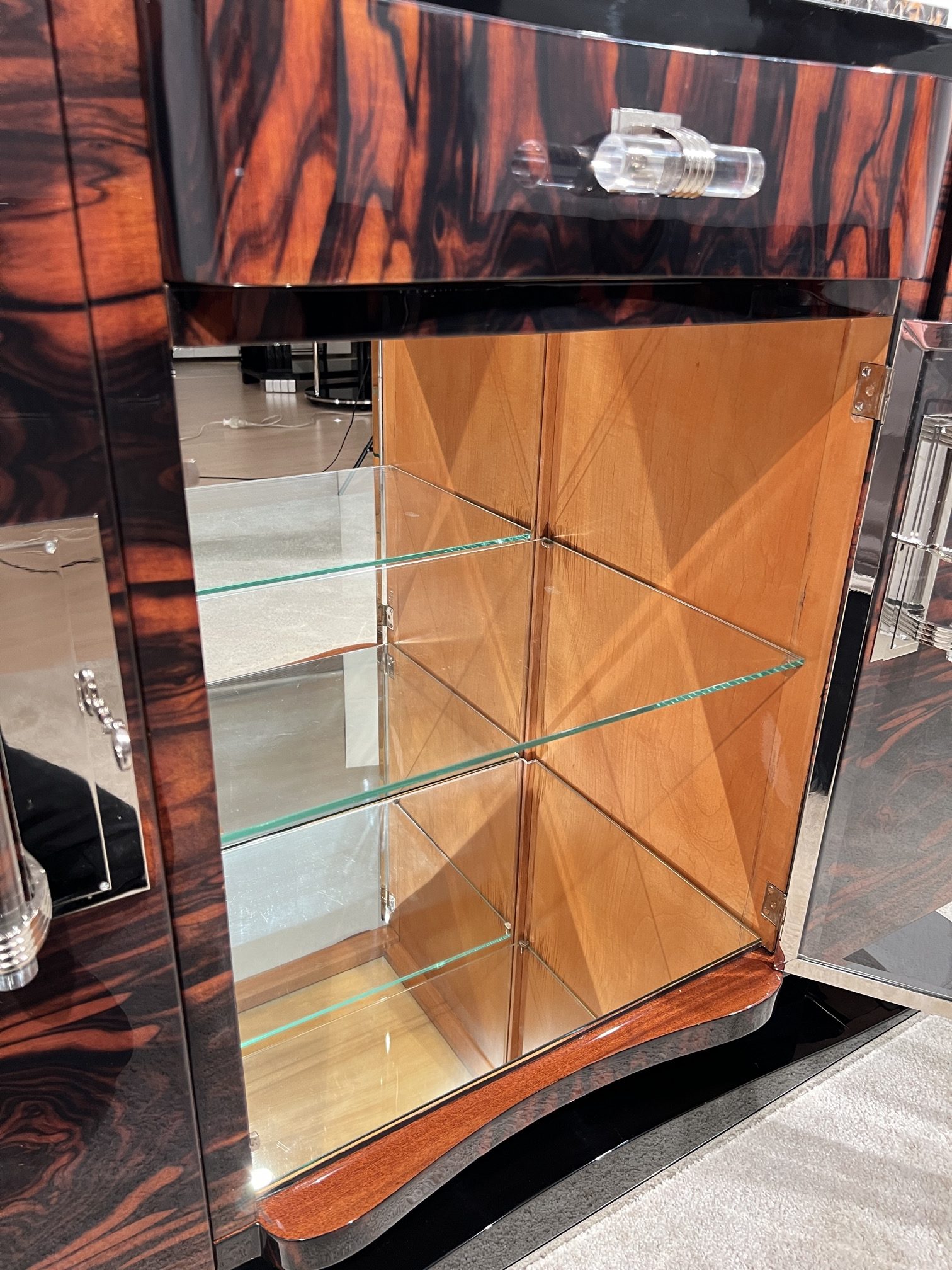 - Two doors on the inside are veneered in bird’s eye maple. In the middle there is a display case or bar compartment behind a door with metal frame and original facet-cut glass. Mirrored at the bottom and back, inside on the sides in maple, the compartment has one glass shelf.
