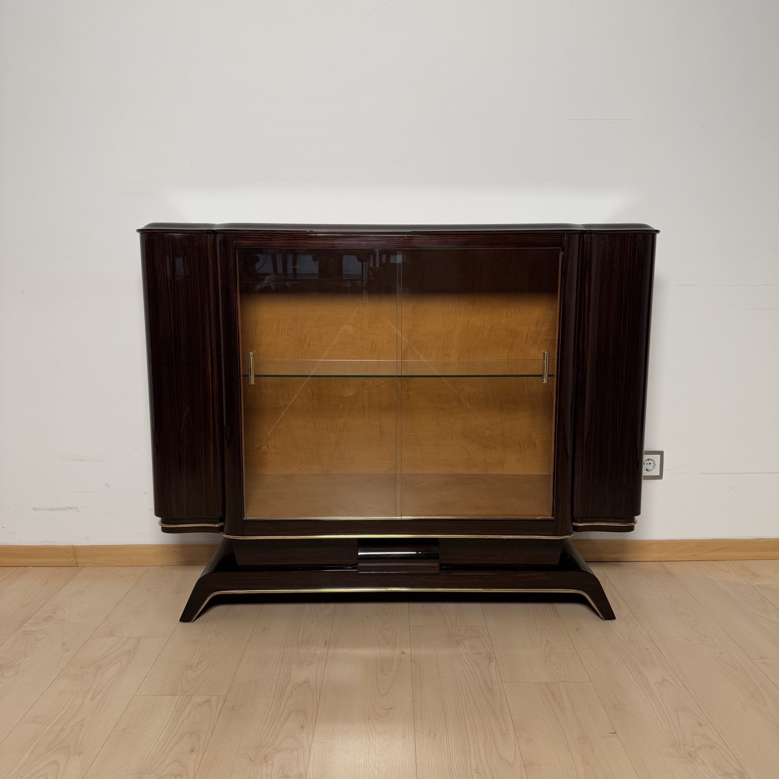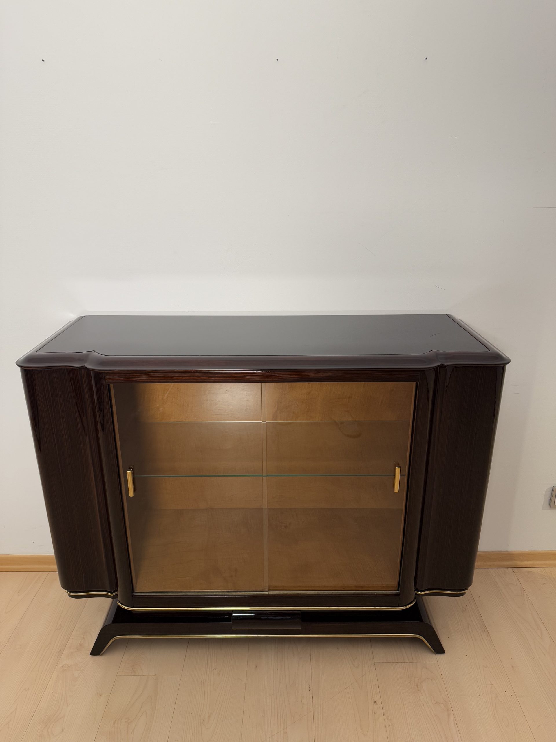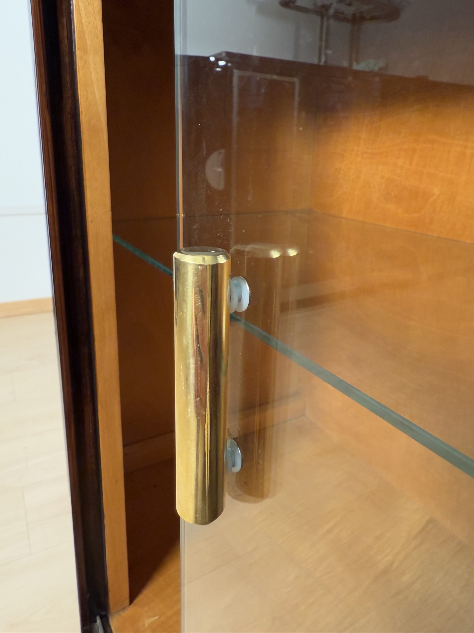 • Interior in light maple veneer with glass shelf and two sliding glass doors with brass handle.