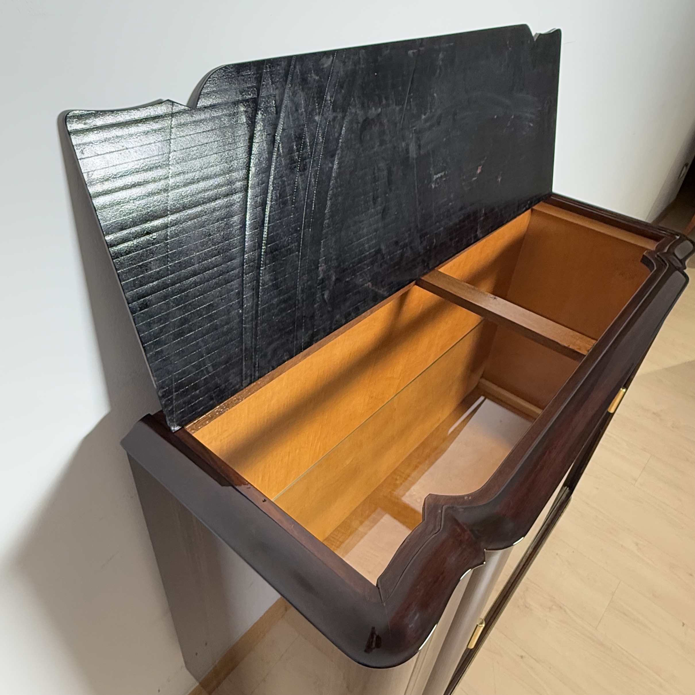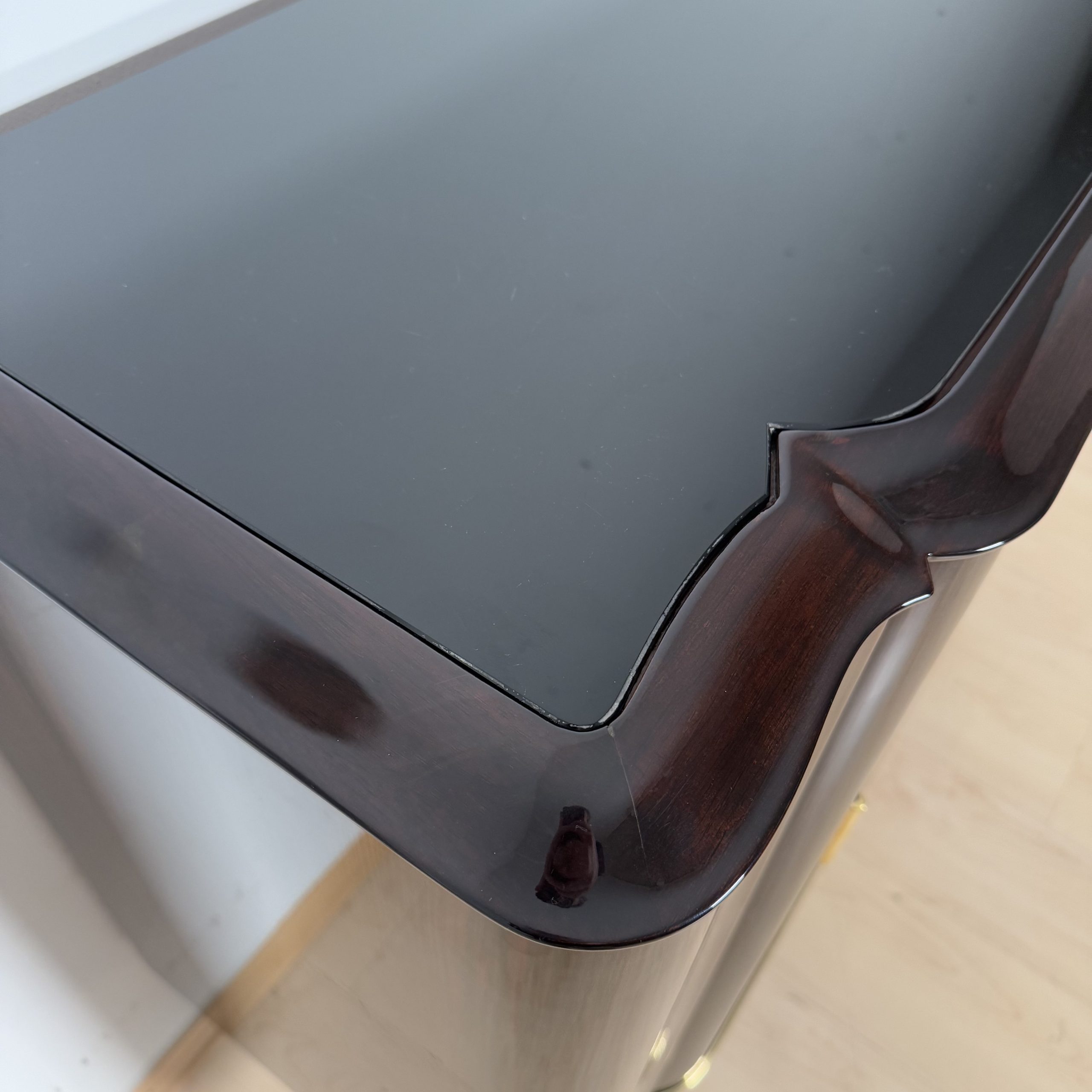 • Above an inlaid, original, slightly scratched black glass top in the old Lackobello process.
