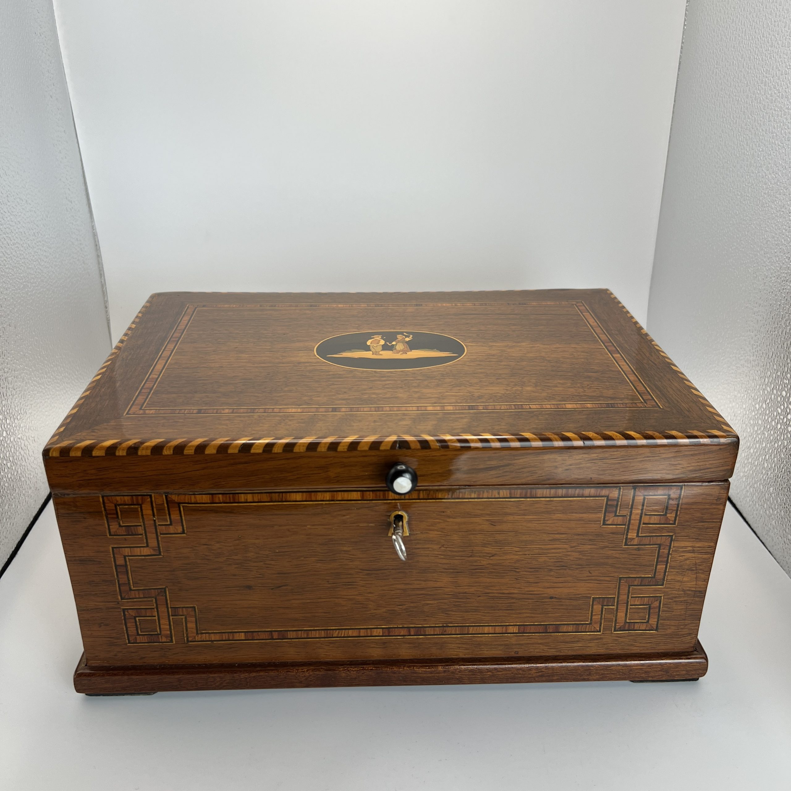 Large, high-quality late Biedermeier box in walnut with precious wood inlay and inlaid lid motif. From South Germany circa 1850.