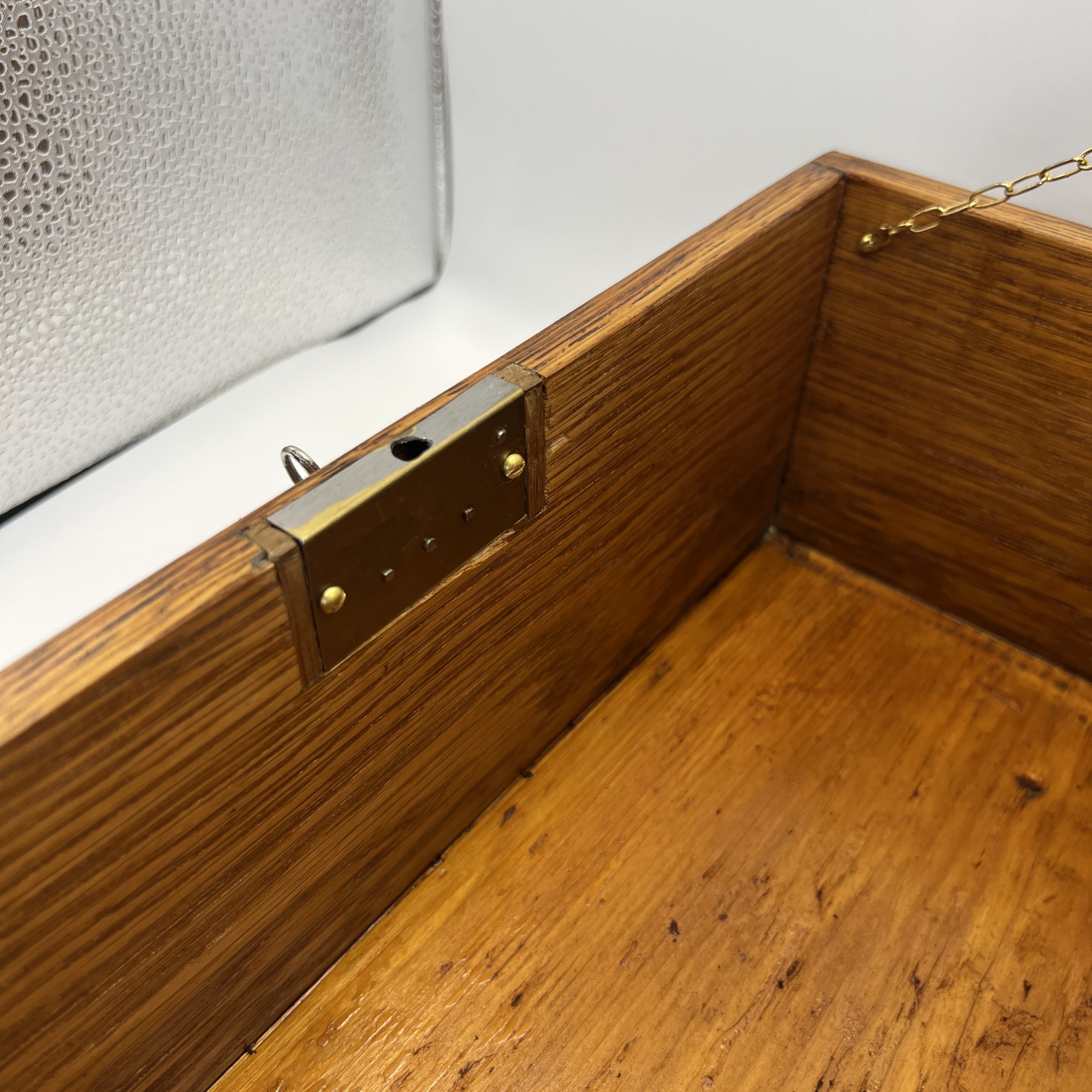 • Inlaid brass key crest, a black knob with a white dot on the lid. Working iron lock, brass hinges, and chain.
