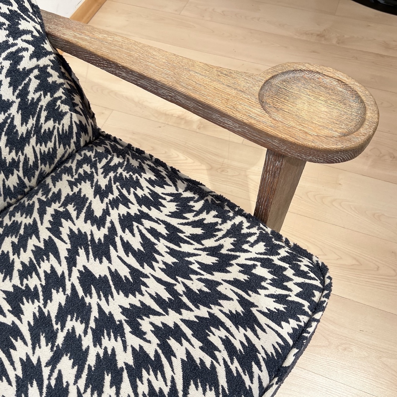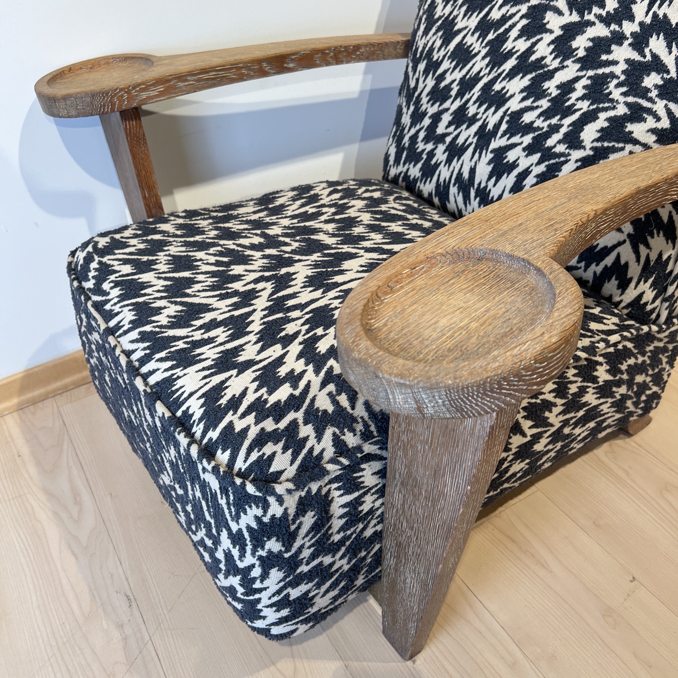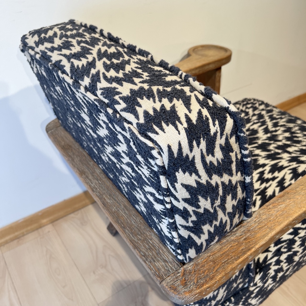 - Newly upholstered with a cozy modern fabric by Kirkby Design (blue boucle points on a beige background)