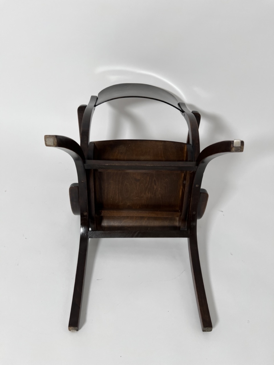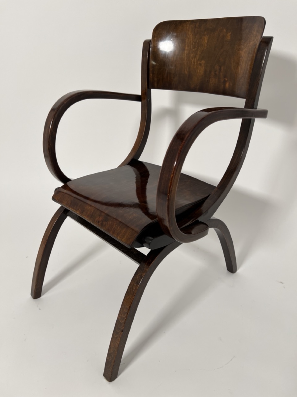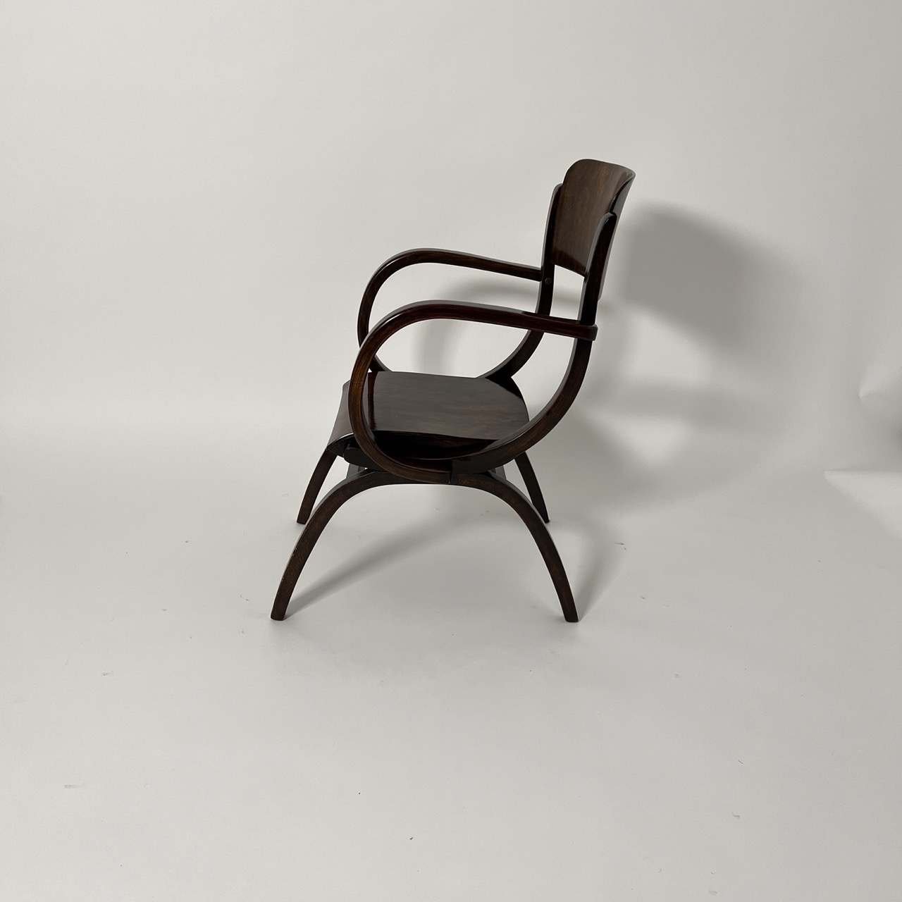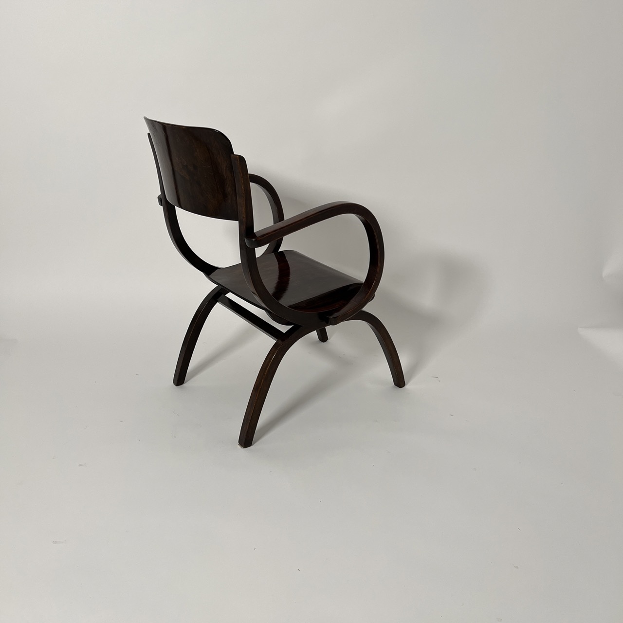 Original Bauhaus period armchair in stained beech wood with curved armrests.