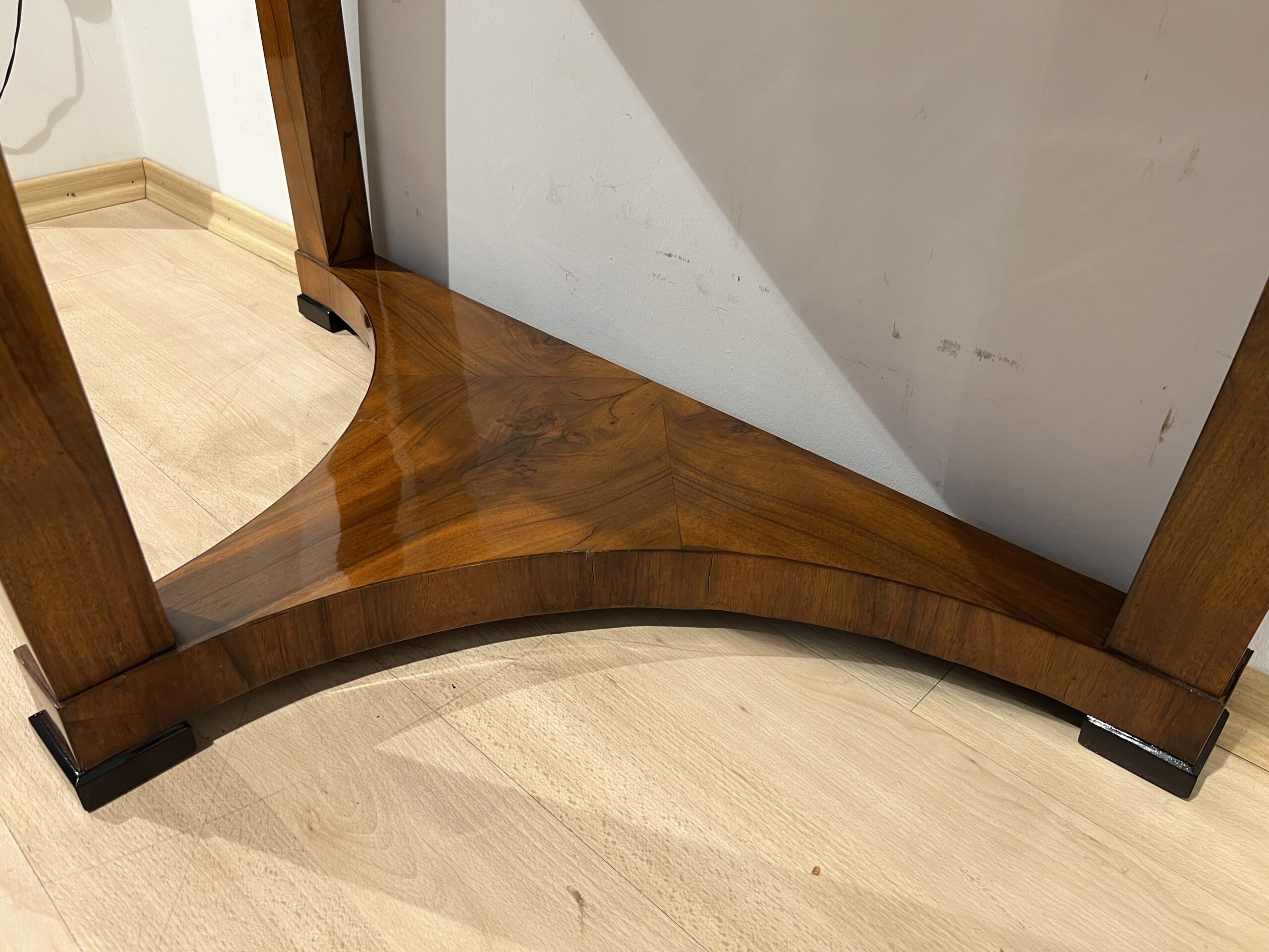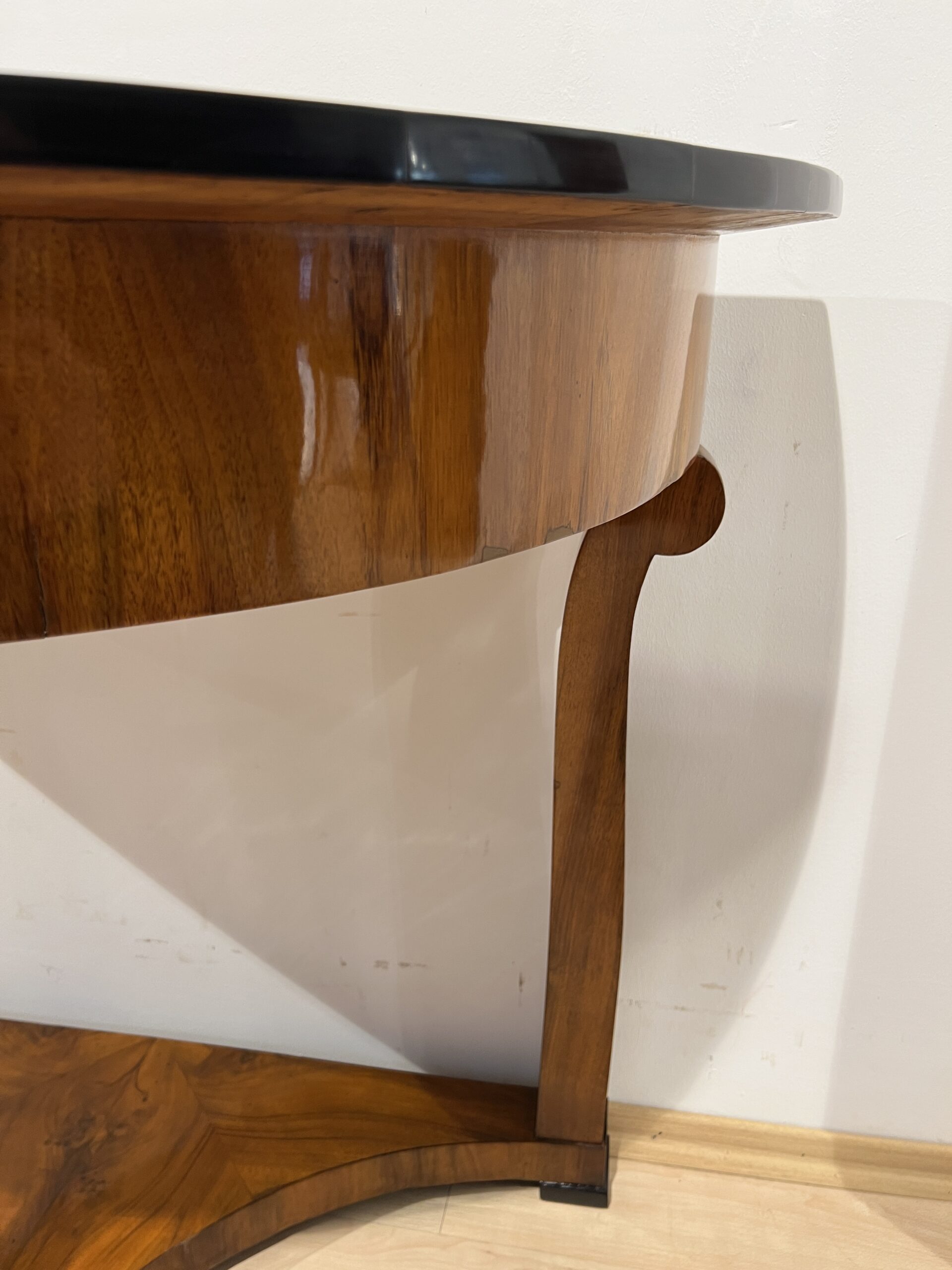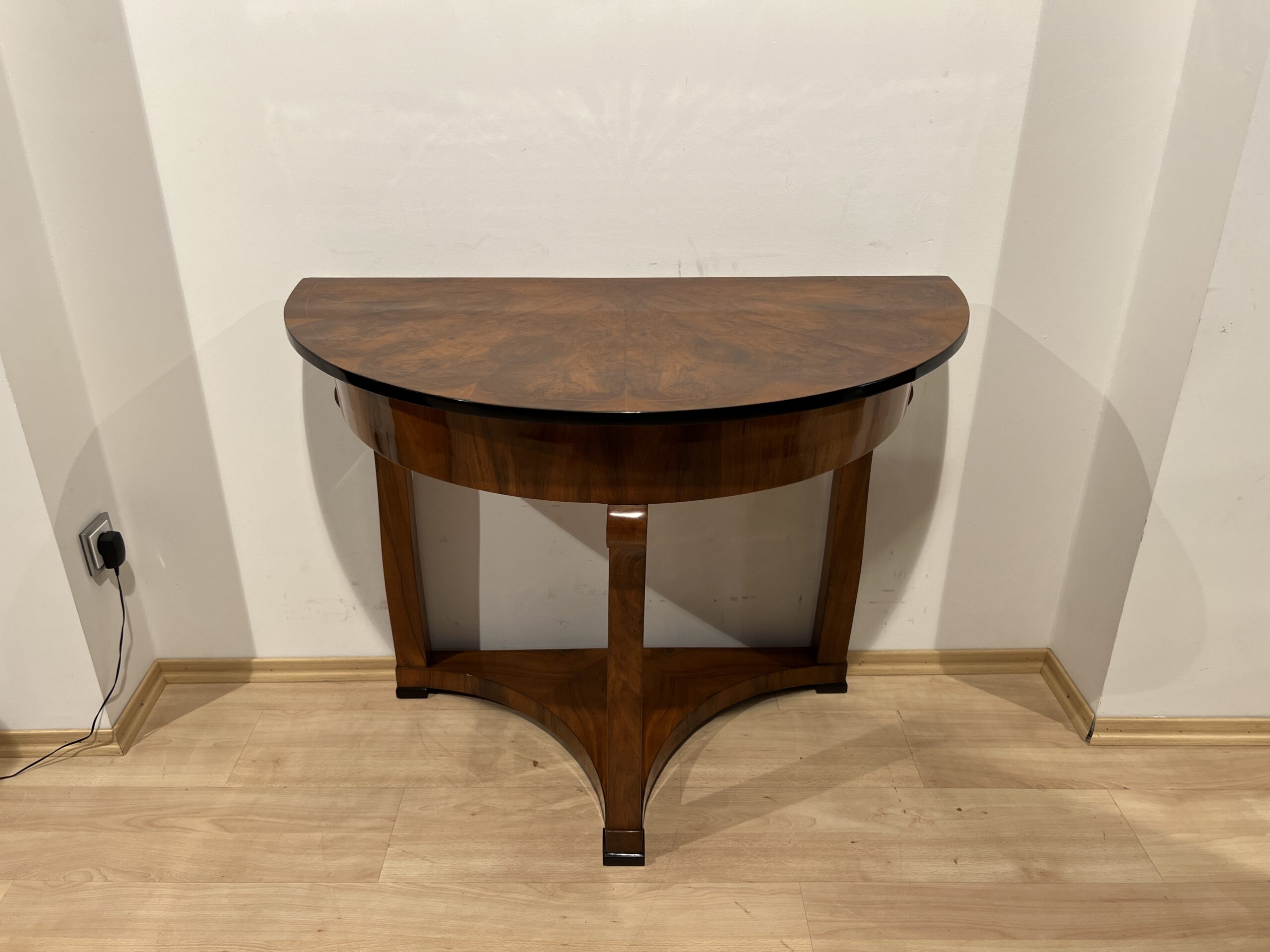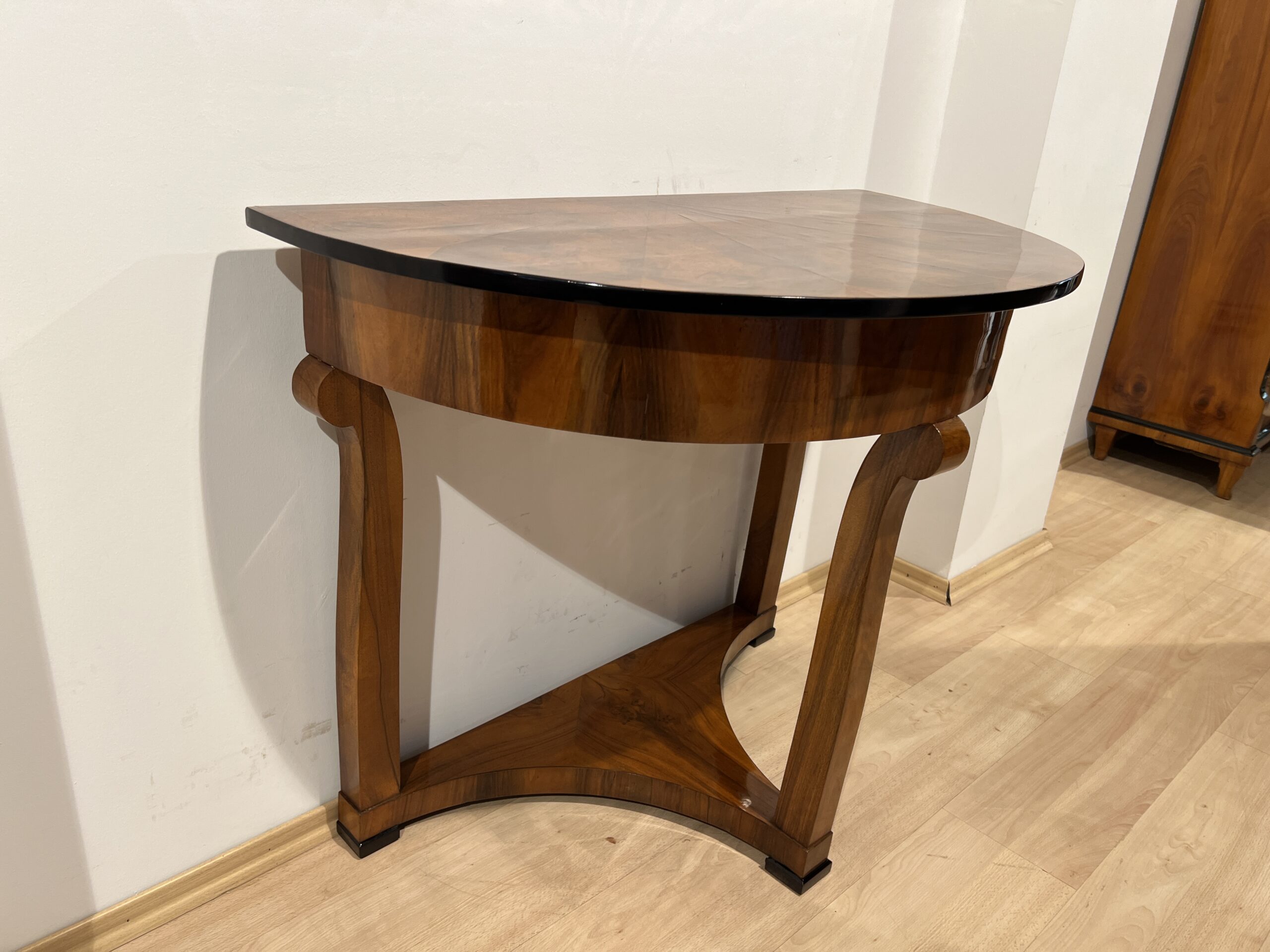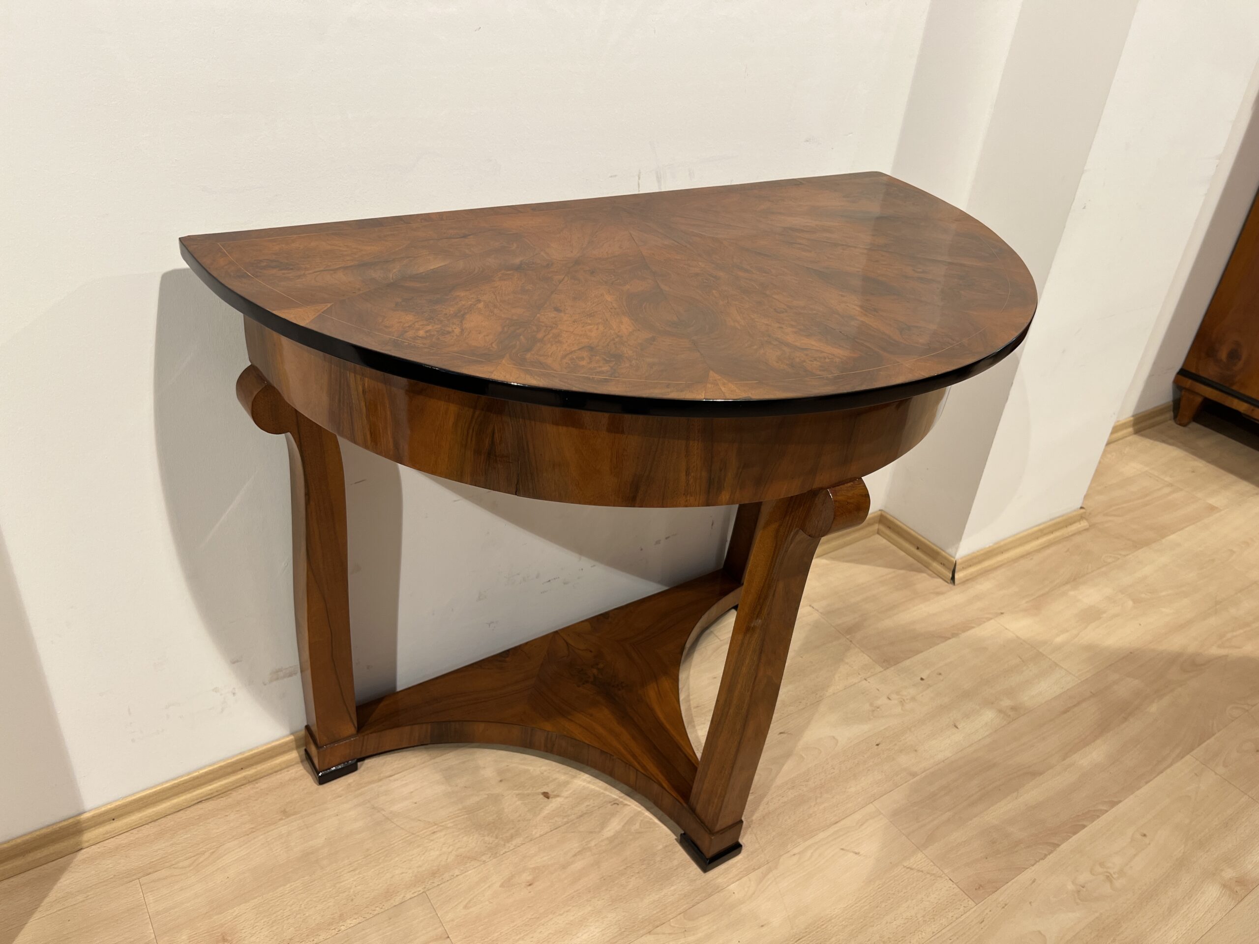 Three-legged Biedermeier Demi-lune console table in walnut veneer from Austria circa 1830.