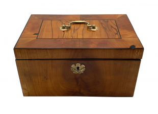 Verkauft WeiterlesenSehr schöne Biedermeier Schatulle Kirschbaum furniert und Ebenholz eingelegt Originaler Messinggriff Schloss nicht mehr vorh…