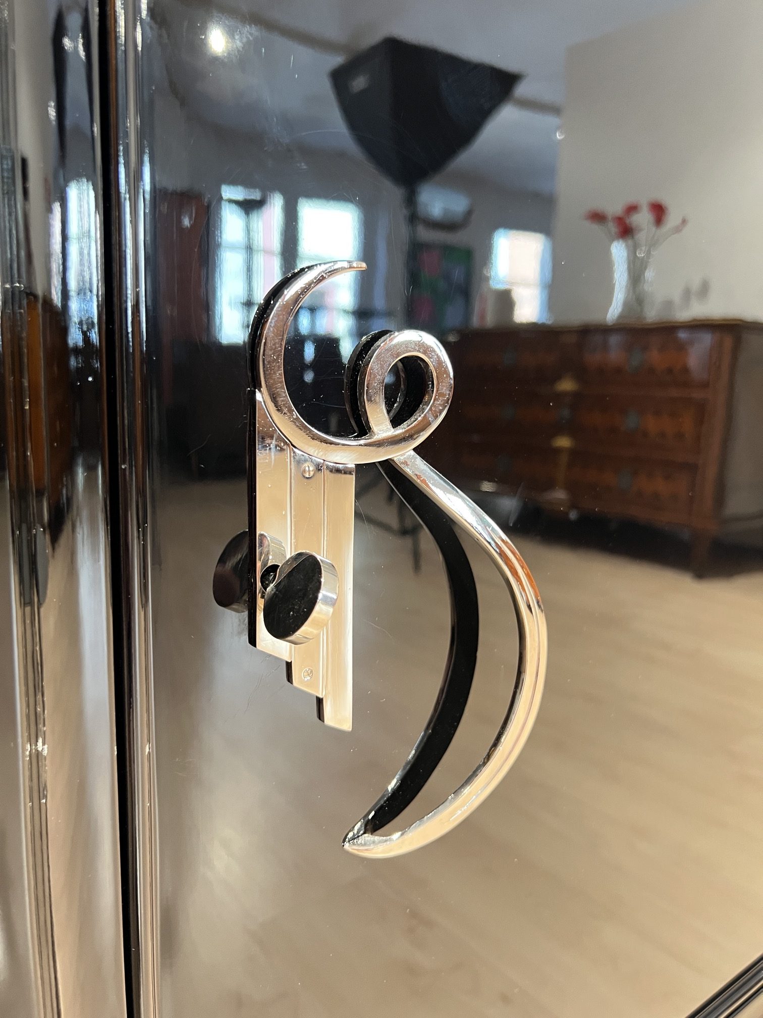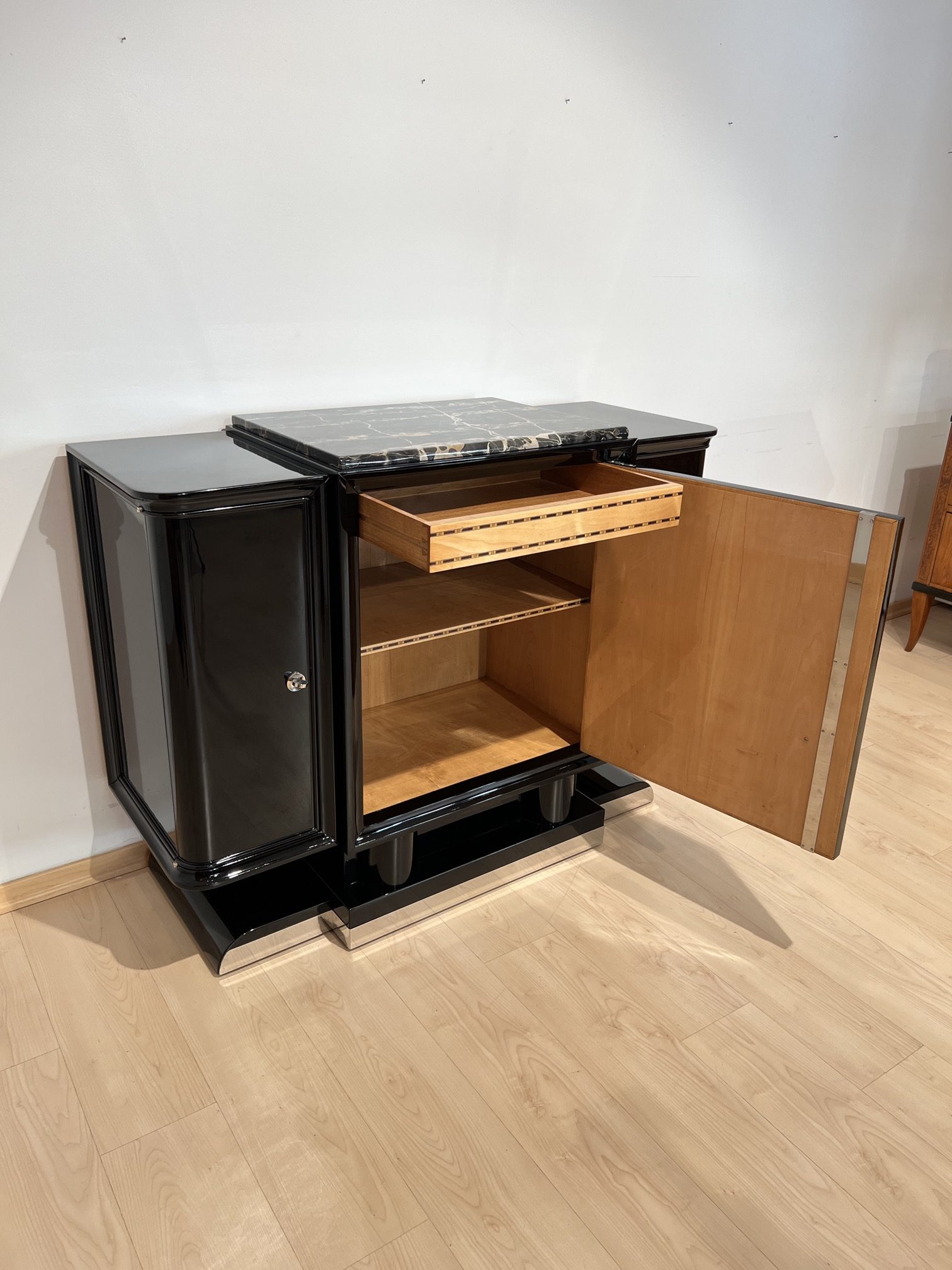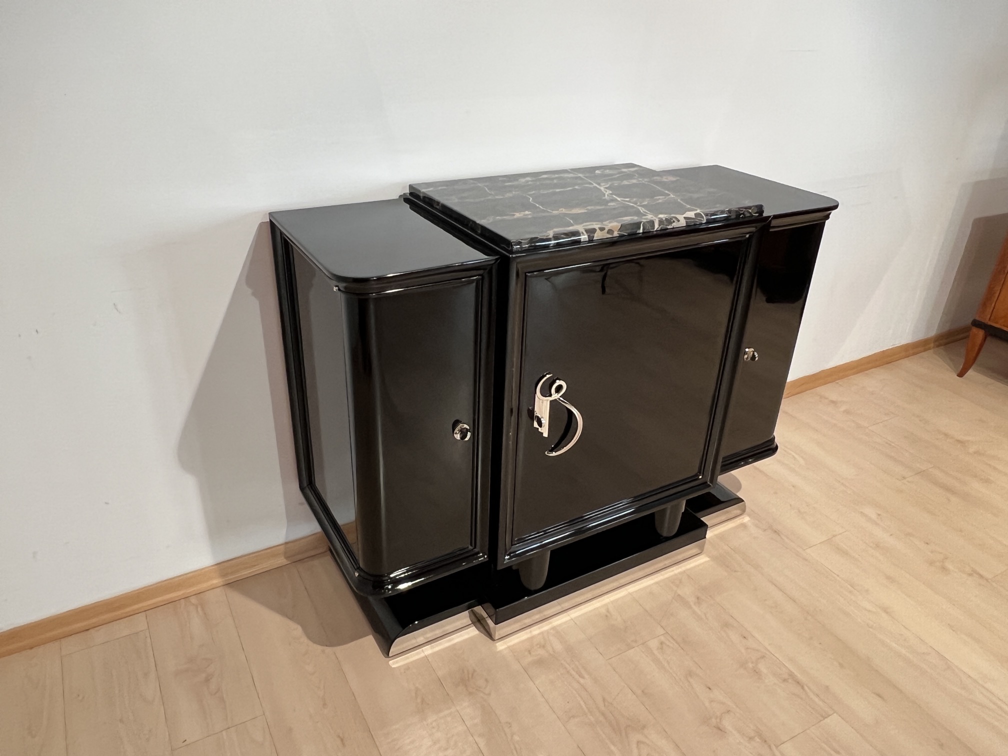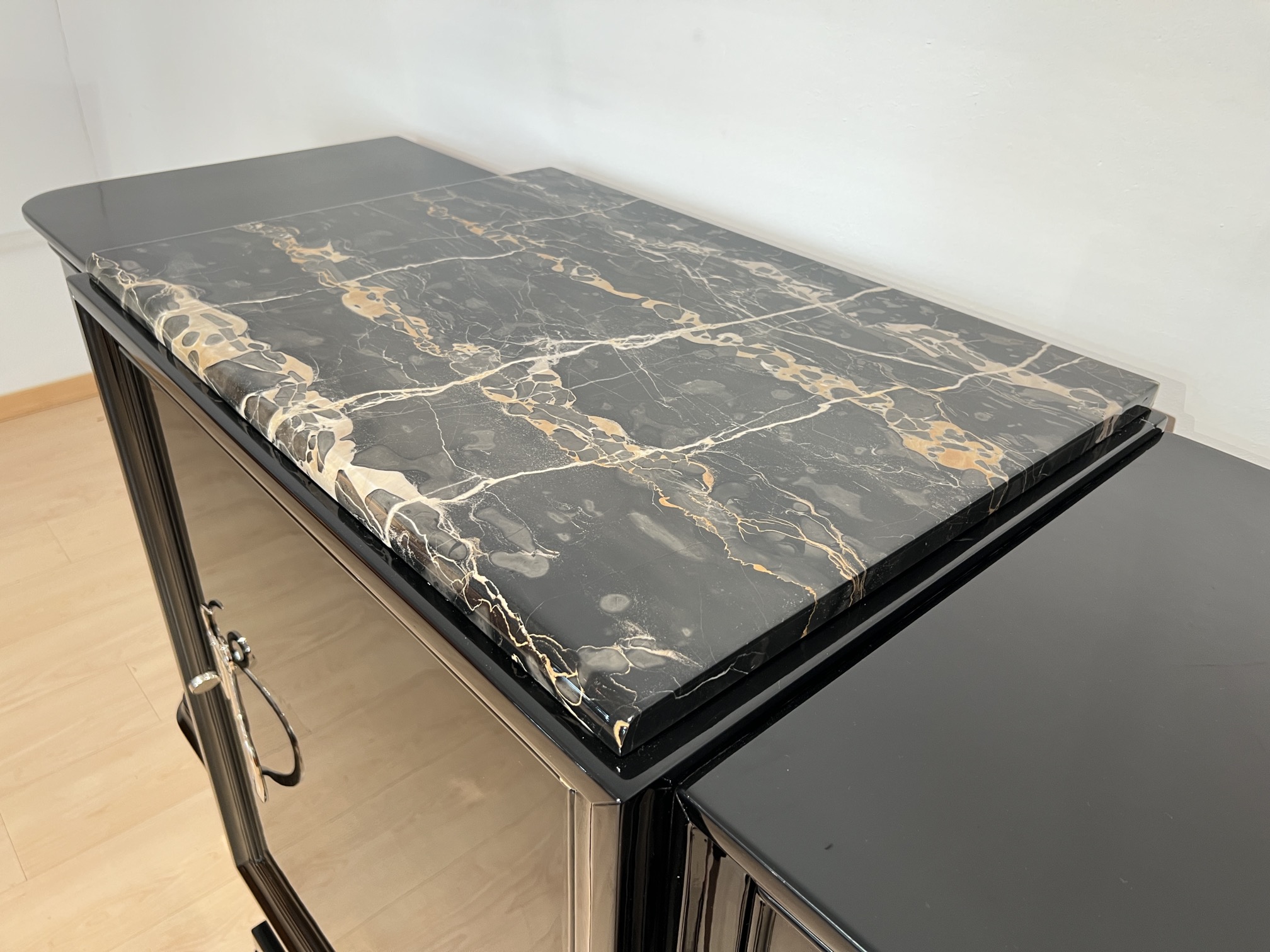 • Originale graue Marmorplatte, poliert. Originaler, neu vernickelter Griff. Hohe polierte Metallblende am Fuß.