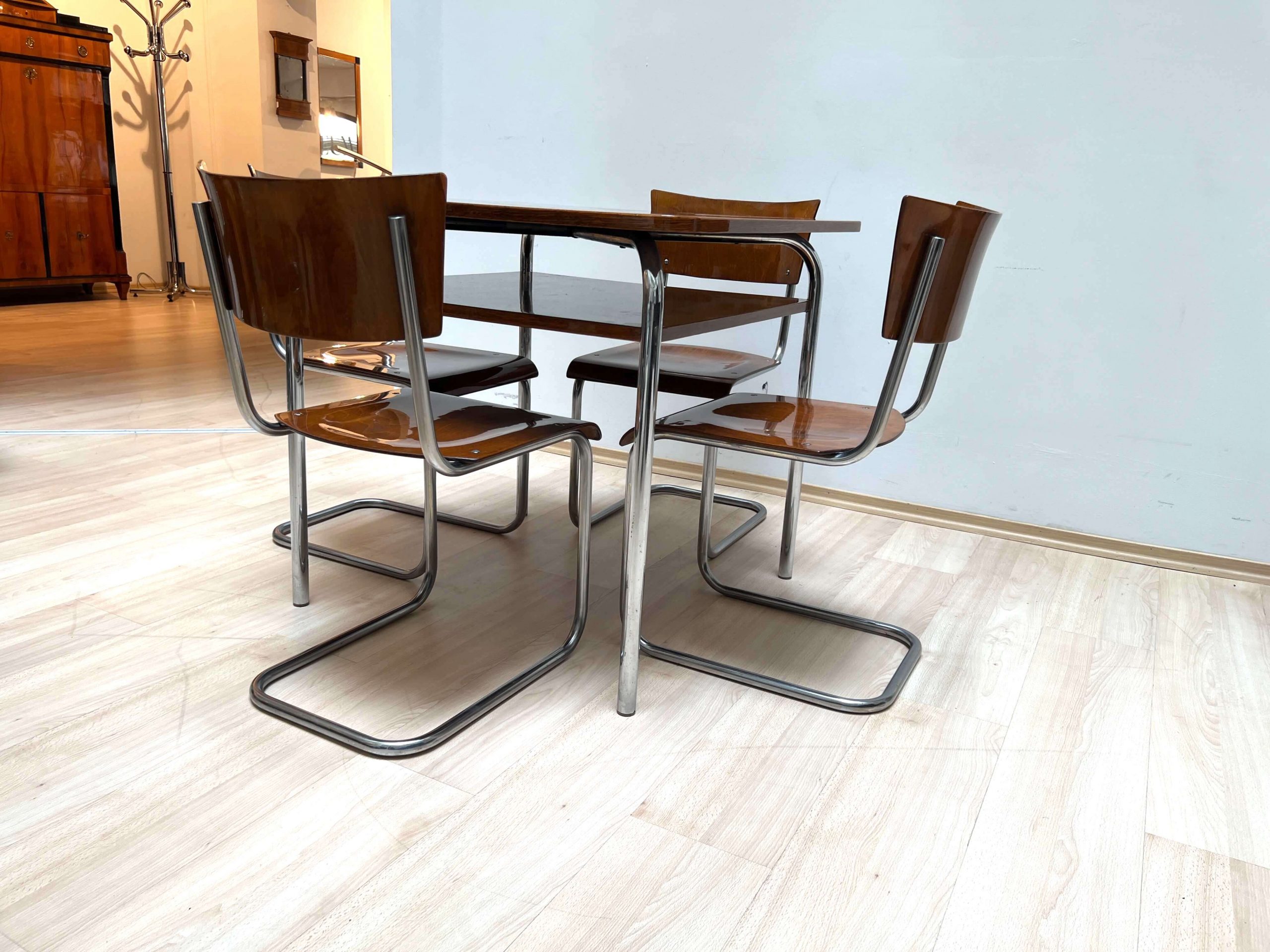 Restaurierte Bauhaus-Sitzgruppe aus Stahlrohr und Holz, bestehend aus 1 rechteckigen Tisch und 4 Freischwinger-Stühlen (Modell S43).