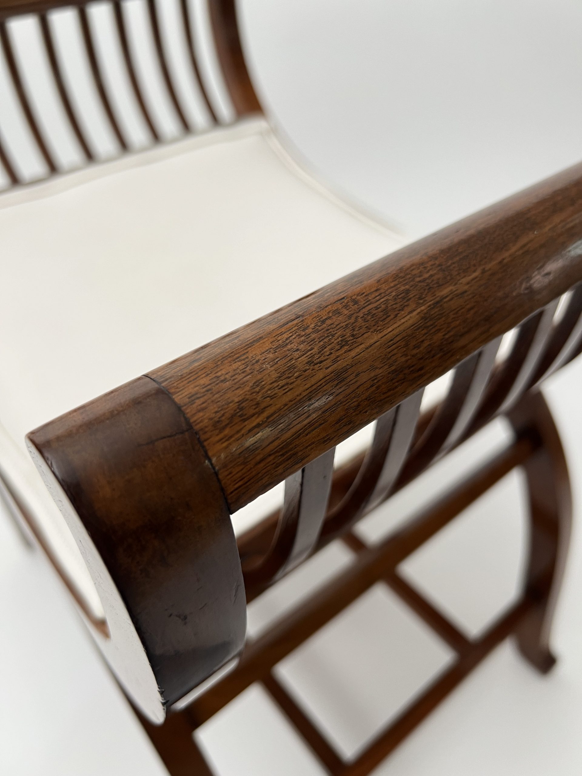 • Nussbaum und Eiche Massivholz, gebogte Lehnen mit Zwischenstäben.