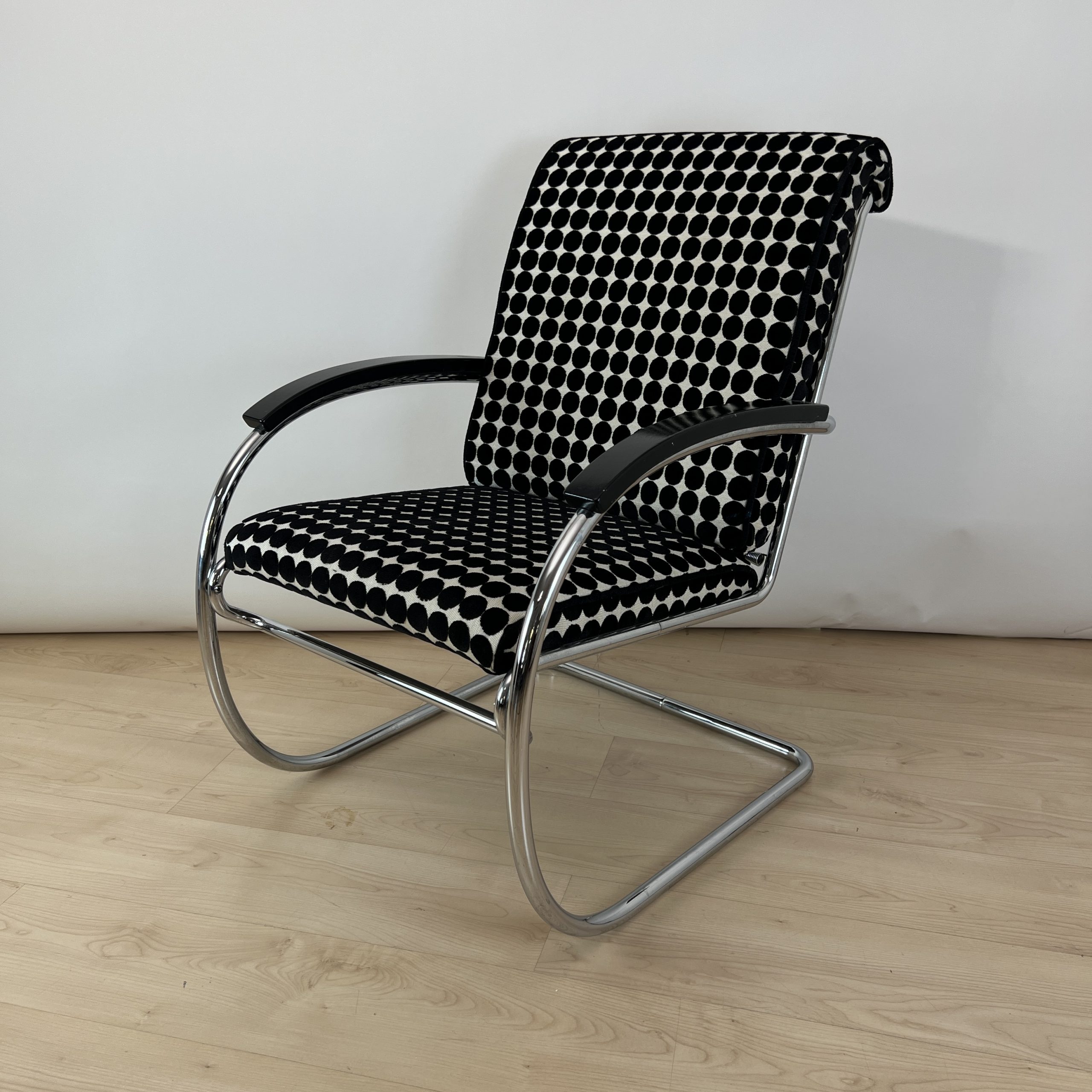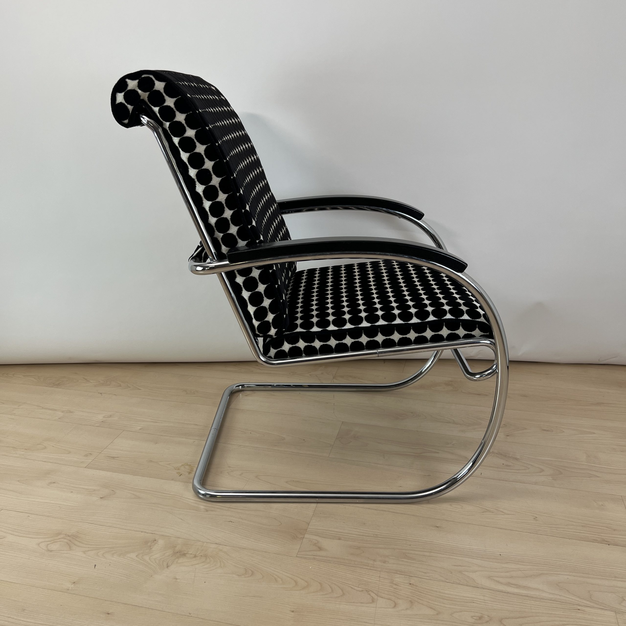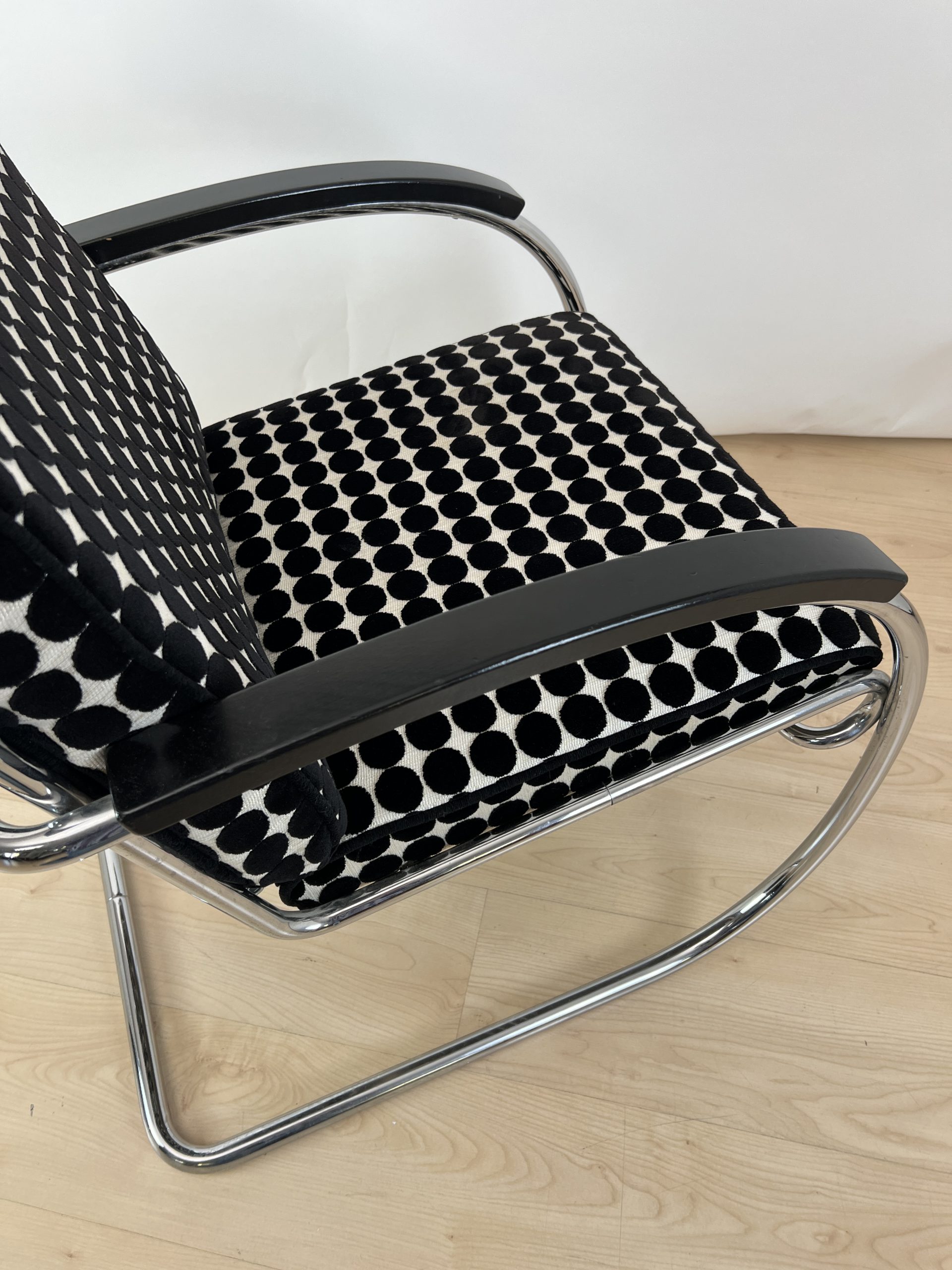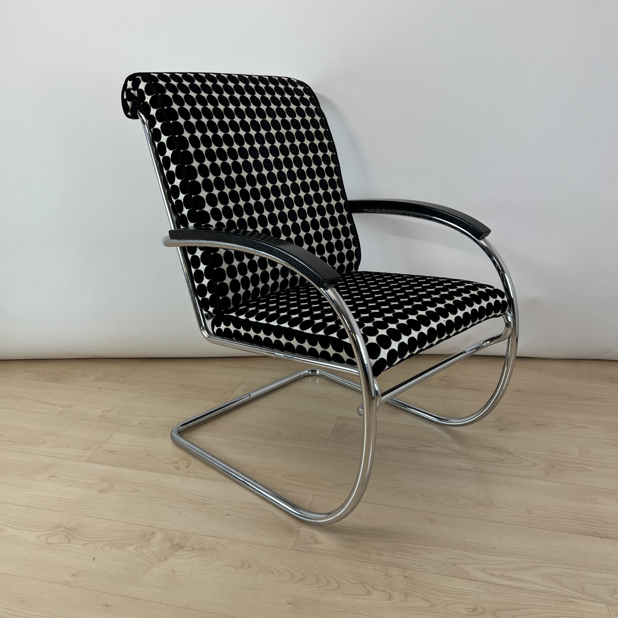 • Neu gepolstert mit schwarz weiß gepunktetem Samtstoff von JAB.