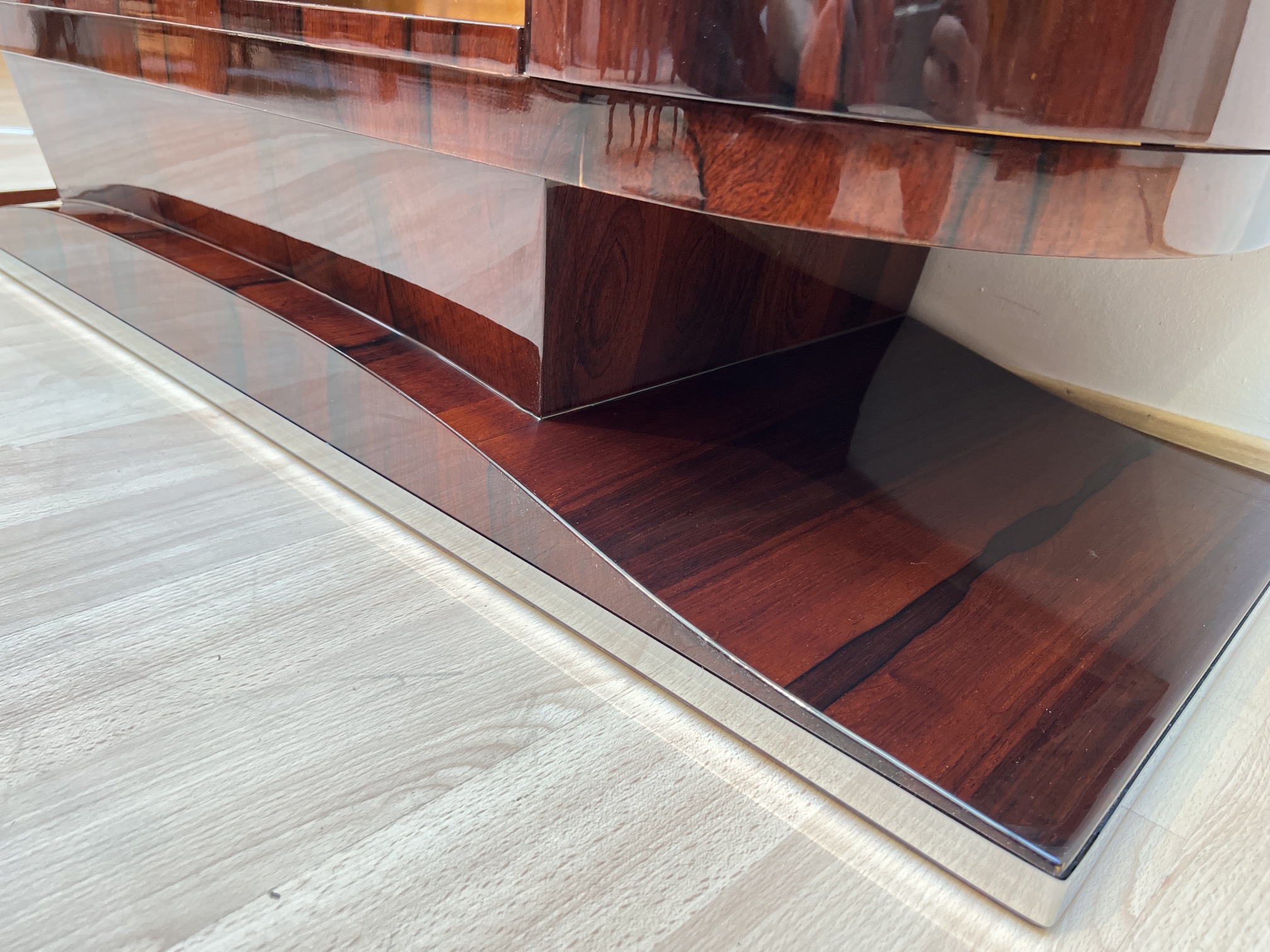- Elegant geschwungener Fuß, in Palisander furniert und unten abschließender polierter Edelstahl Zierleiste.
