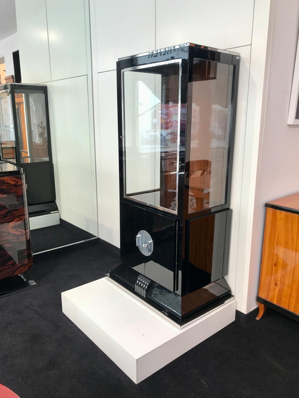 AD-SV-144 Art Deco Vitrine, Schwarzer Klavierlack und Chrom, Frankreich um 1930
