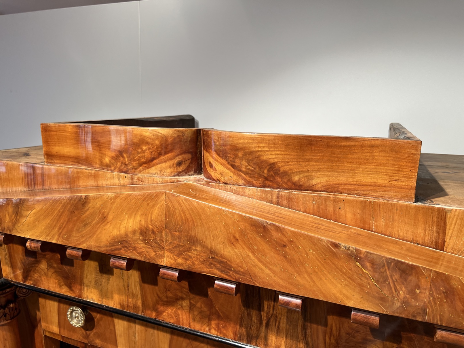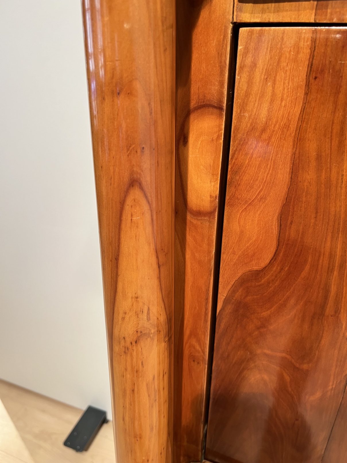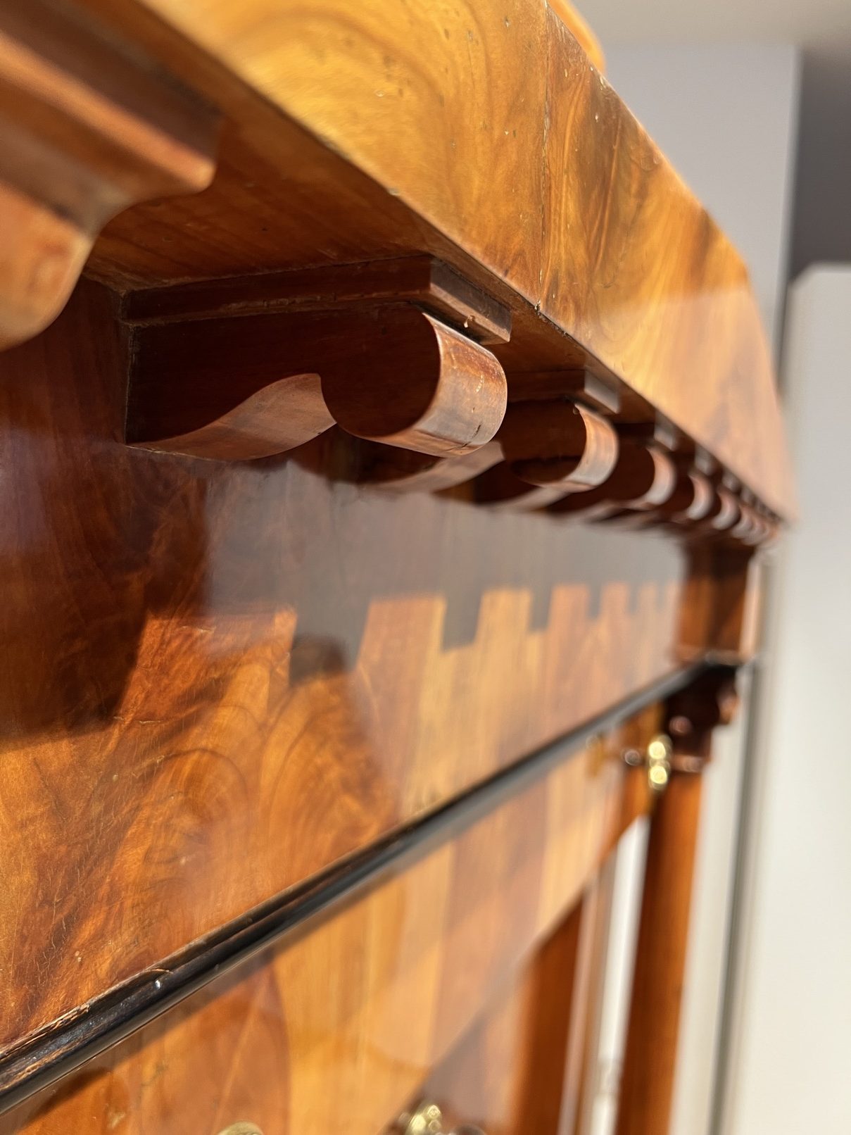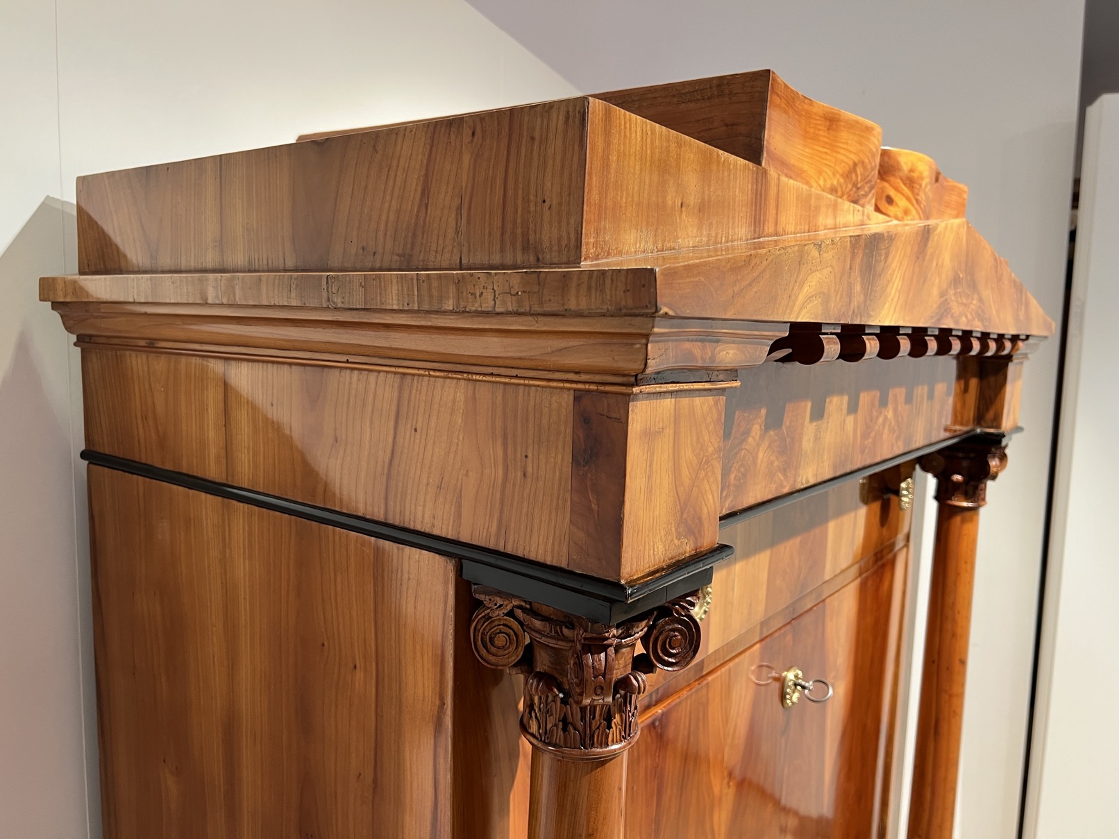 - Kirschbaum massive freistehende Vollsäulen mit geschnitzten korinthisch Kapitellen. Vorstehender Sockelschublade Karniesschwung und Schmetterlingsfurnier.