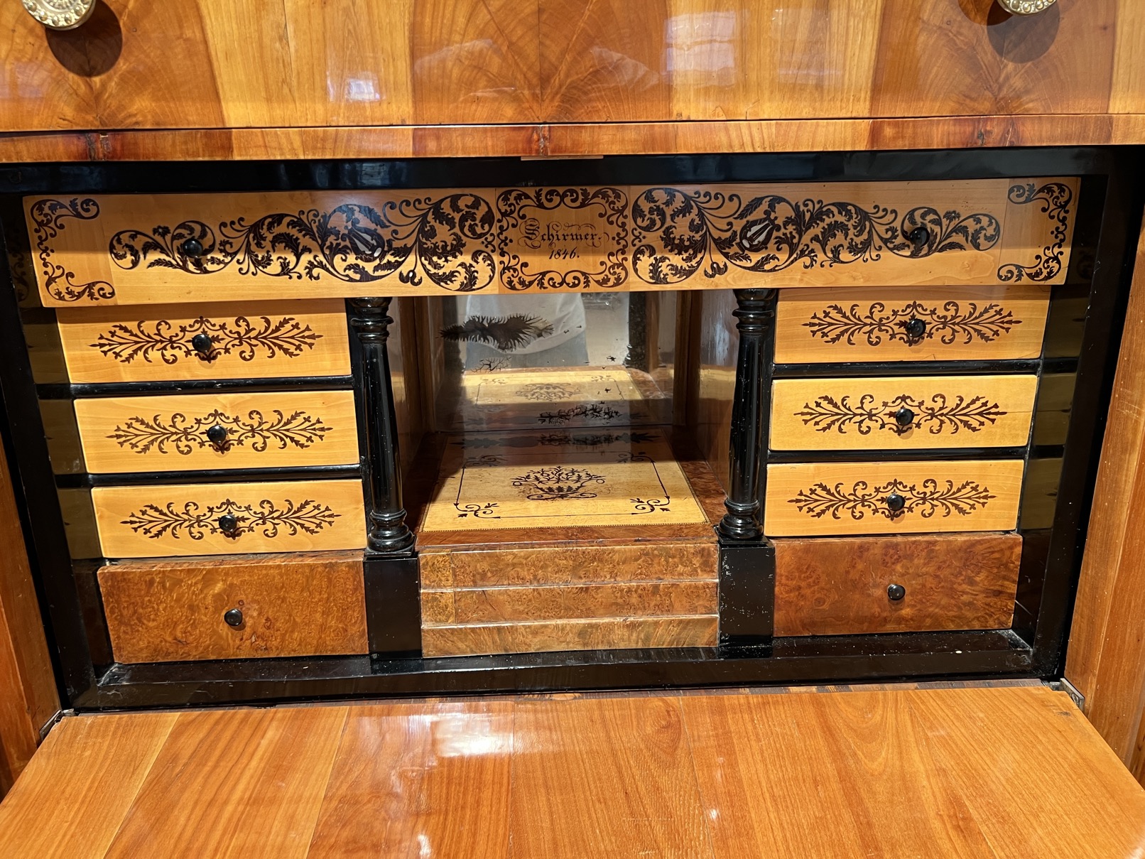- Später wohl von neuem Besitzer (Schirmer 1846) etwas später neu datiert und mit Emblem versehen. (Möbel wohl früher um 1830 gebaut). Sichtbar durch dunkleres Ahorn Holz auf der oberen inneren Schublade.