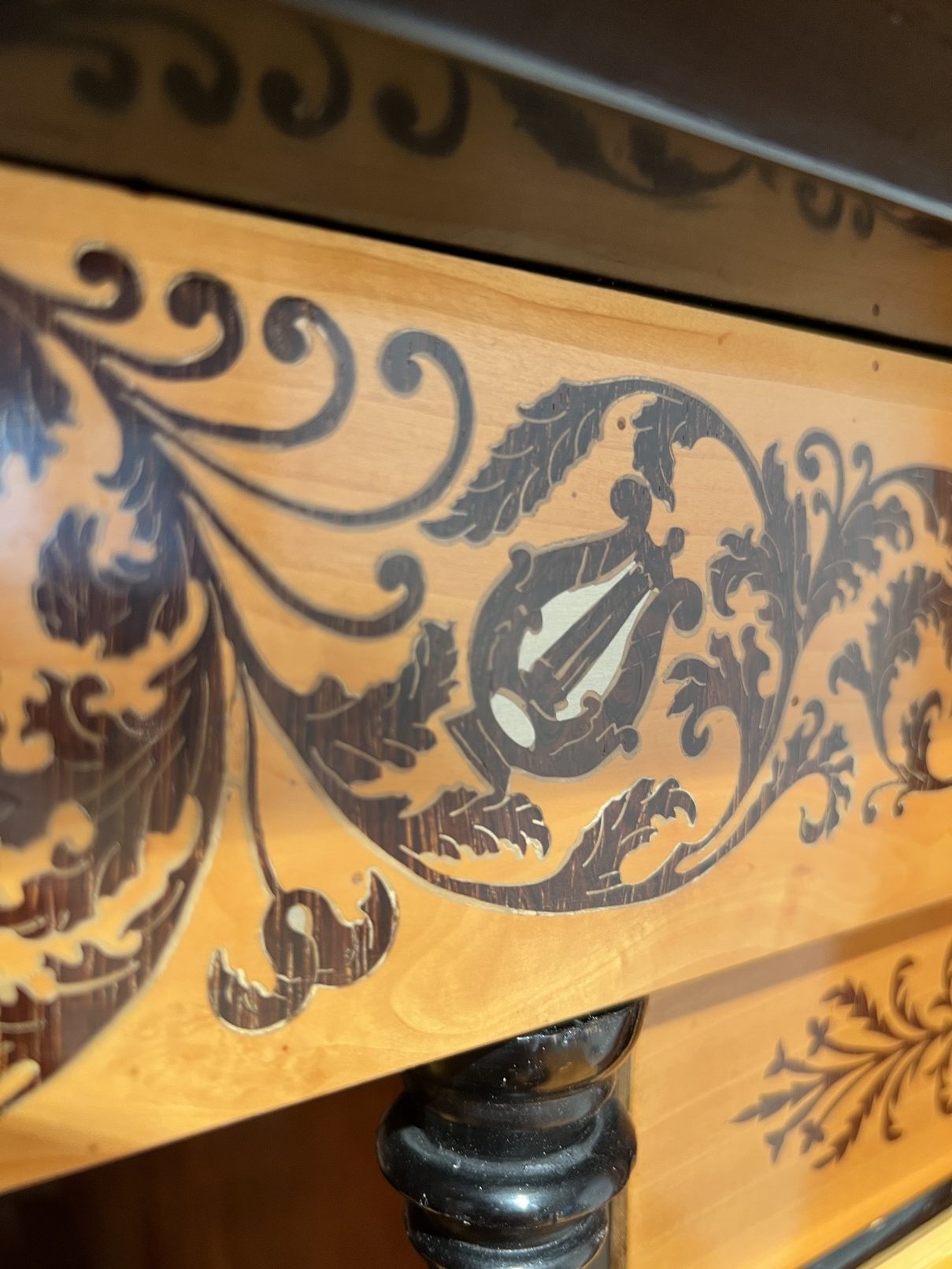 - Inneneinrichtung in Ahornholz mit aufwändigen Intarsien in Ebenholz (wohl Mooreiche) und Zinneinlagen auf Schüben und Boden. Innenrahmen ebonisiert und 2 eboniserte Vollsäulen um das hinten verspiegelte (Originalglas) Freifach. Sowie ein durchgängiger unterer Schub in Wurzelholz furniert und gestuft.Â