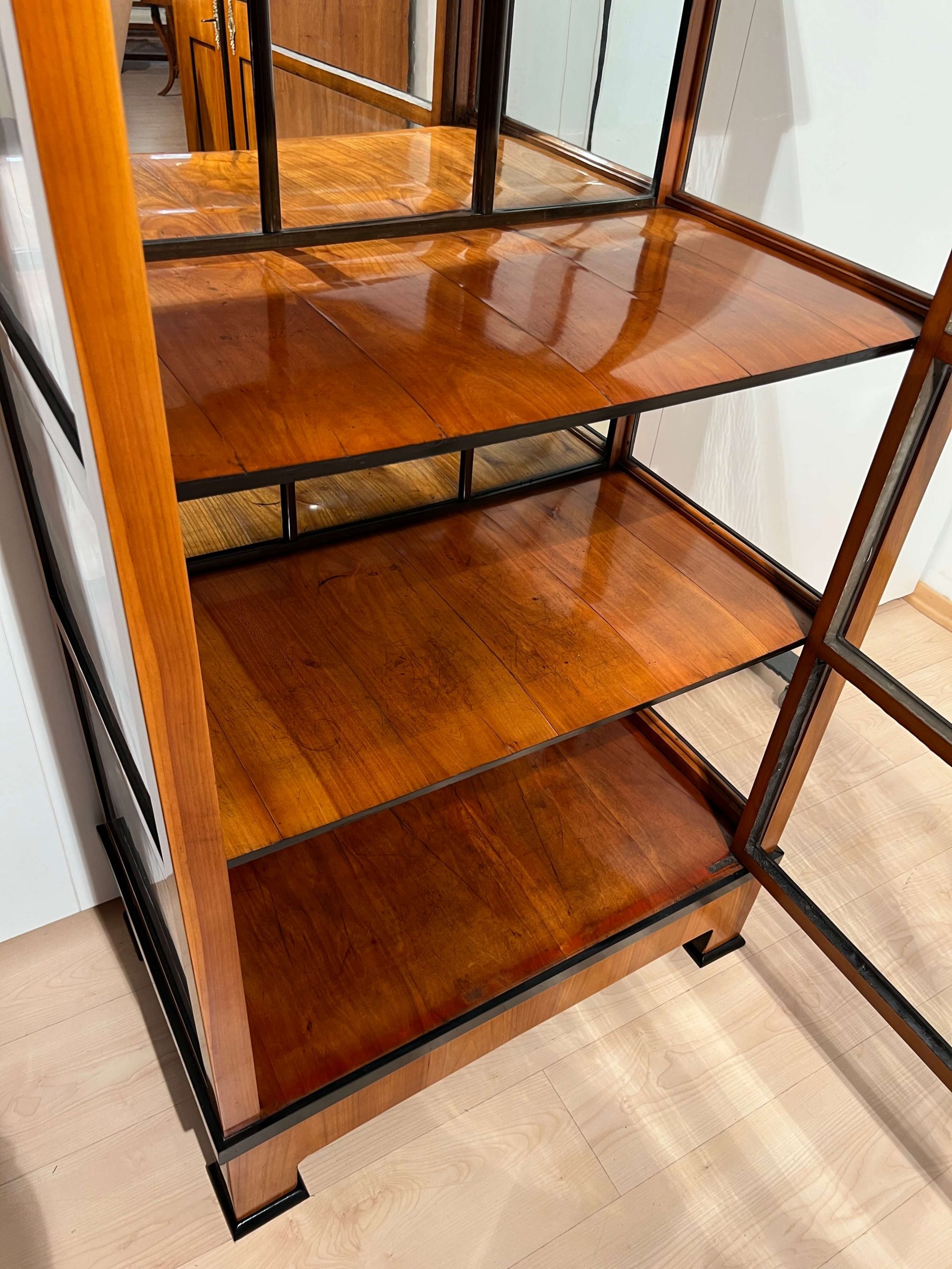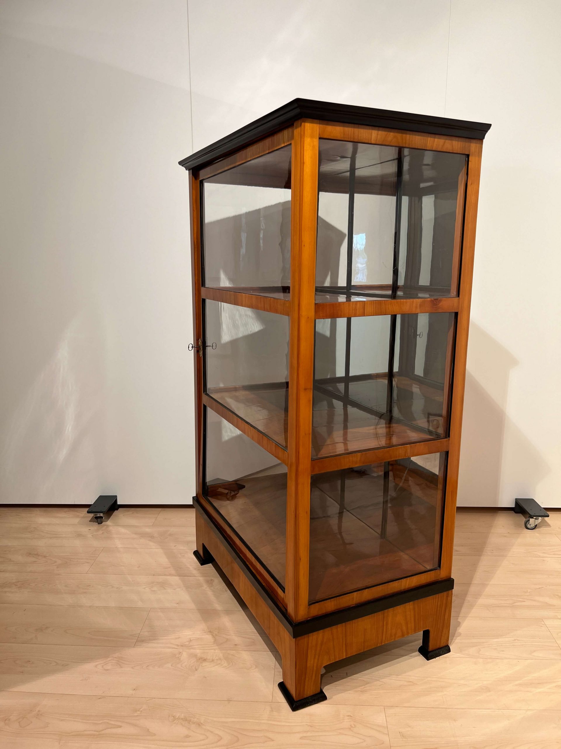 Schlichte dreiseitig verglaste Biedermeier Vitrine in Kirschbaum aus Süddeutschland um 1820